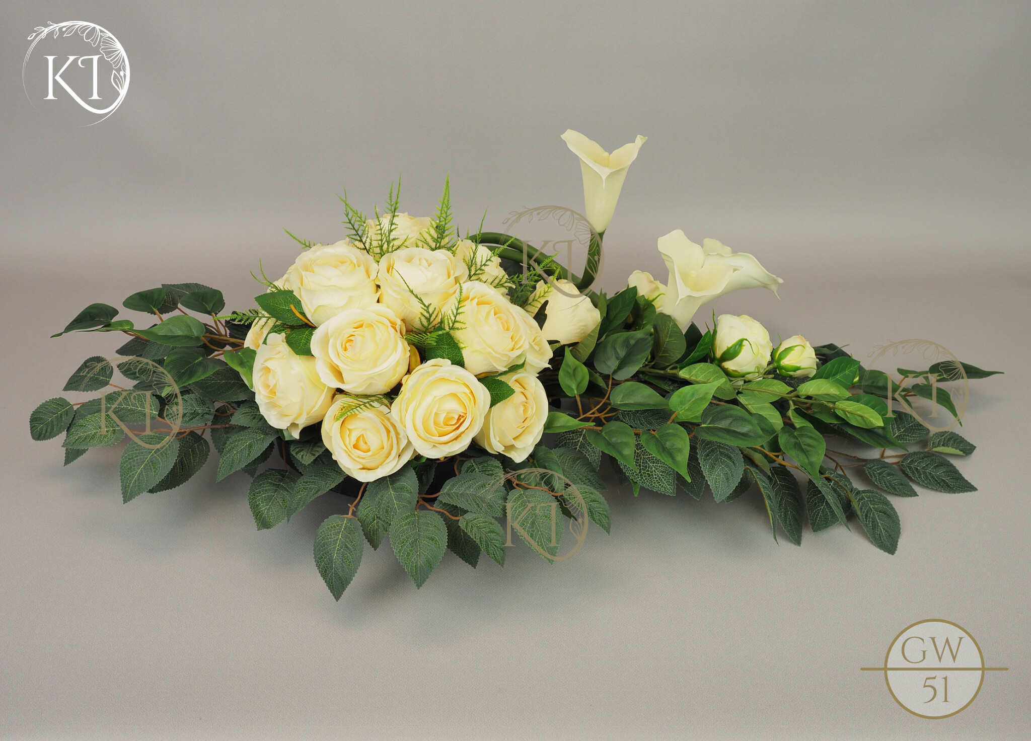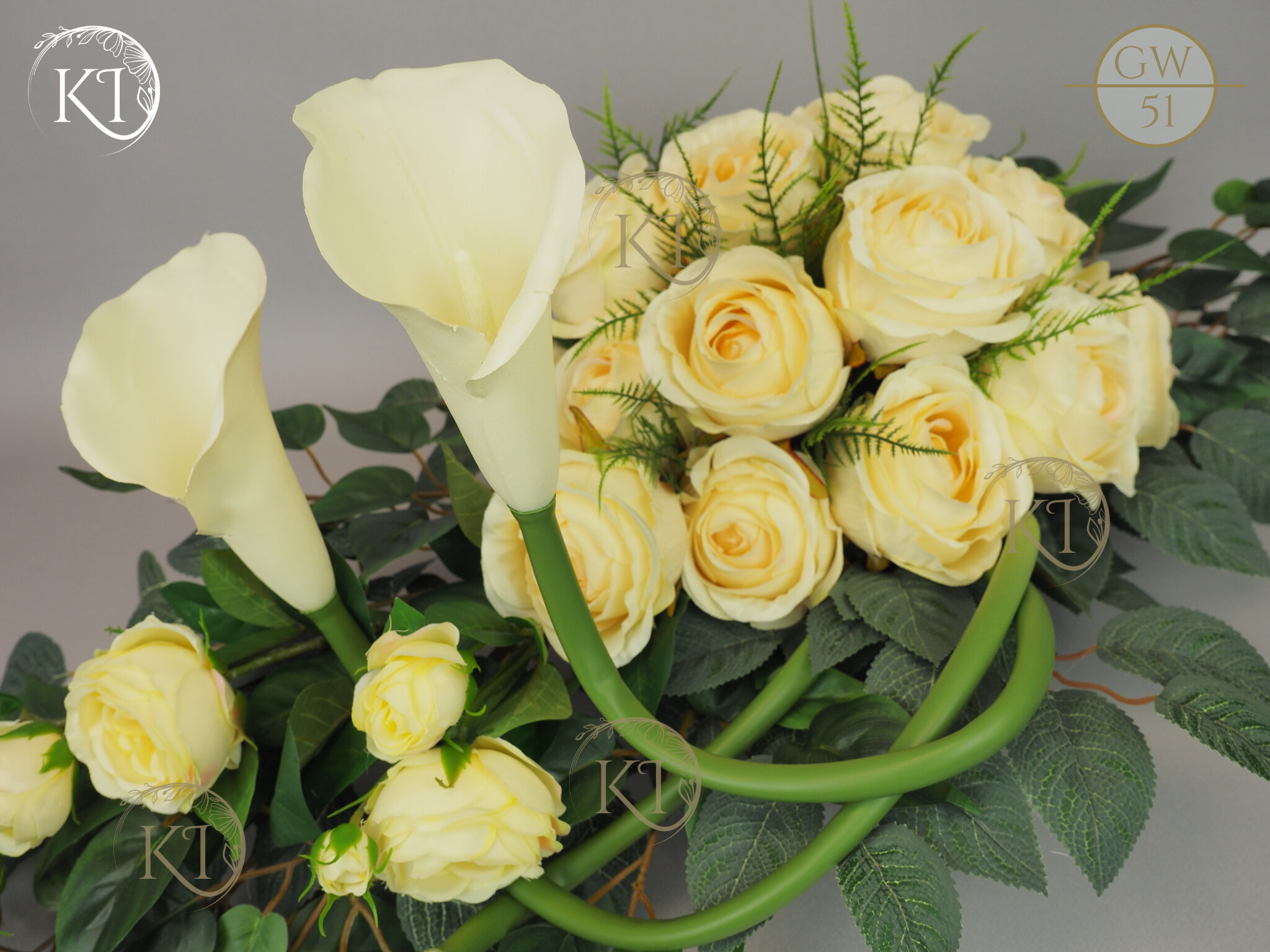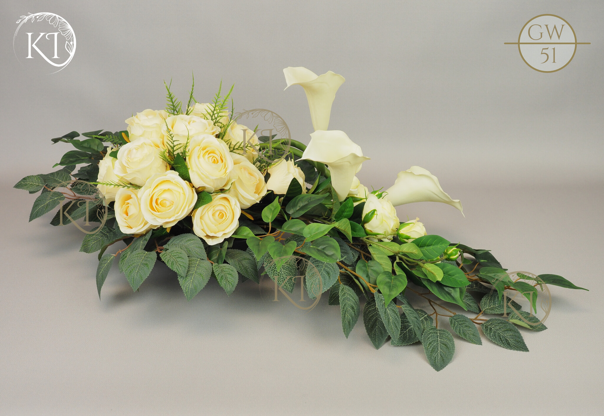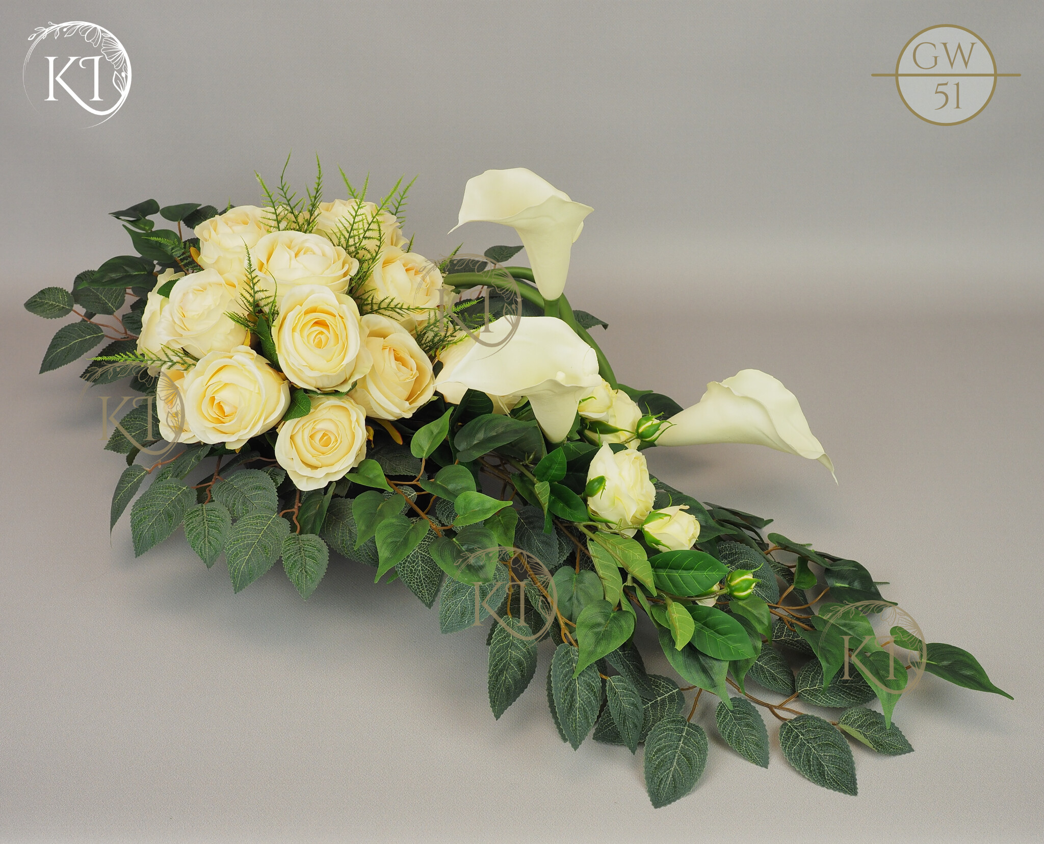 Tradycyjna wiązanka, całoroczna dekoracja nagrobna, w formie wiązanki 3D, czyli z każdej strony atrakcyjna, w obciążonej plastikowej podstawie, wykonana z gałązek i kwiatów sztucznych wysokiej jakości, gumowych Kalii i satynowych Róż, co nadaje jej trwałości i odporności.