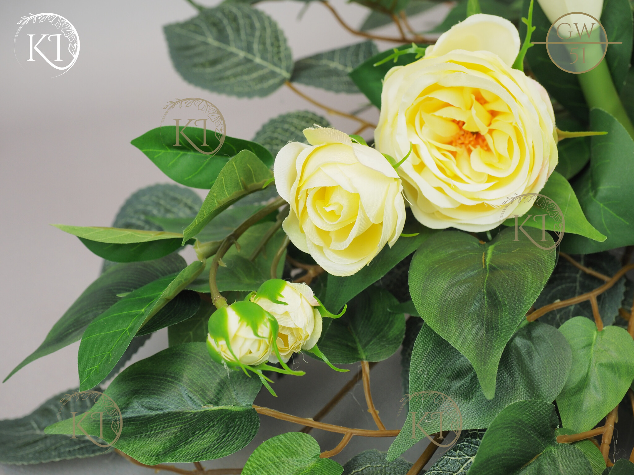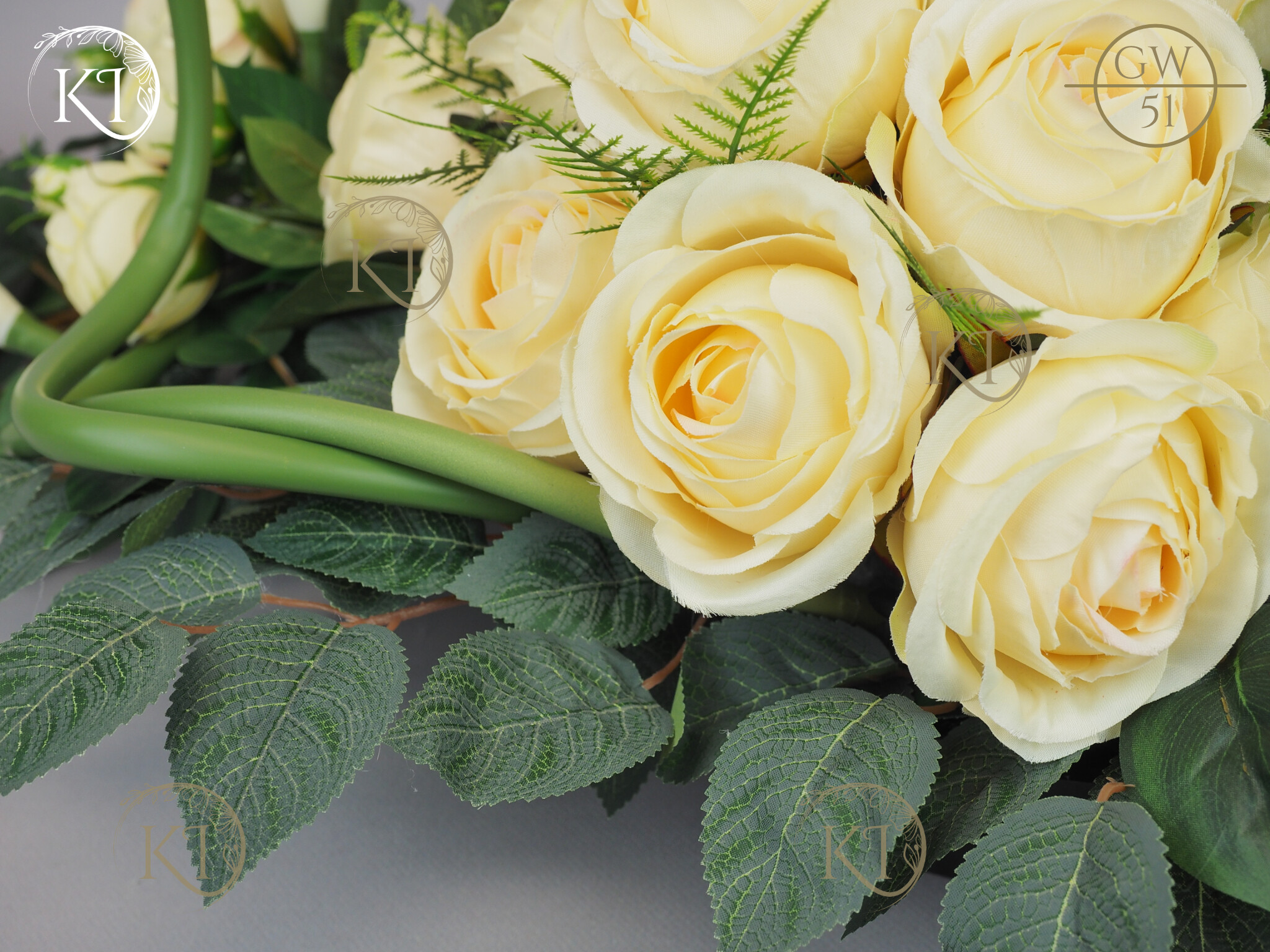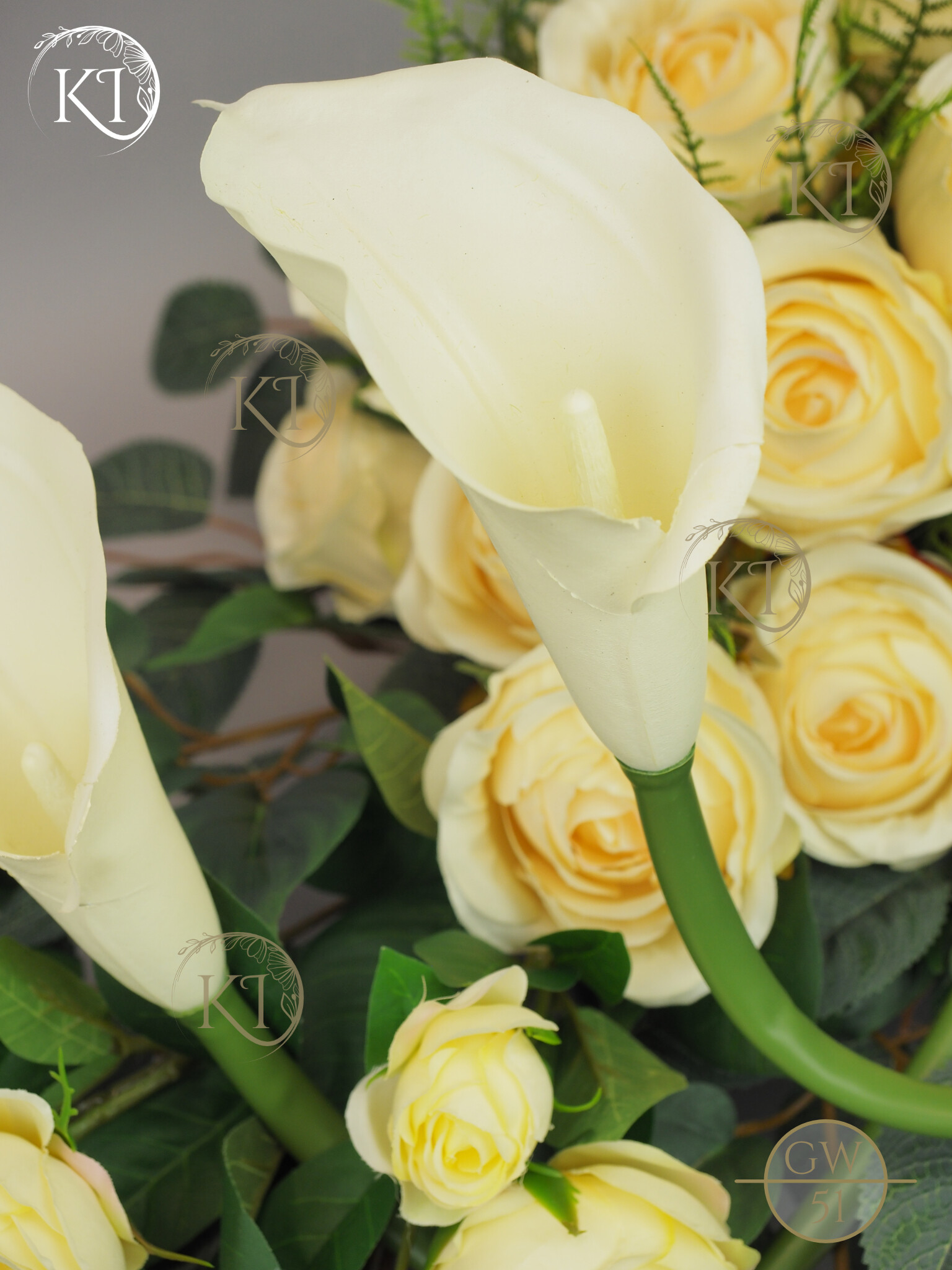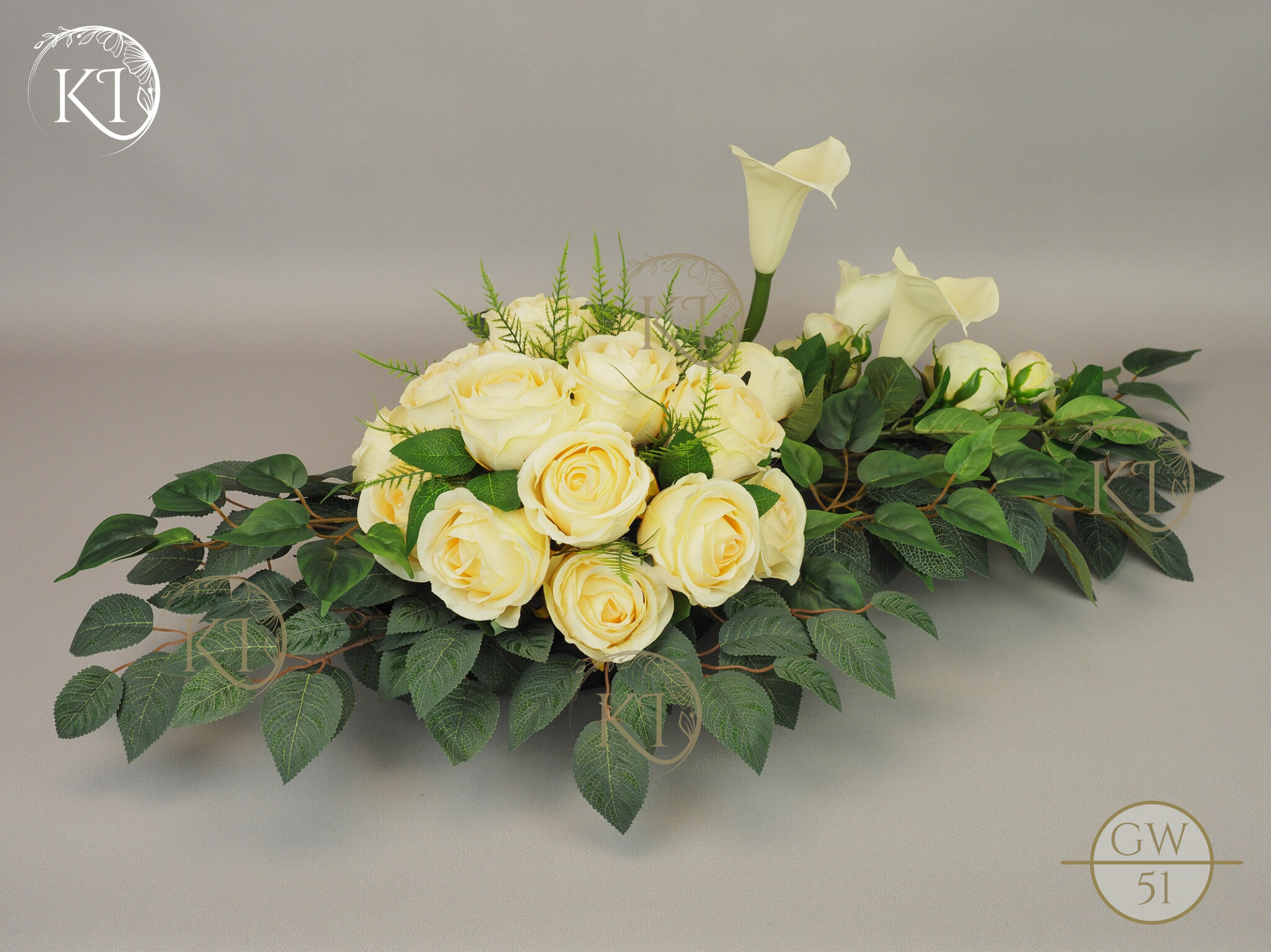 Tradycyjna wiązanka, całoroczna dekoracja nagrobna, w formie wiązanki 3D, czyli z każdej strony atrakcyjna, w obciążonej plastikowej podstawie, wykonana z gałązek i kwiatów sztucznych wysokiej jakości, gumowych Kalii i satynowych Róż, co nadaje jej trwałości i odporności.