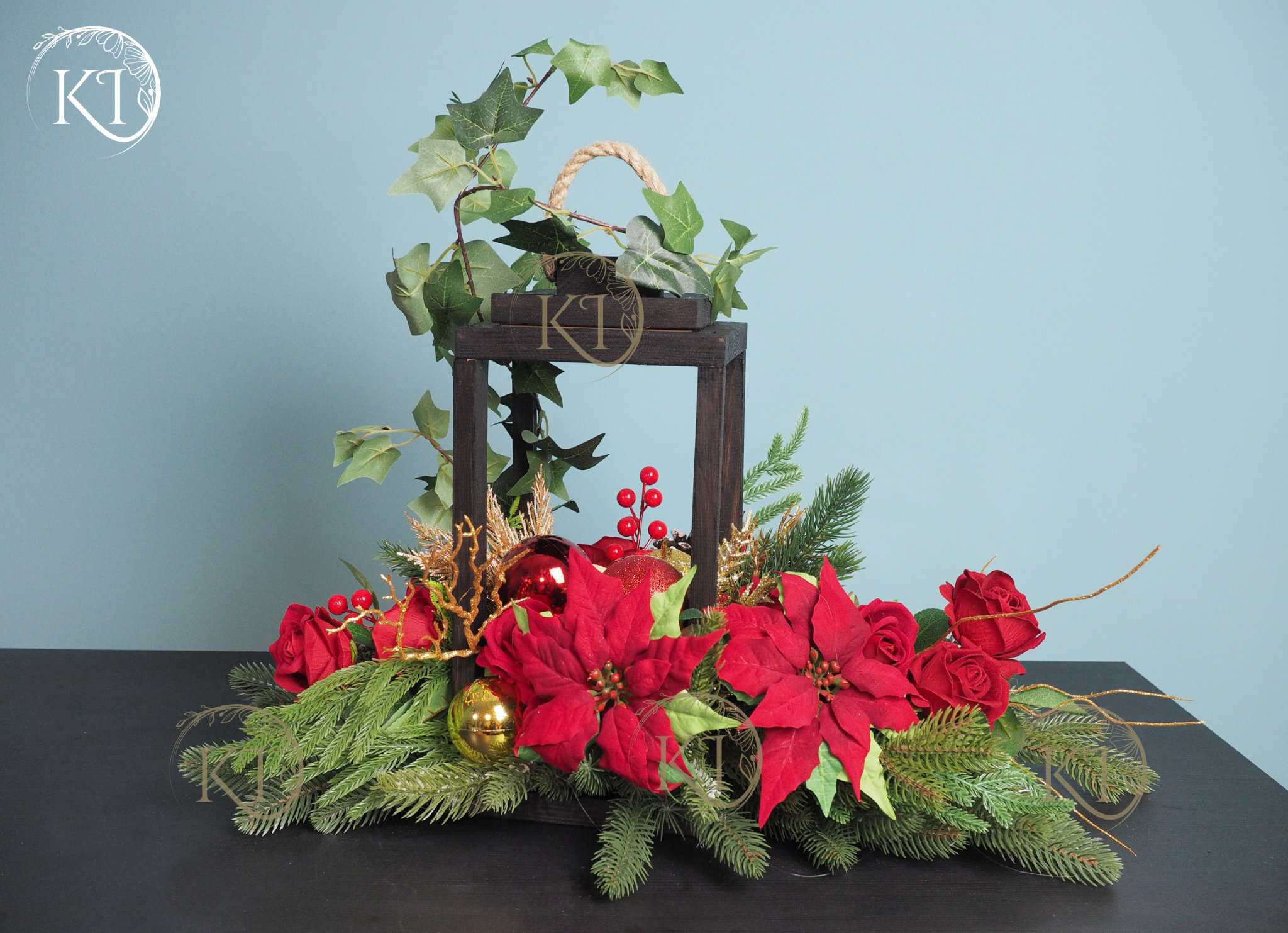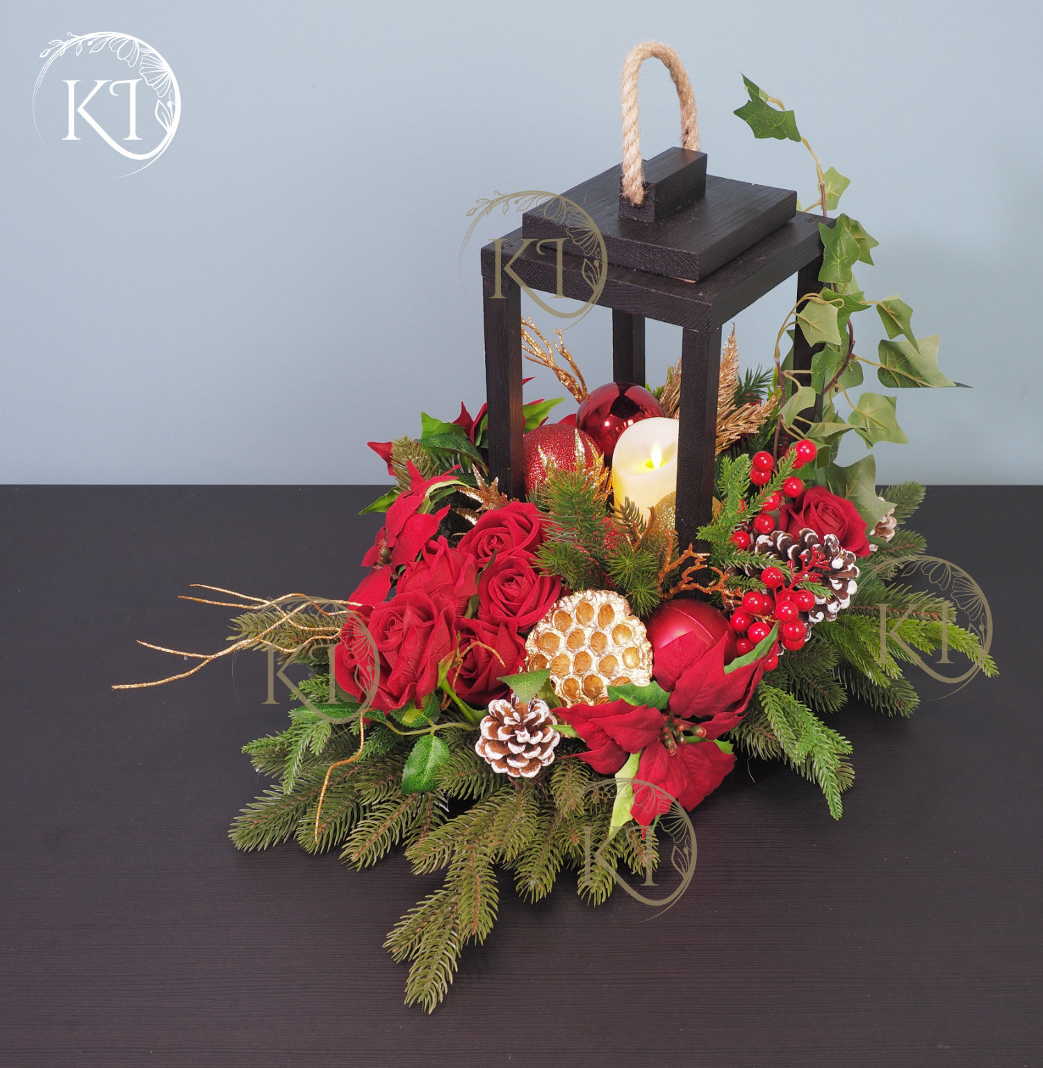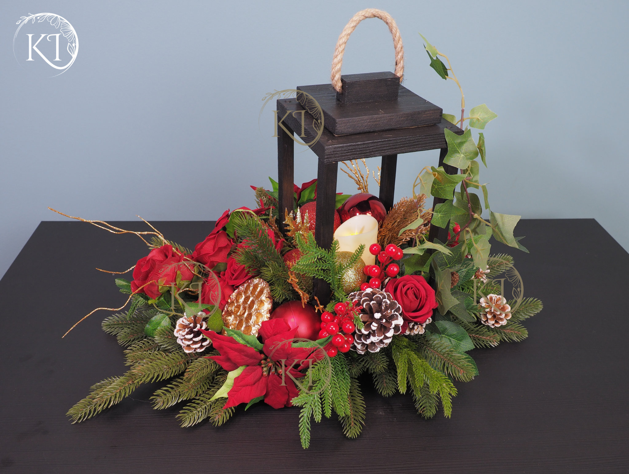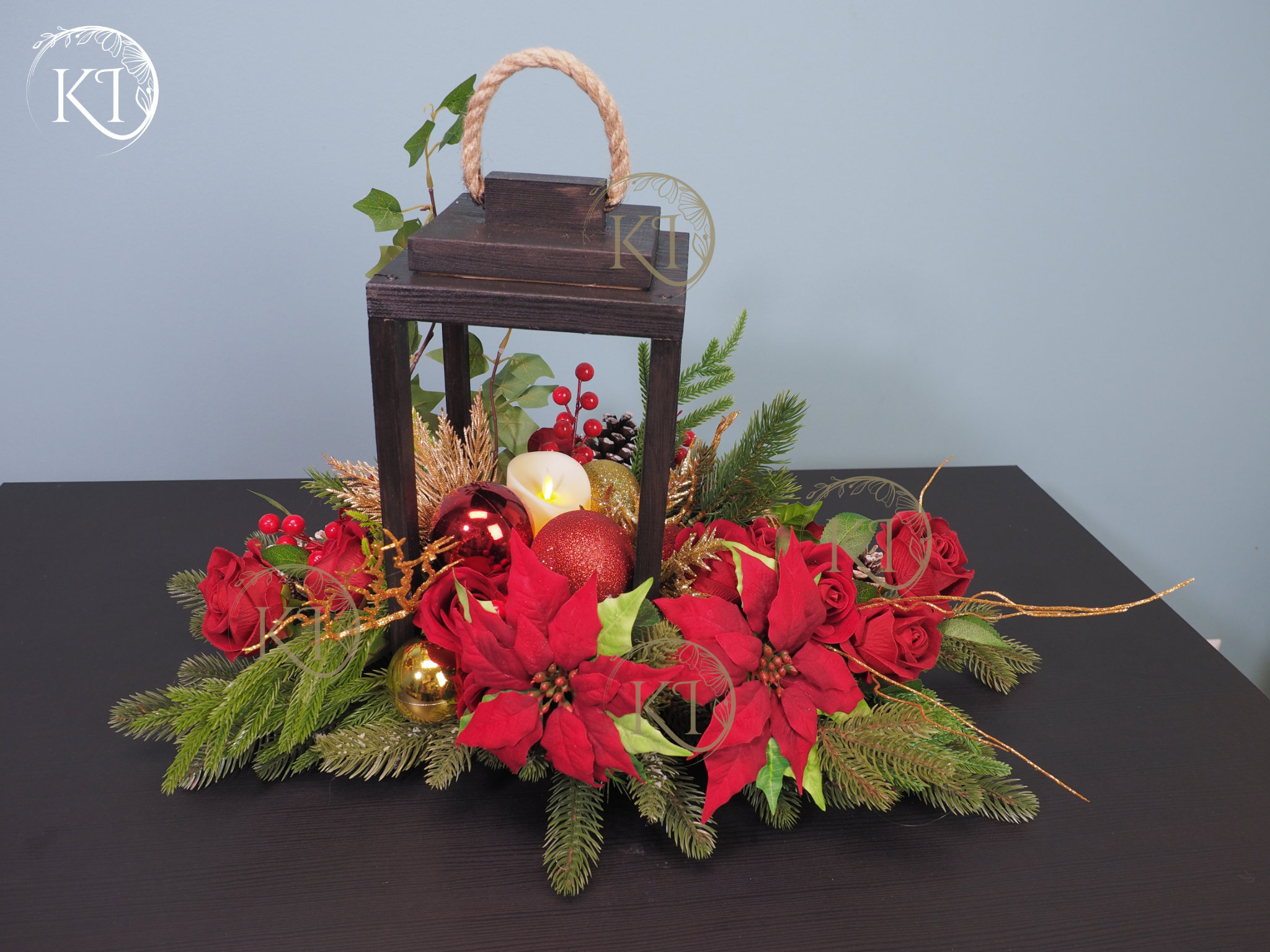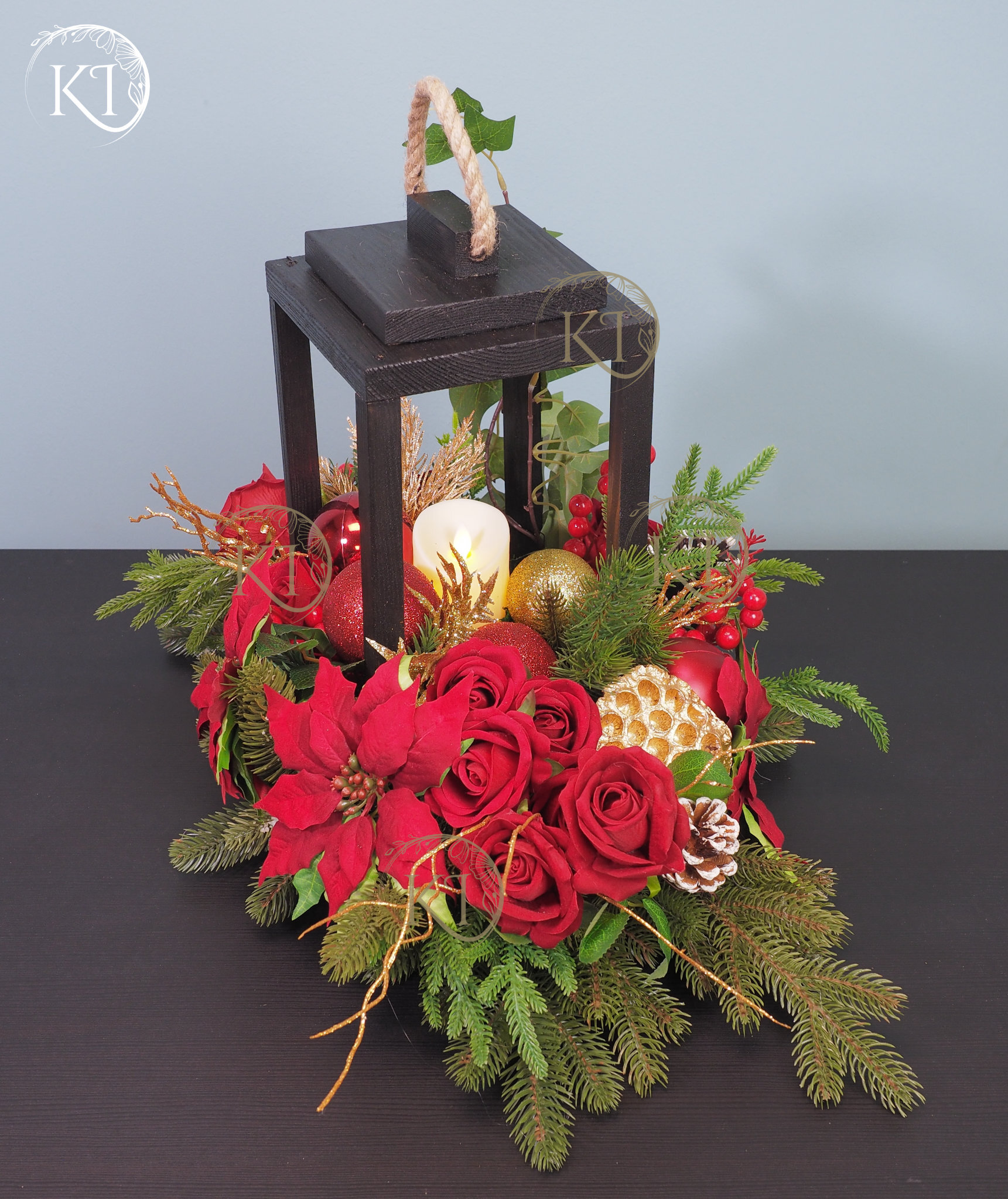 Niepowtarzalna, z ogromną dbałością o detale, ręcznie wykonana kompozycja ze sztucznych kwiatów wysokiej jakości, w kolorach czerwieni i złota, w drewnianym lampionie, z dodatkiem gwiazdy betlejemskiej , w centrum kompozycji świeca LED ( brak baterii w zestawie)