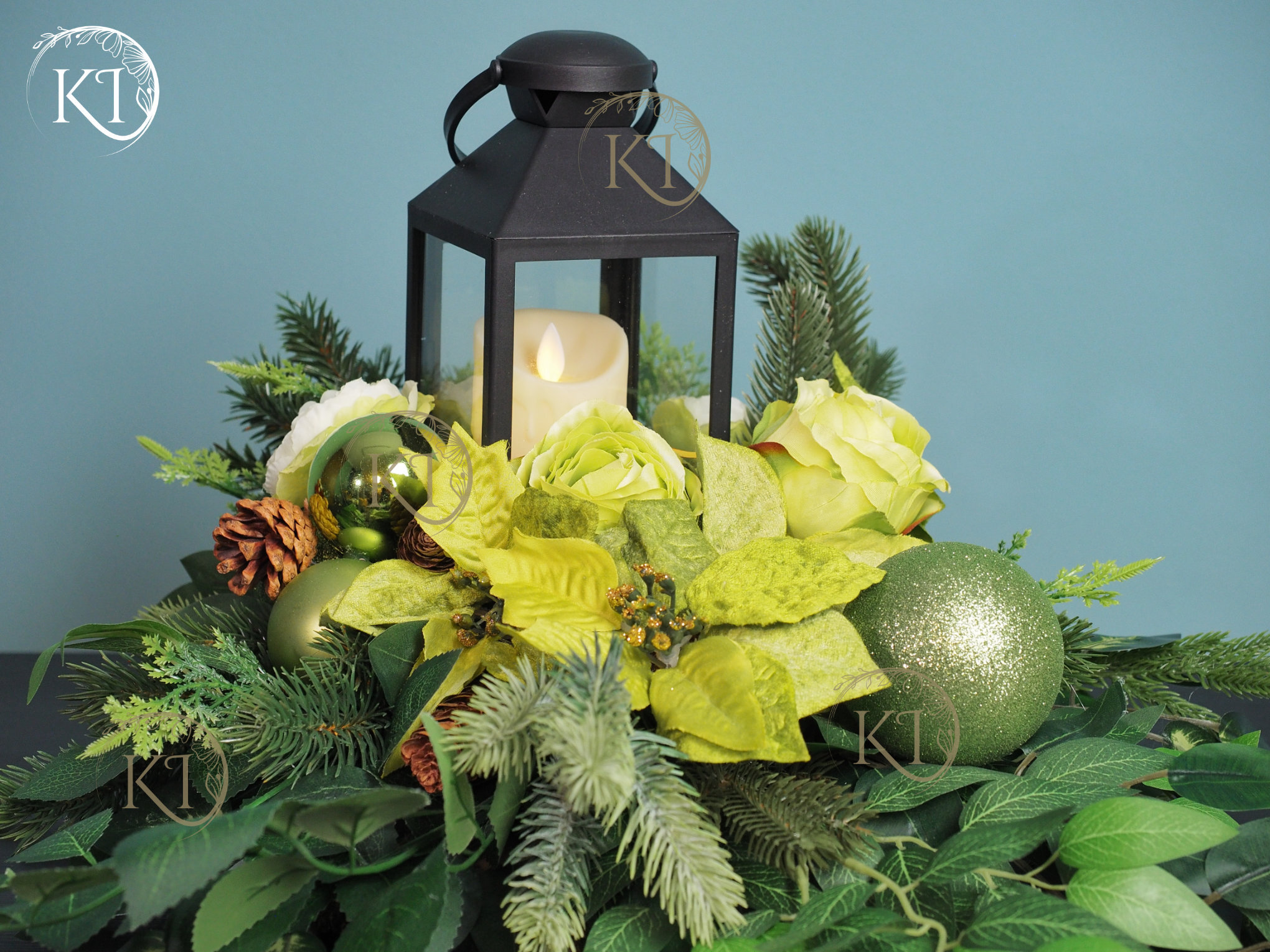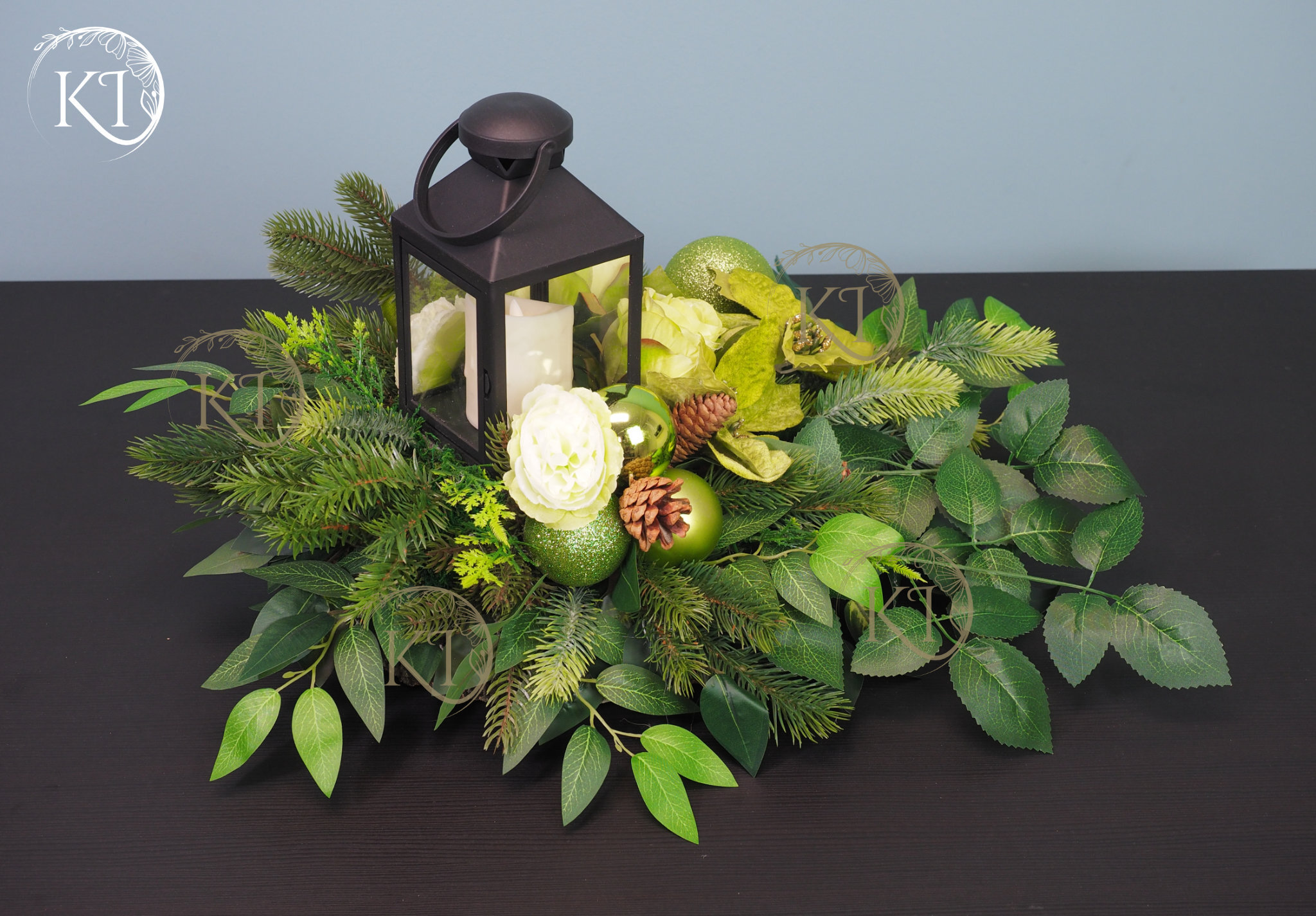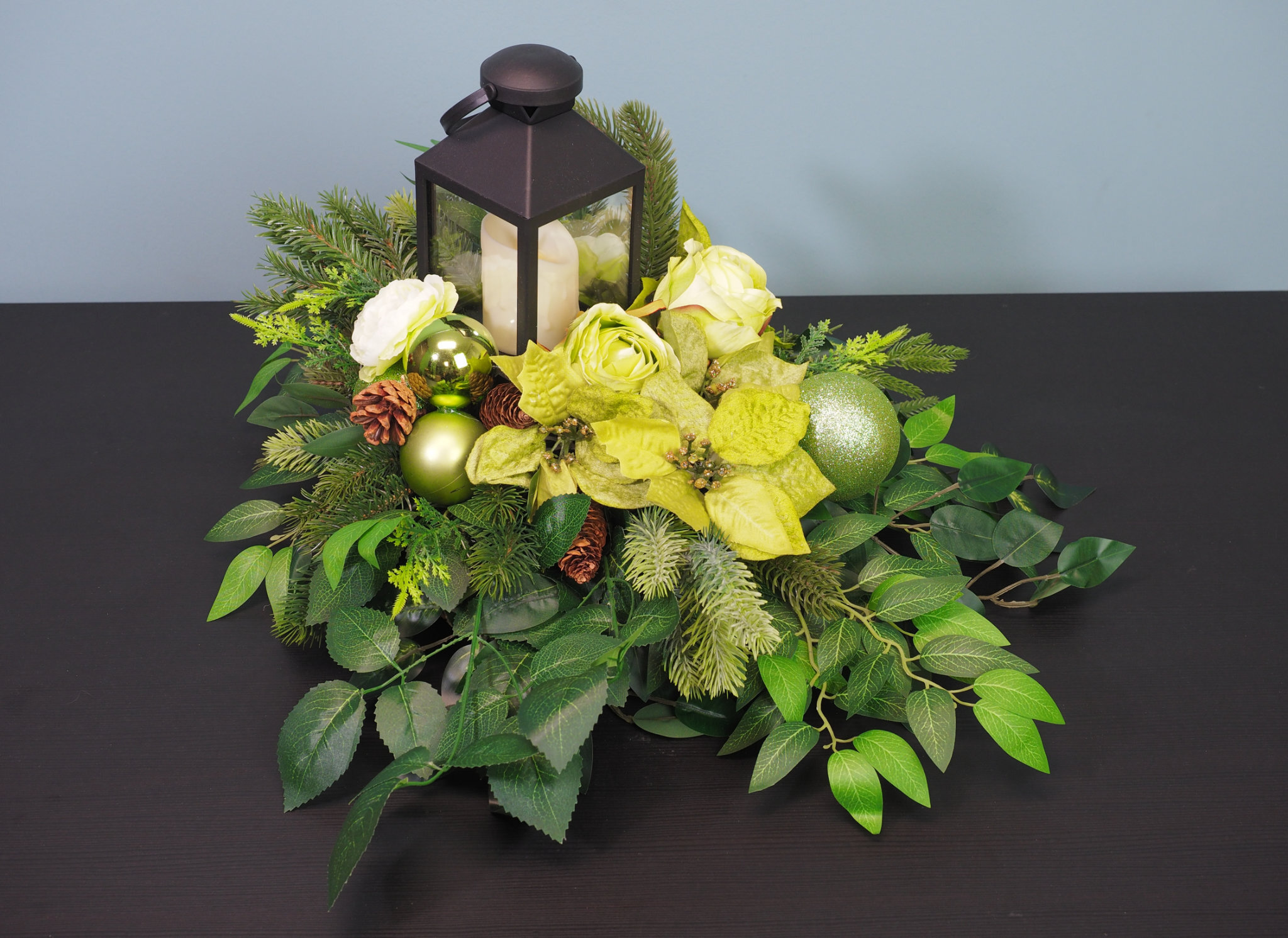 Niepowtarzalna, z ogromną dbałością o detale, ręcznie wykonana kompozycja ze sztucznych kwiatów wysokiej jakości, z przewagą kolorów zielonych, z dodatkiem gwiazdy betlejemskiej, bombek plastikowych, szyszek, na plastrze drewnianym, w centrum kompozycji latarenka z wyjmowaną świecą LED ( brak baterii w zestawie)