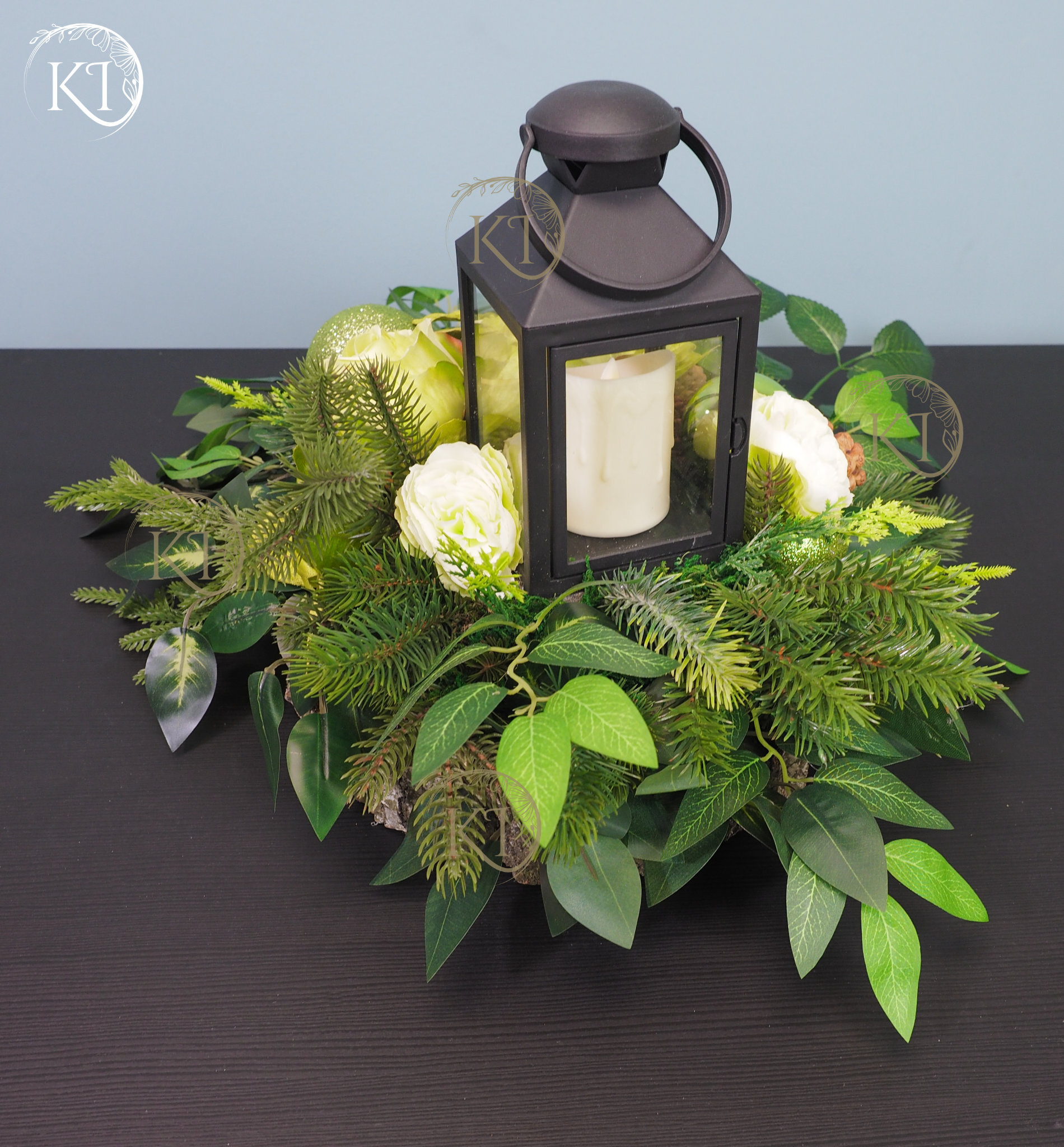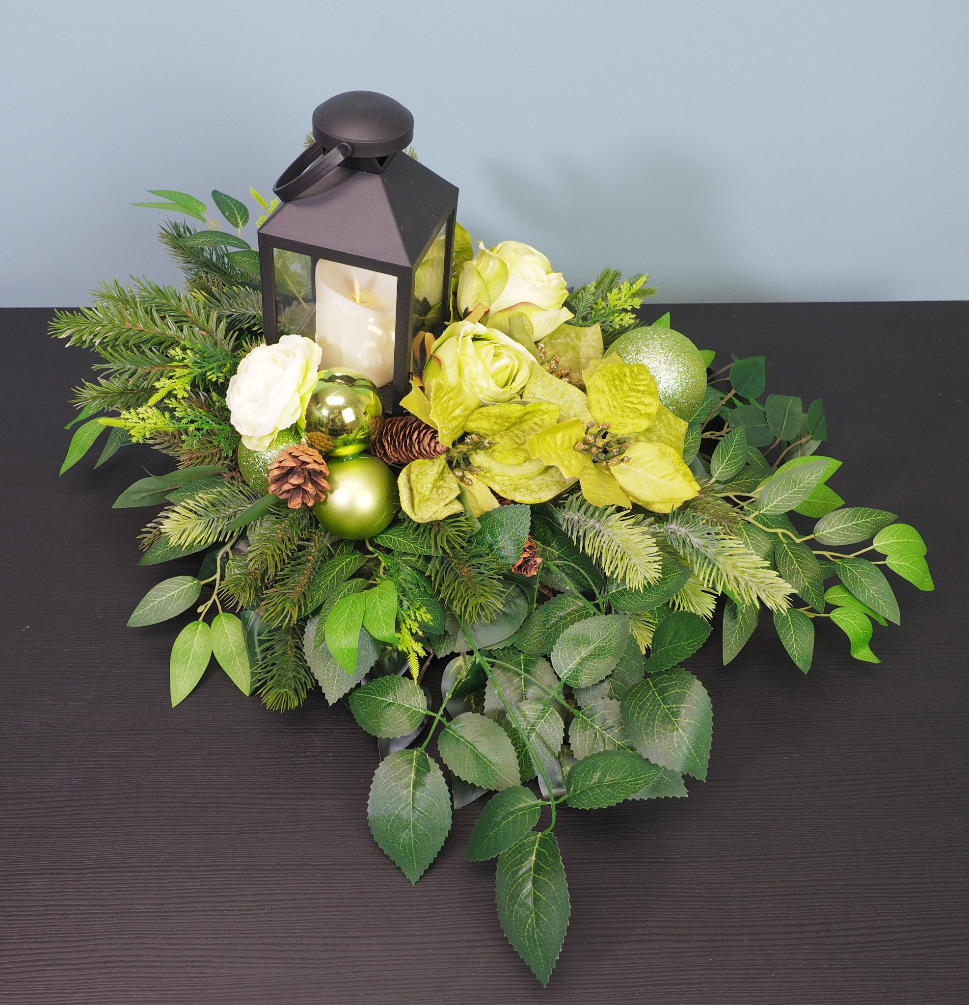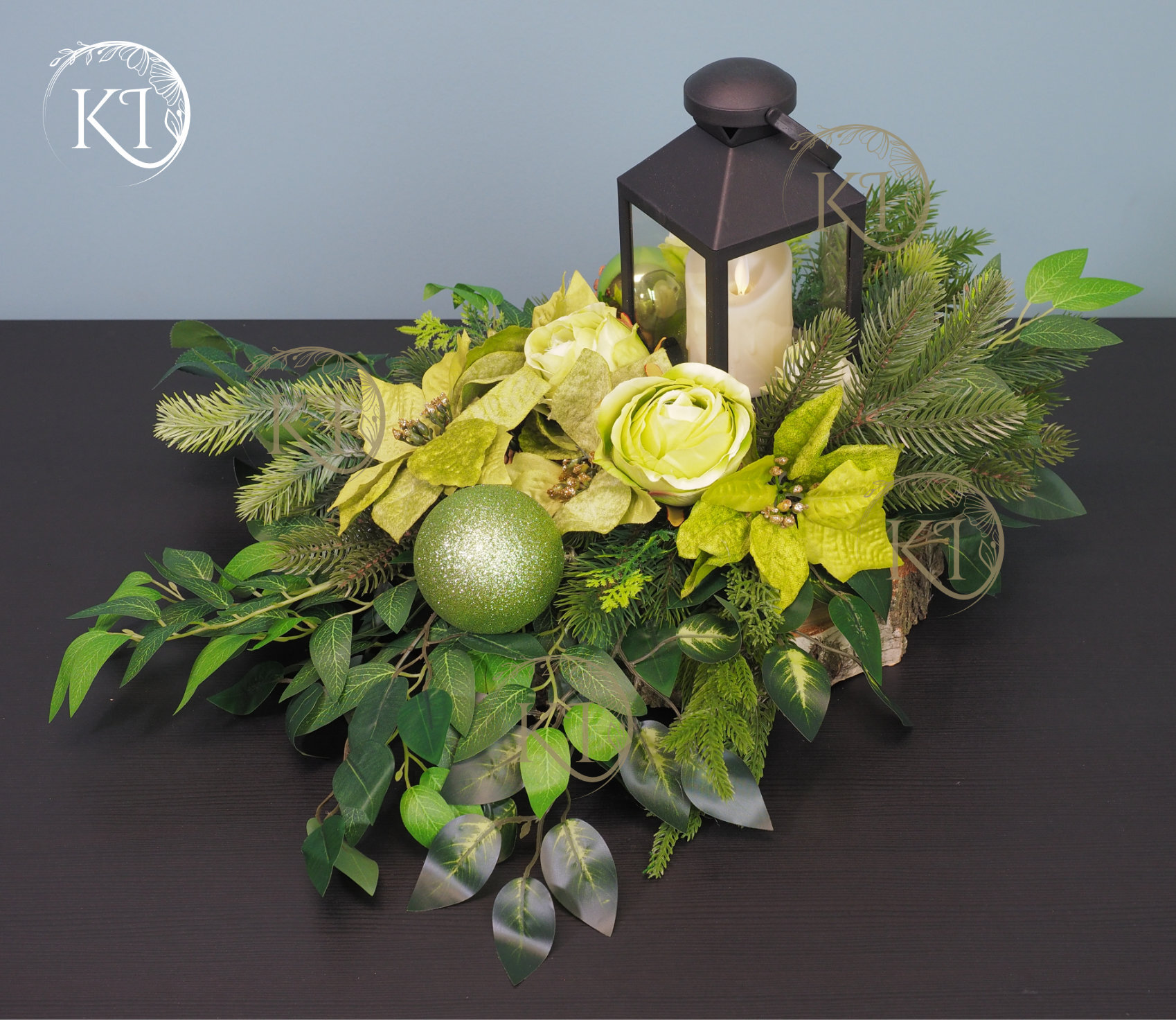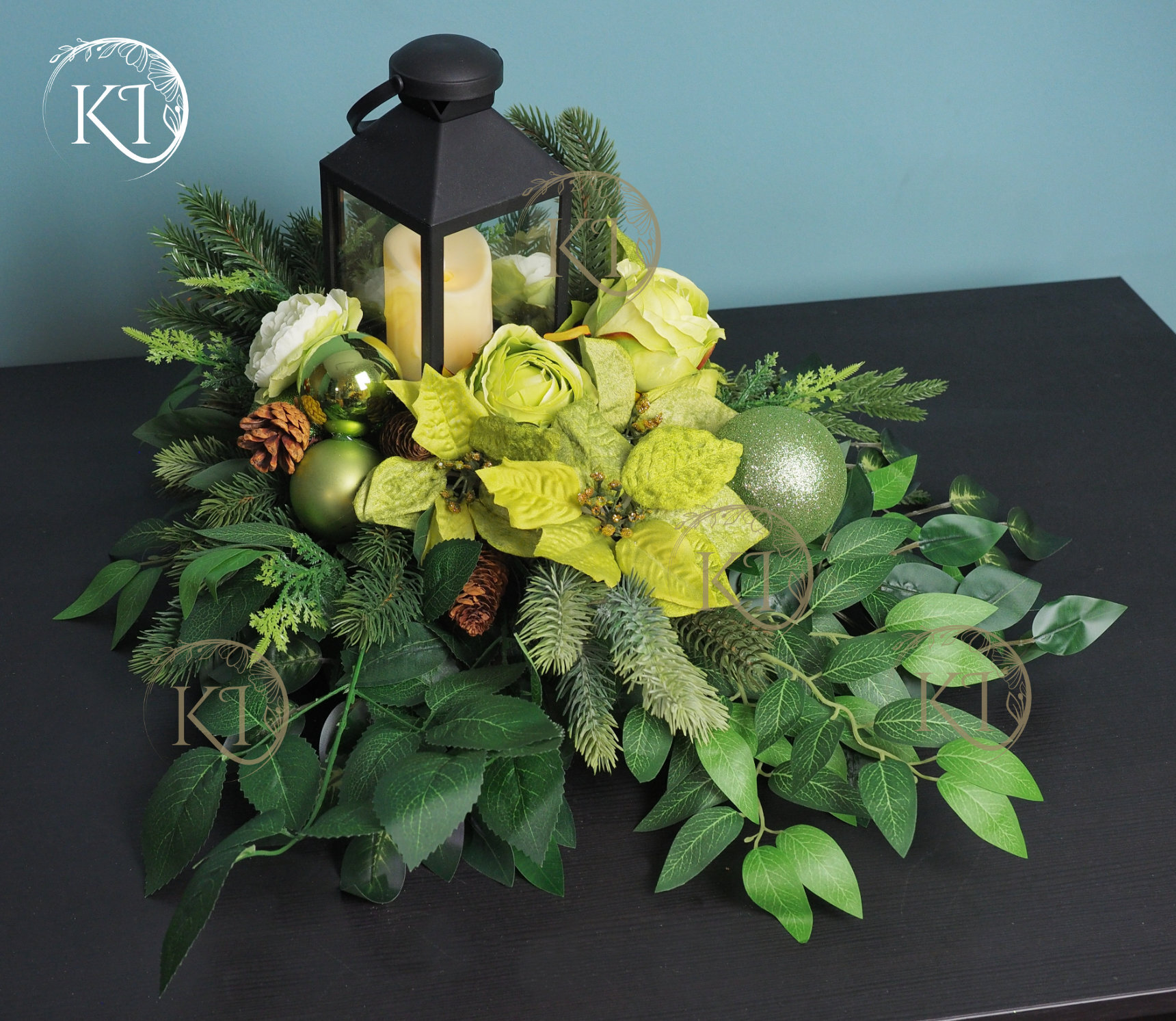 Niepowtarzalna, z ogromną dbałością o detale, ręcznie wykonana kompozycja ze sztucznych kwiatów wysokiej jakości, z przewagą kolorów zielonych, z dodatkiem gwiazdy betlejemskiej, bombek plastikowych, szyszek, na plastrze drewnianym, w centrum kompozycji latarenka z wyjmowaną świecą LED ( brak baterii w zestawie)