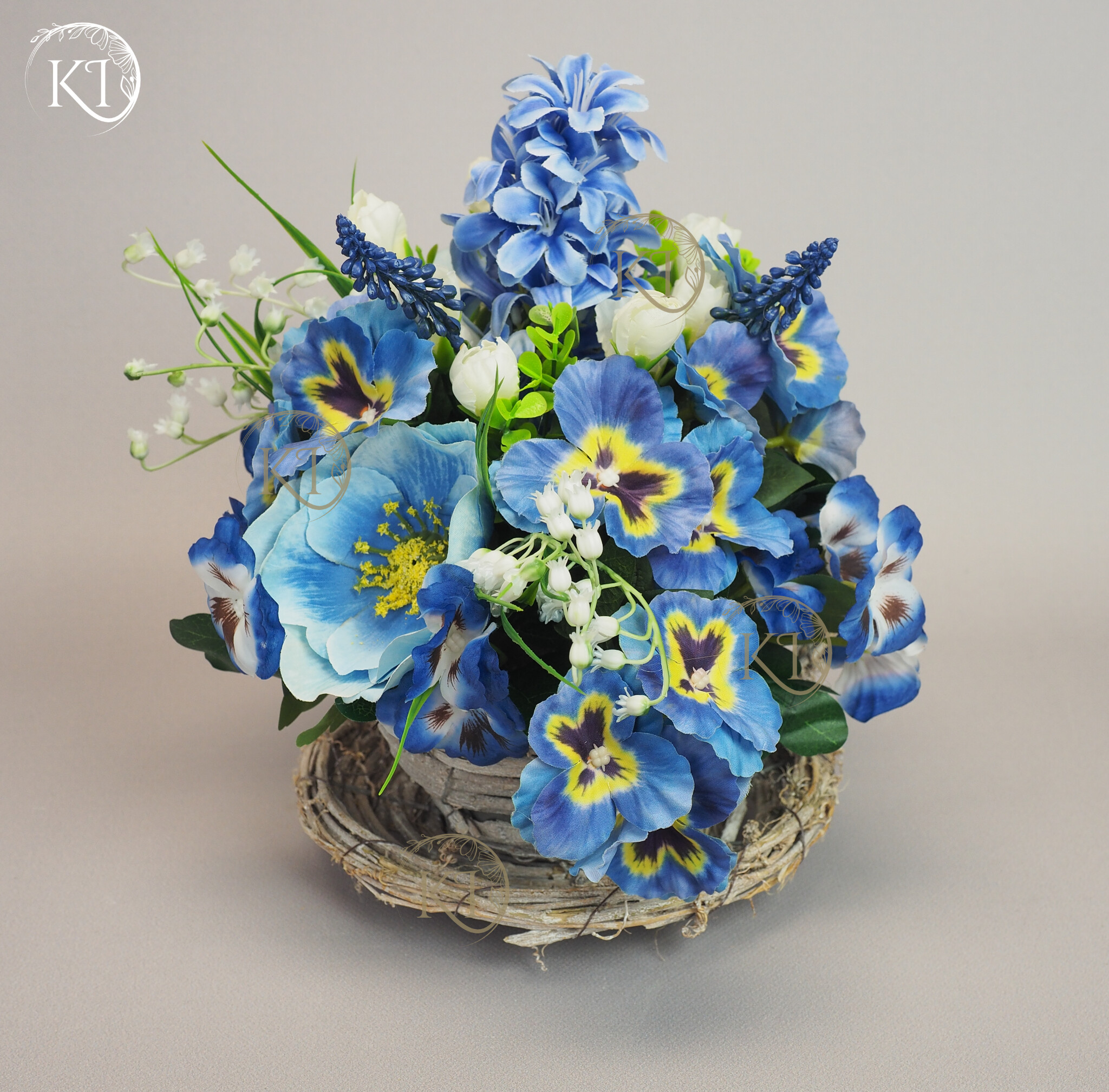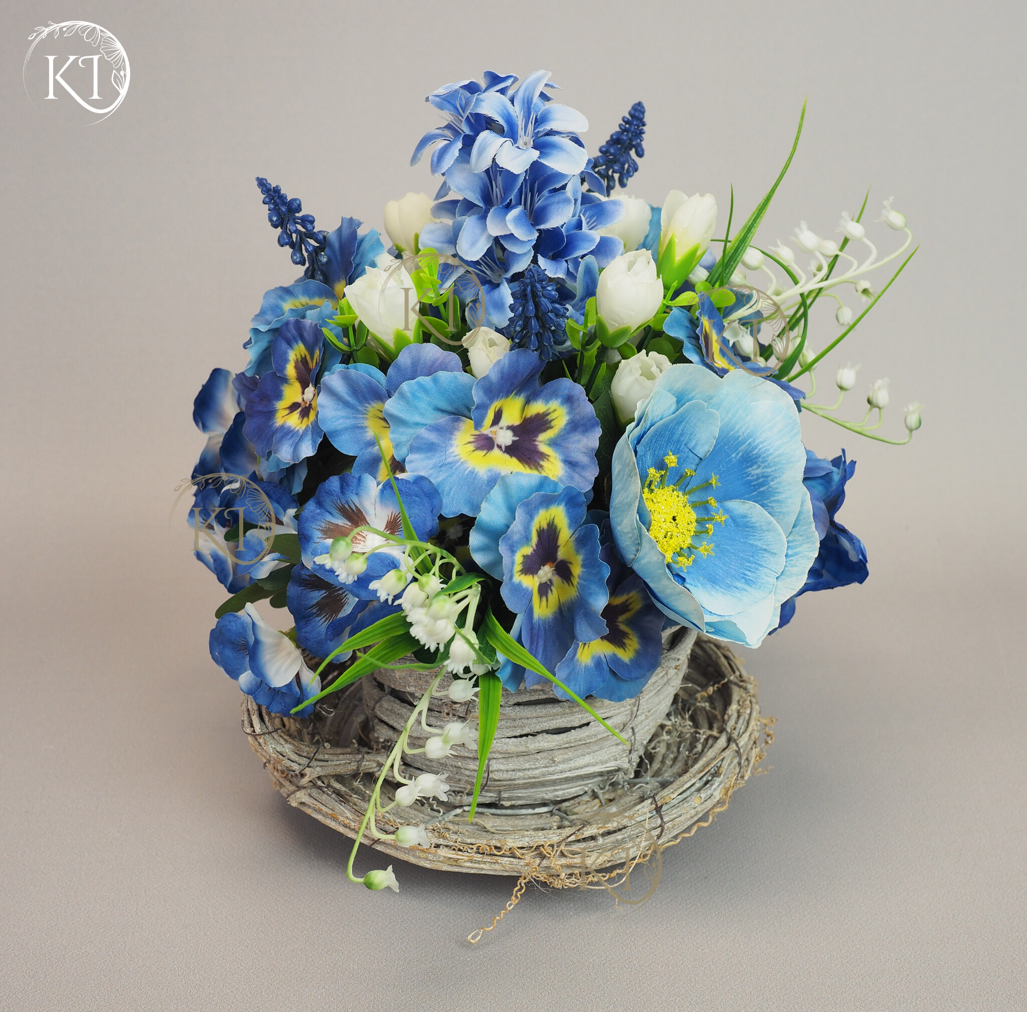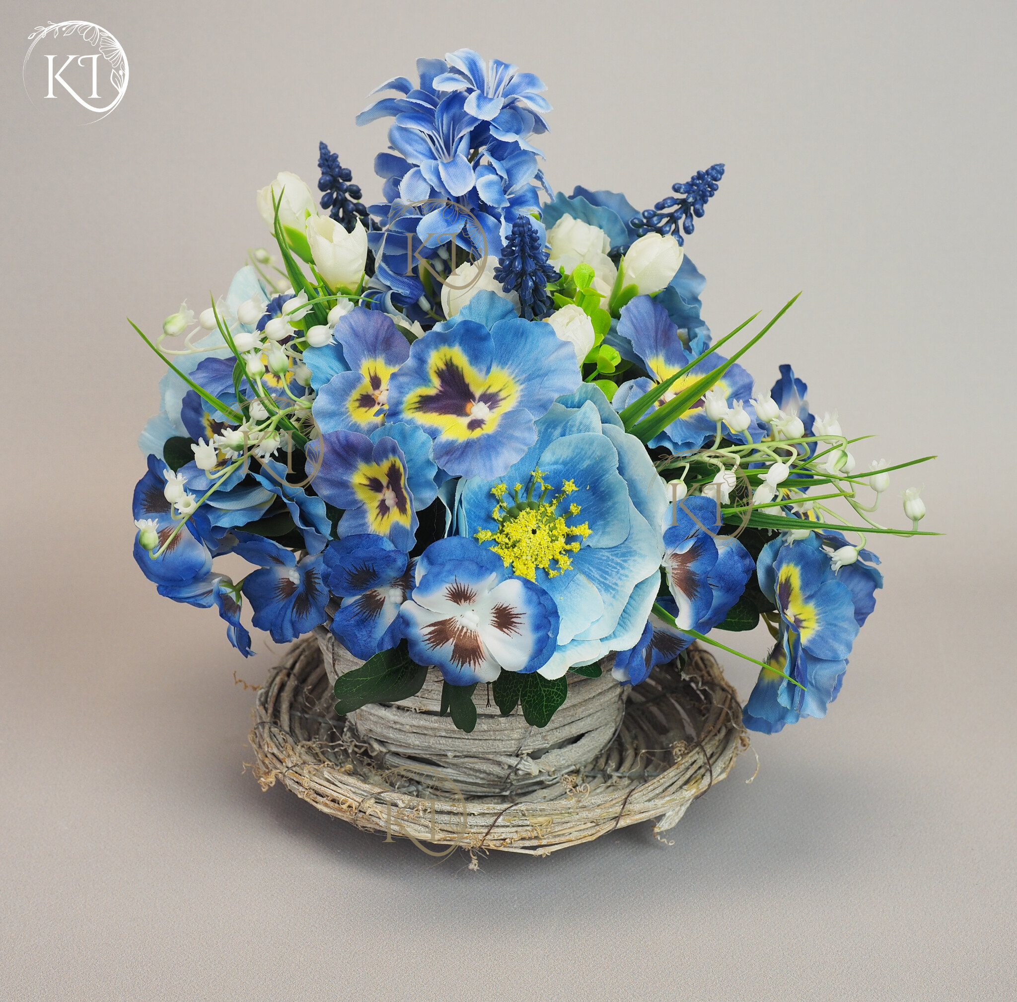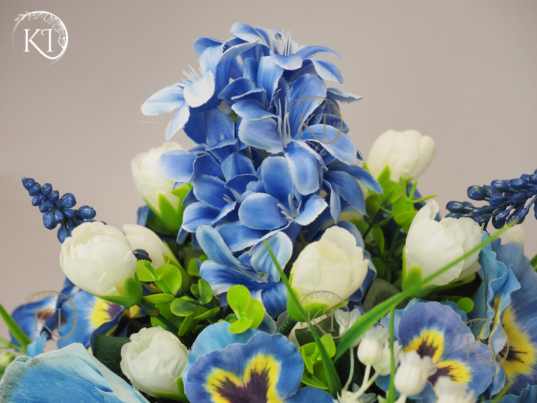 Przyciągająca wzrok, niepowtarzalna, wykonana z ogromną dbałością o detale kompozycja ze sztucznych kwiatów w błękitno- białej tonacji kolorystycznej , w obciążonej podstawie.