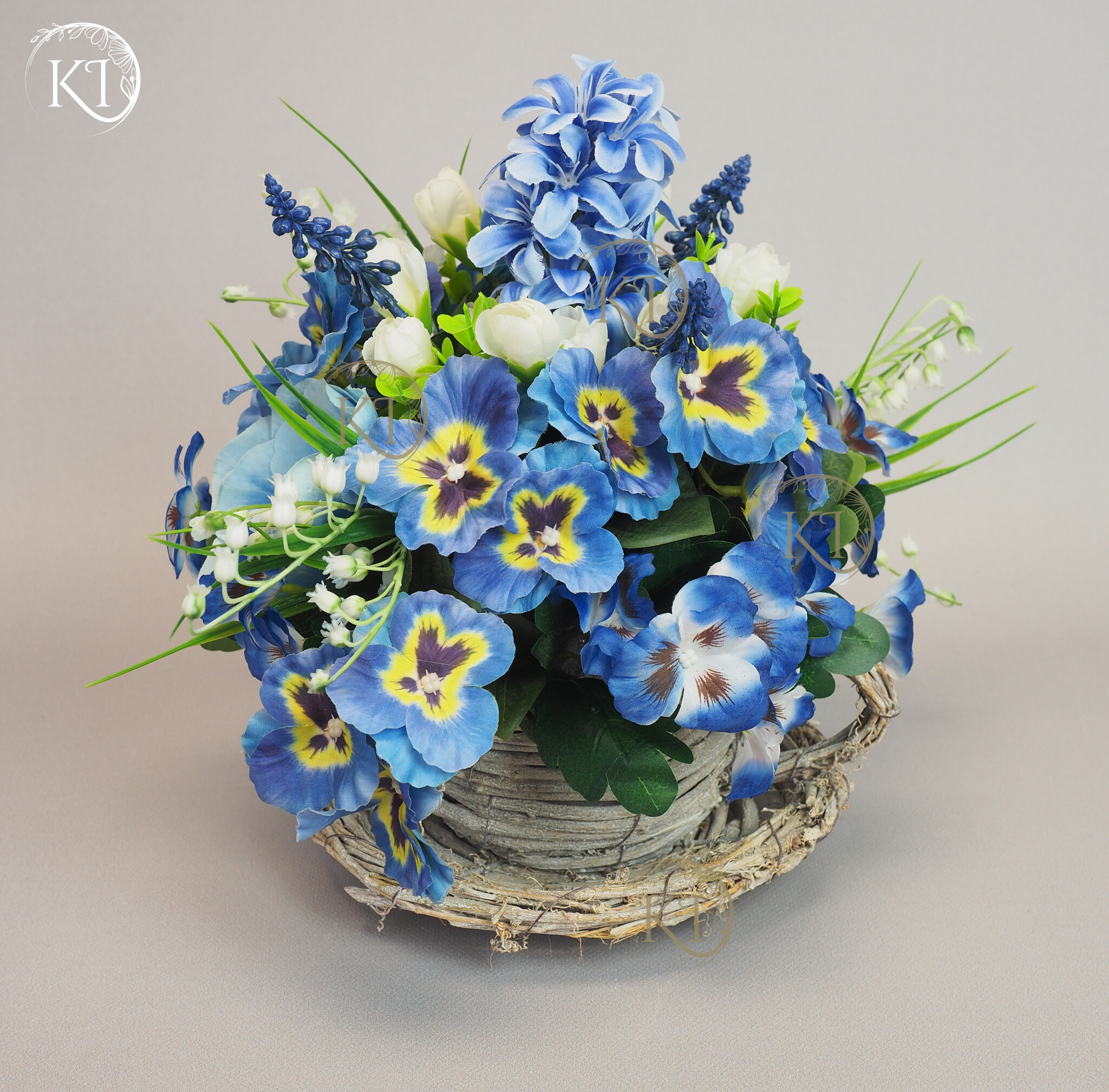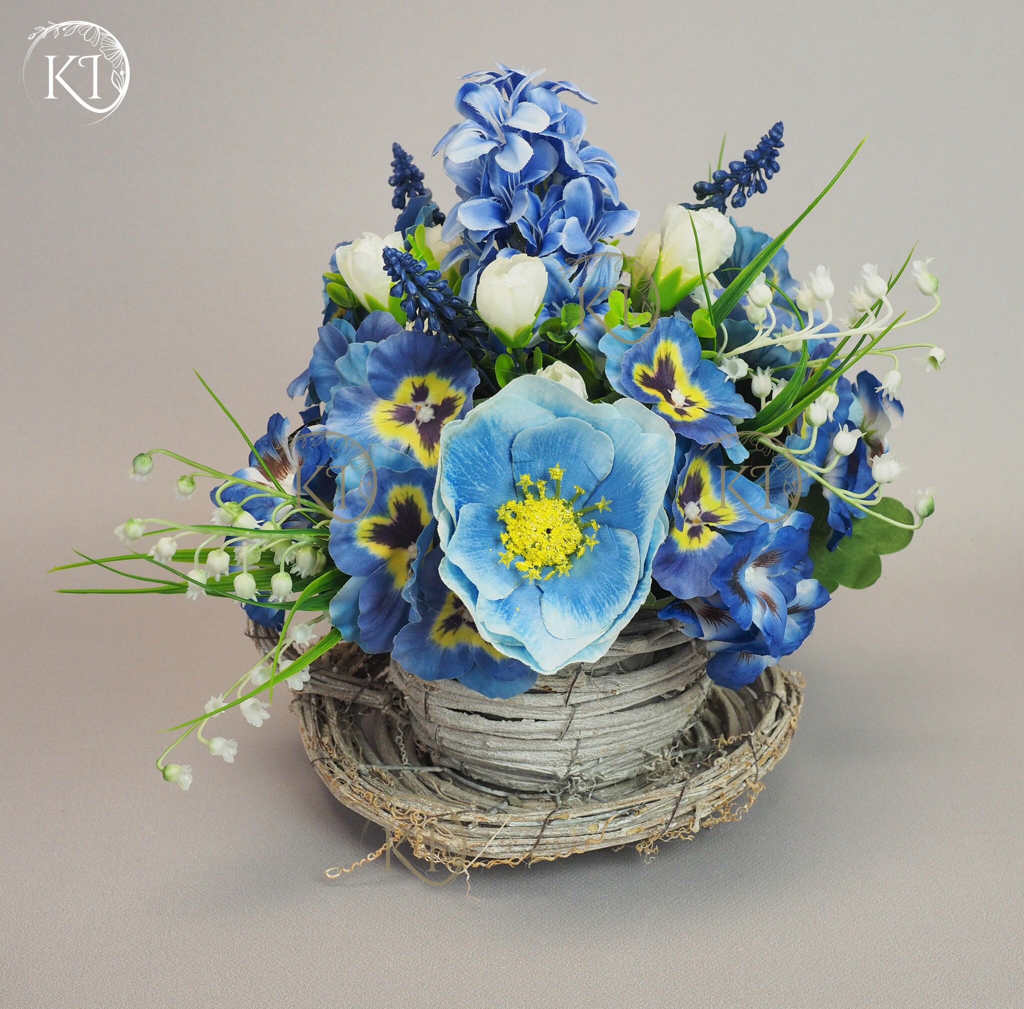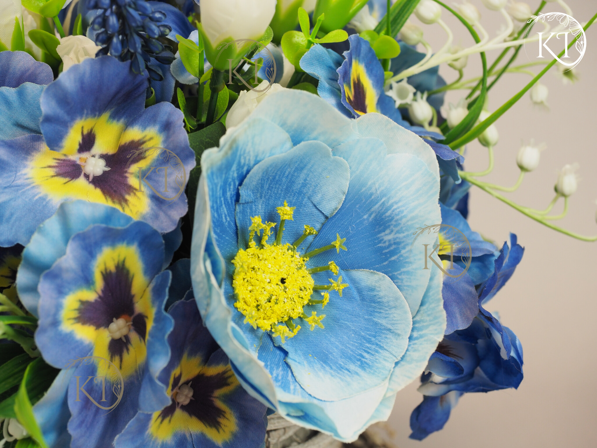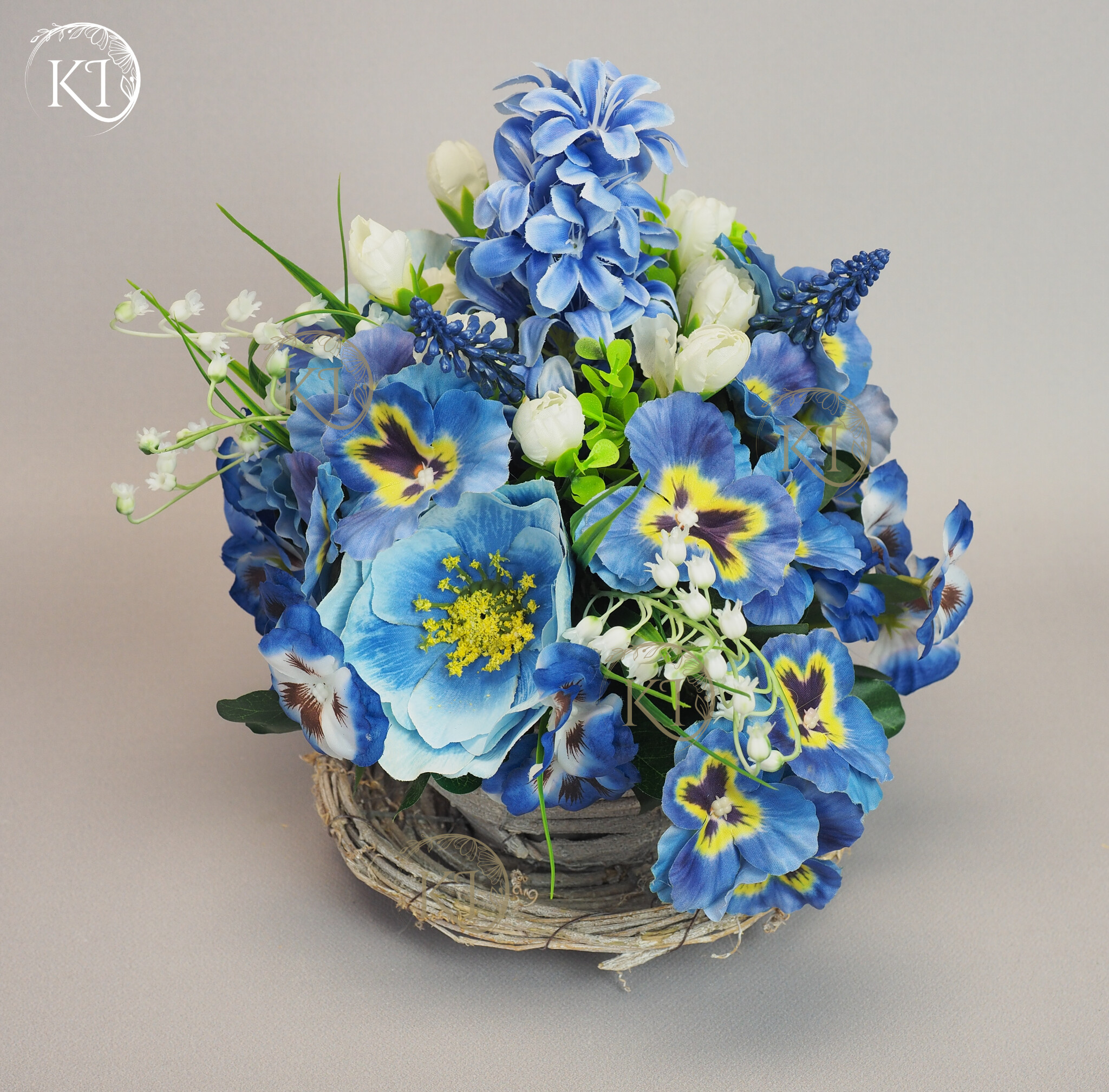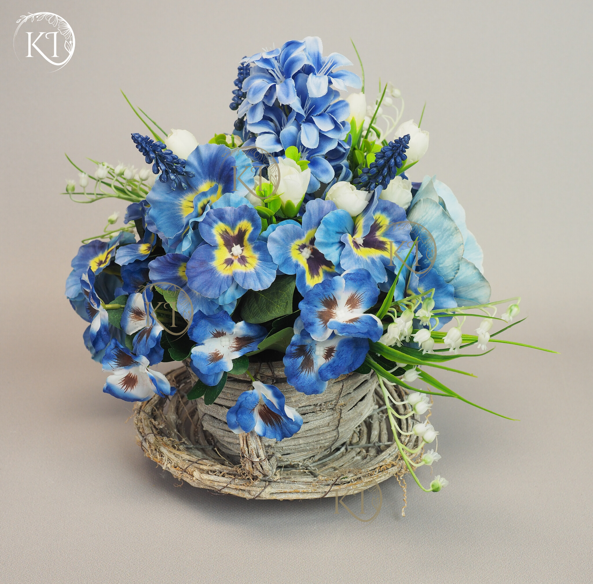 Przyciągająca wzrok, niepowtarzalna, wykonana z ogromną dbałością o detale kompozycja ze sztucznych kwiatów w błękitno- białej tonacji kolorystycznej , w obciążonej podstawie.