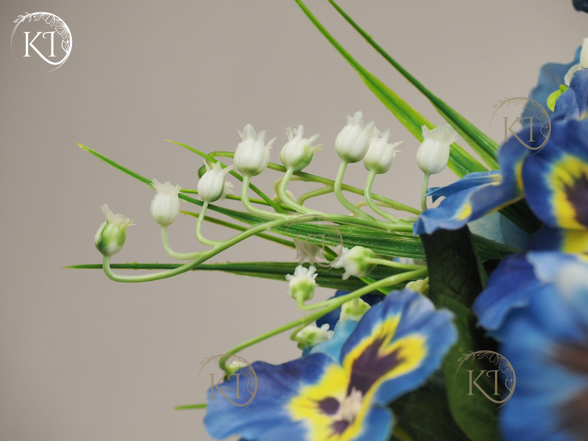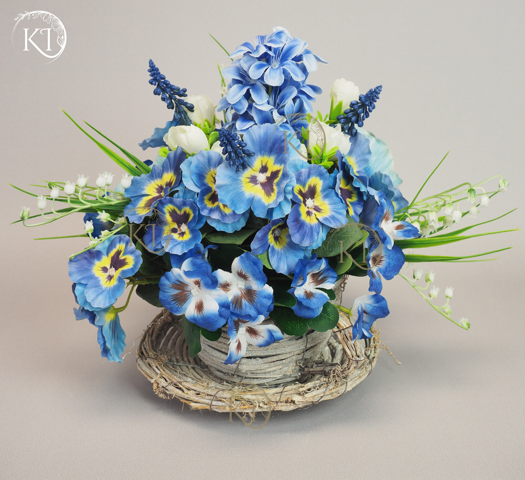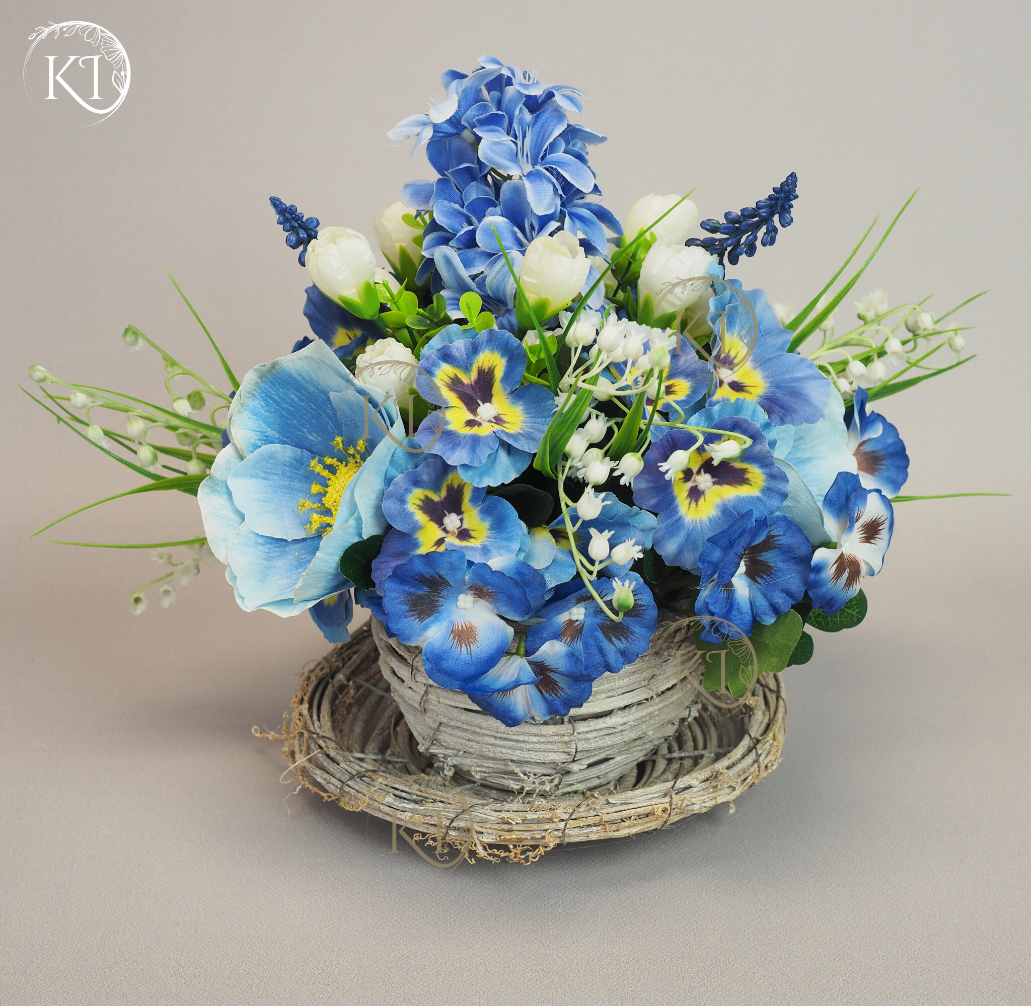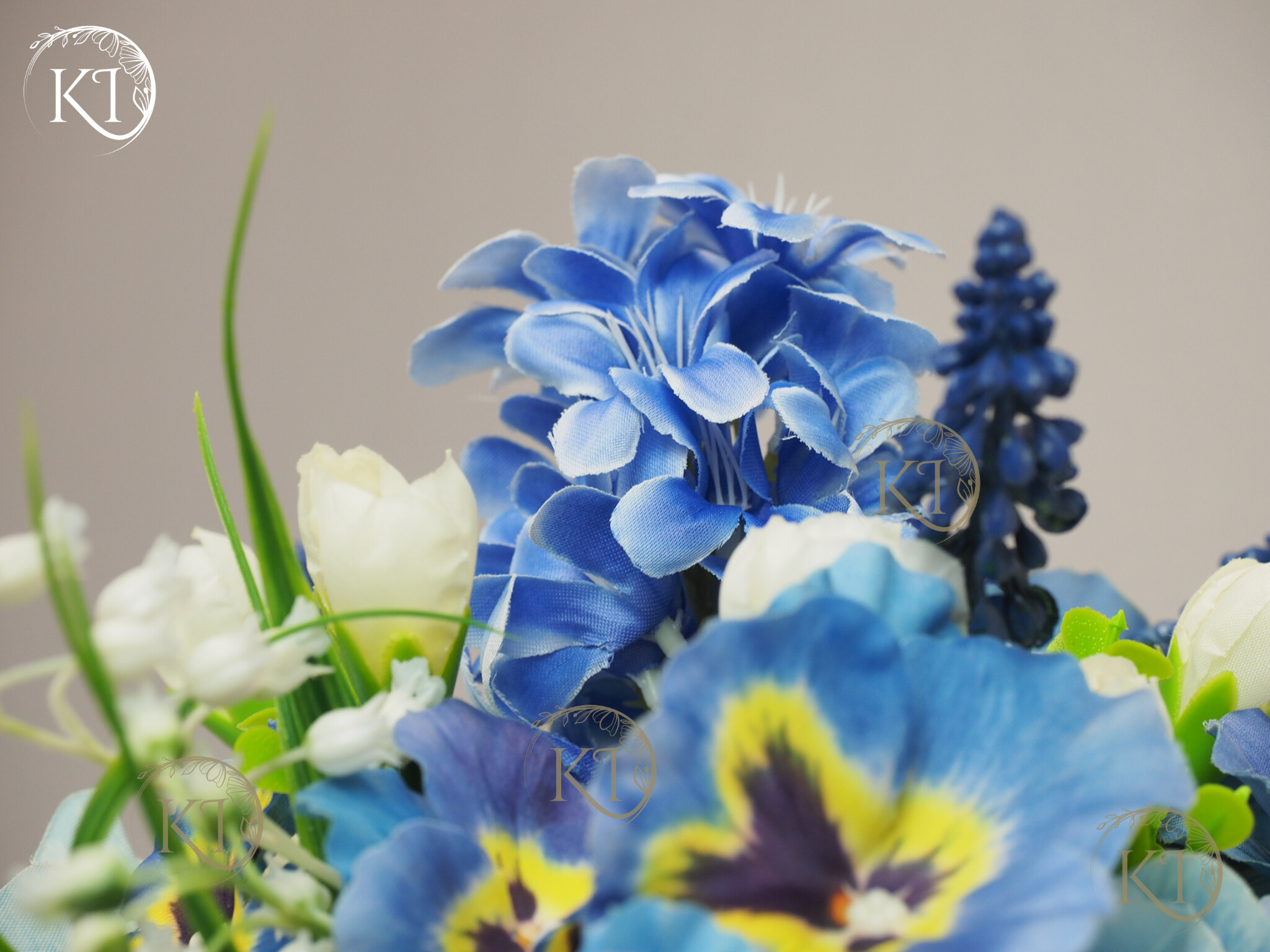 Przyciągająca wzrok, niepowtarzalna, wykonana z ogromną dbałością o detale kompozycja ze sztucznych kwiatów w błękitno- białej tonacji kolorystycznej , w obciążonej podstawie.