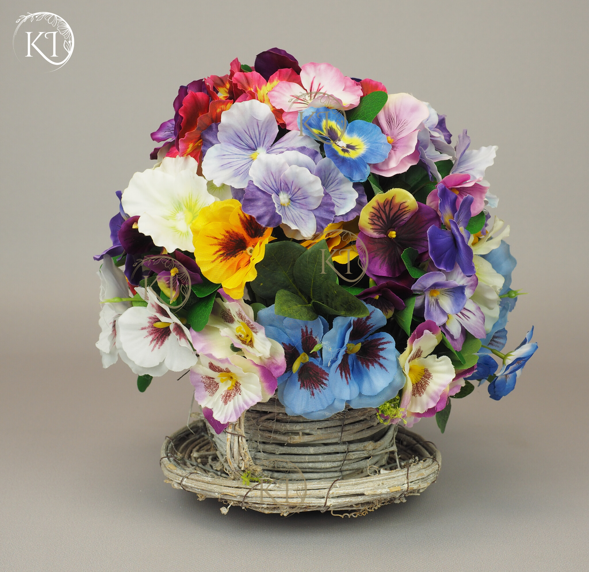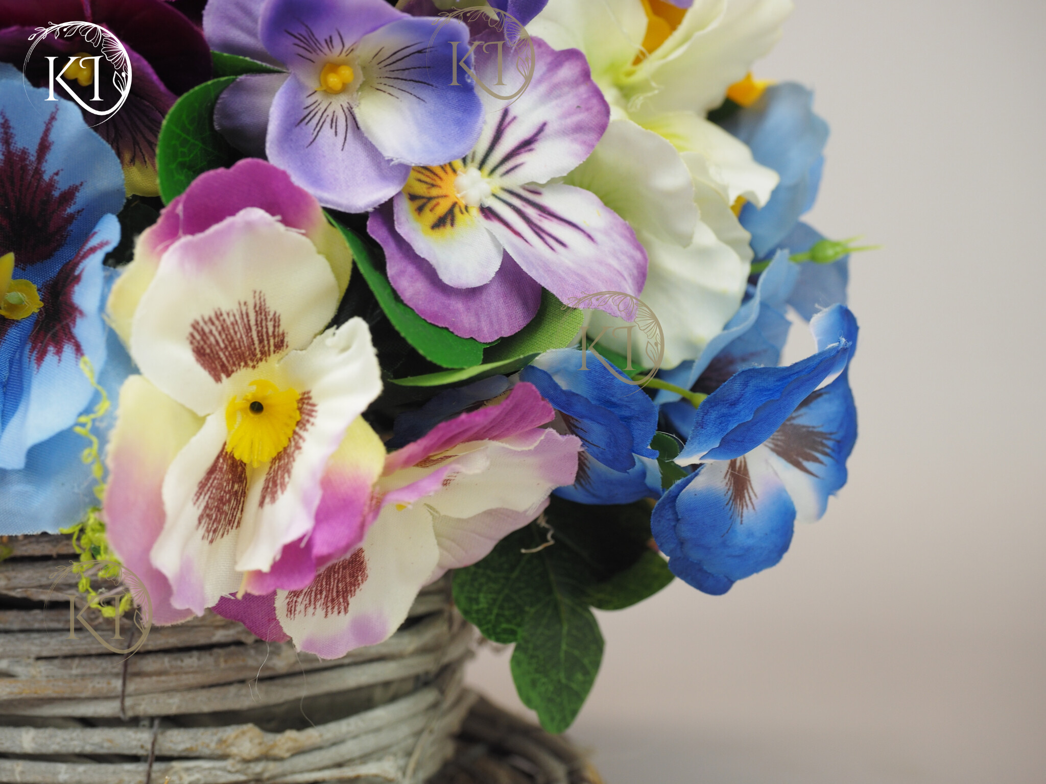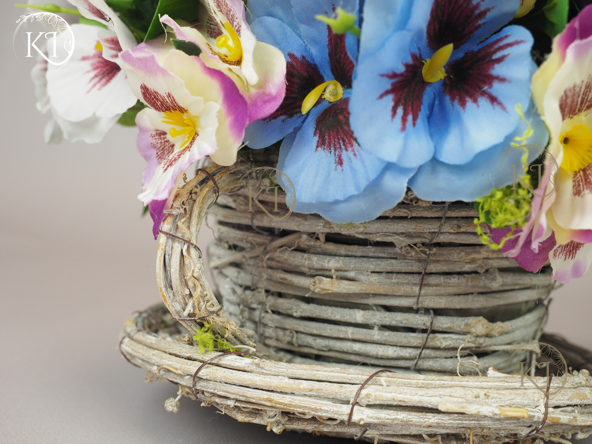 Wielokolorowy bukiet bratków w filiżance z wikliny.