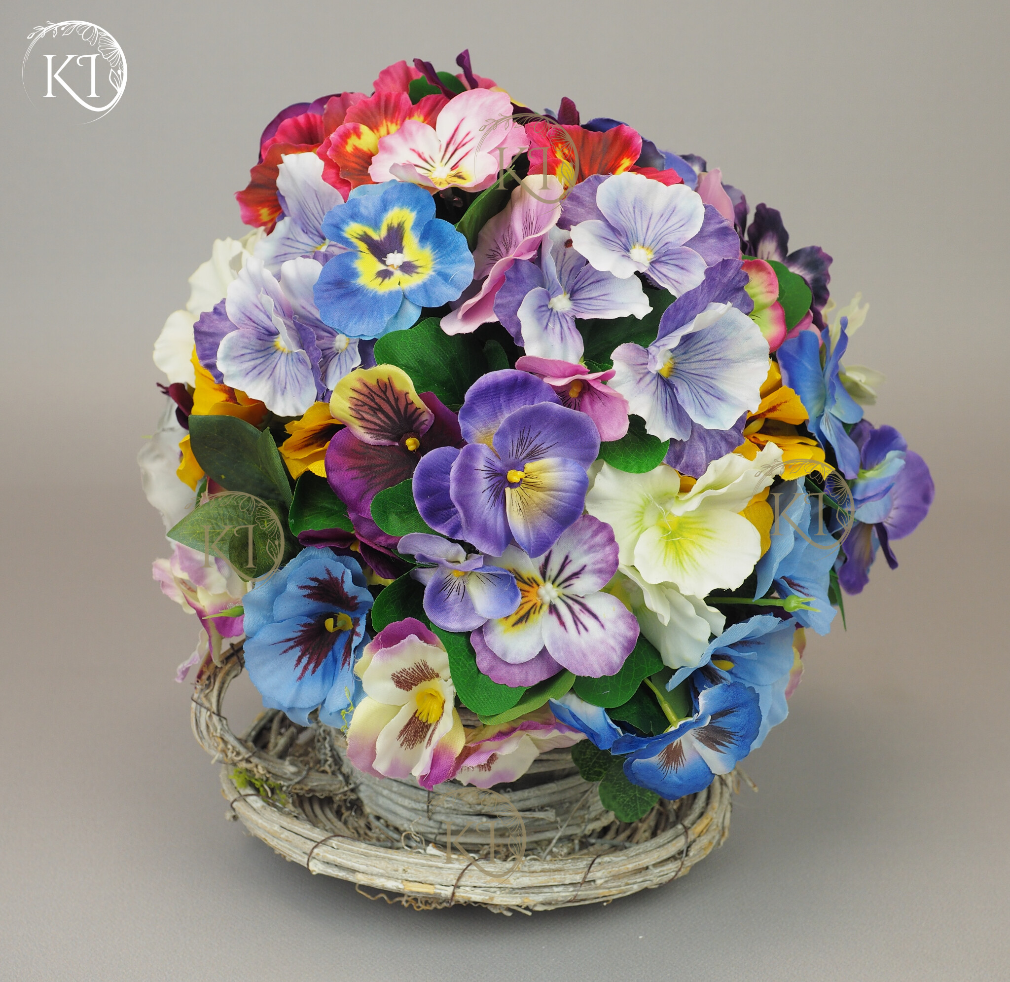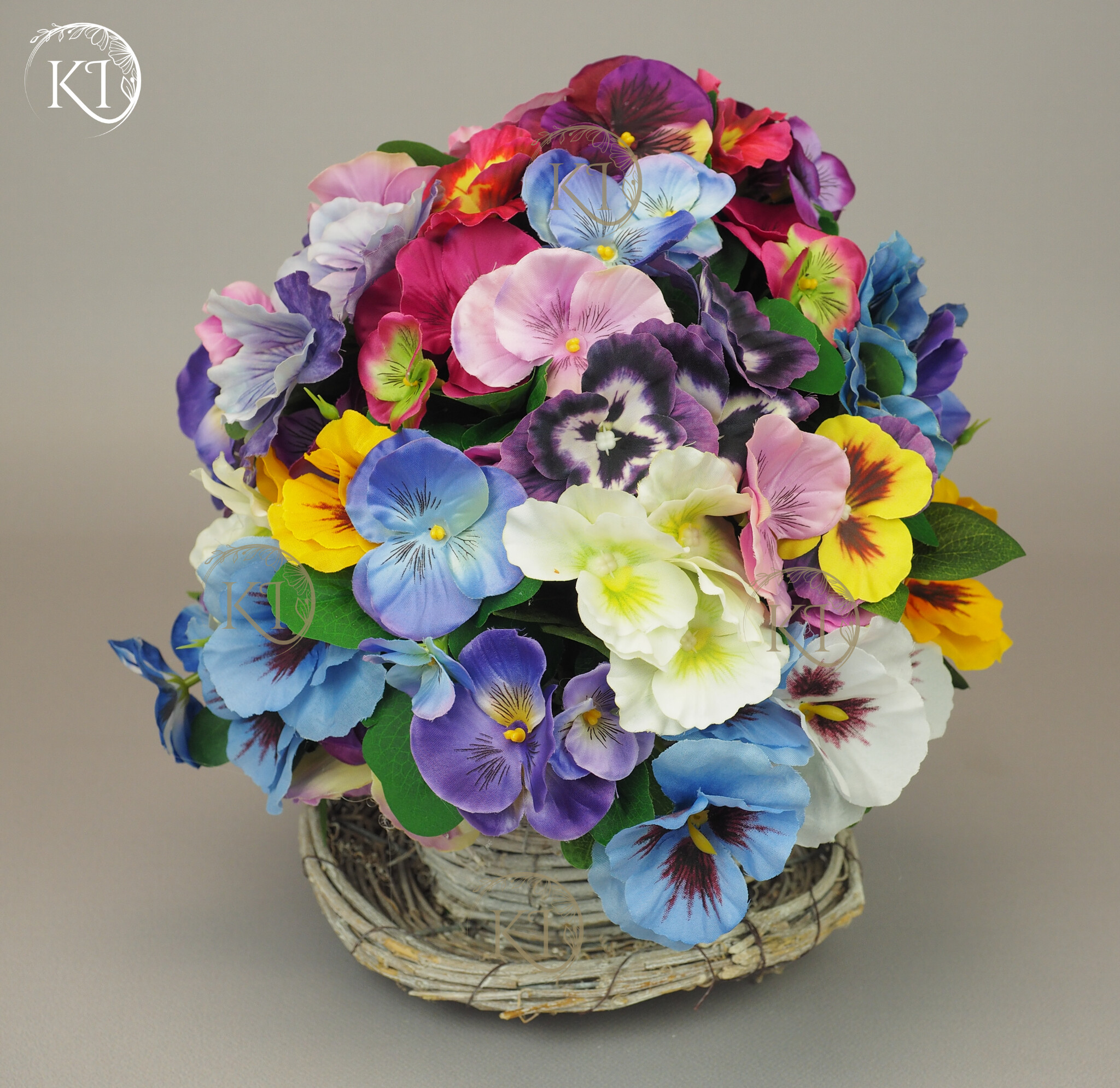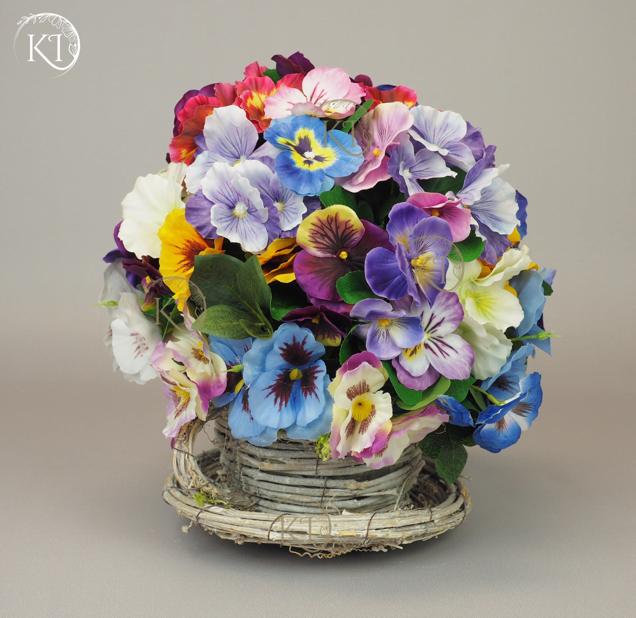Wielokolorowy bukiet bratków w filiżance z wikliny.