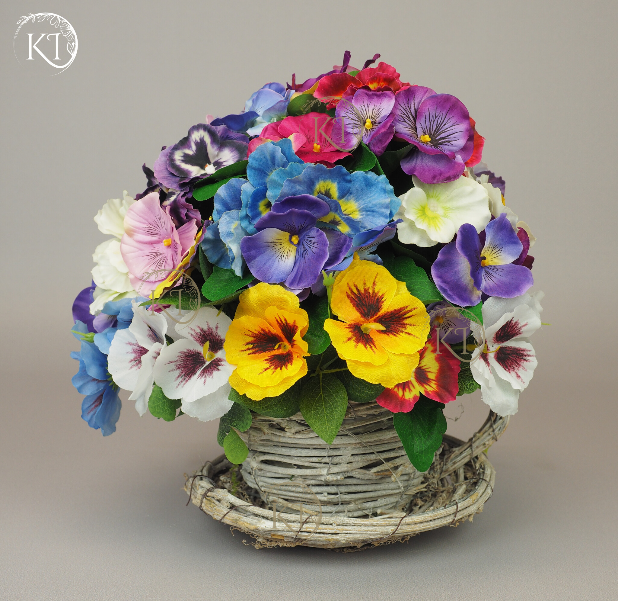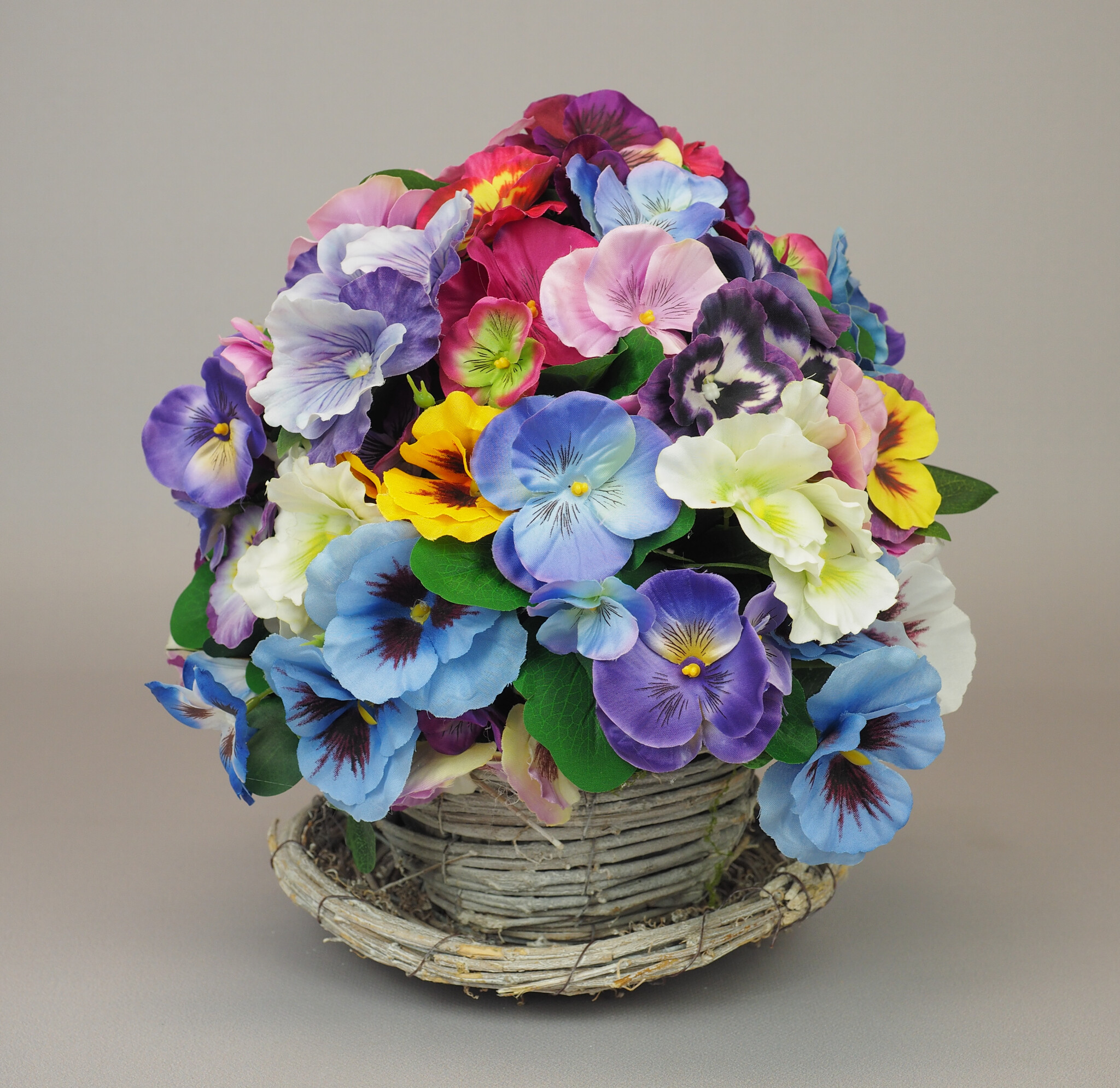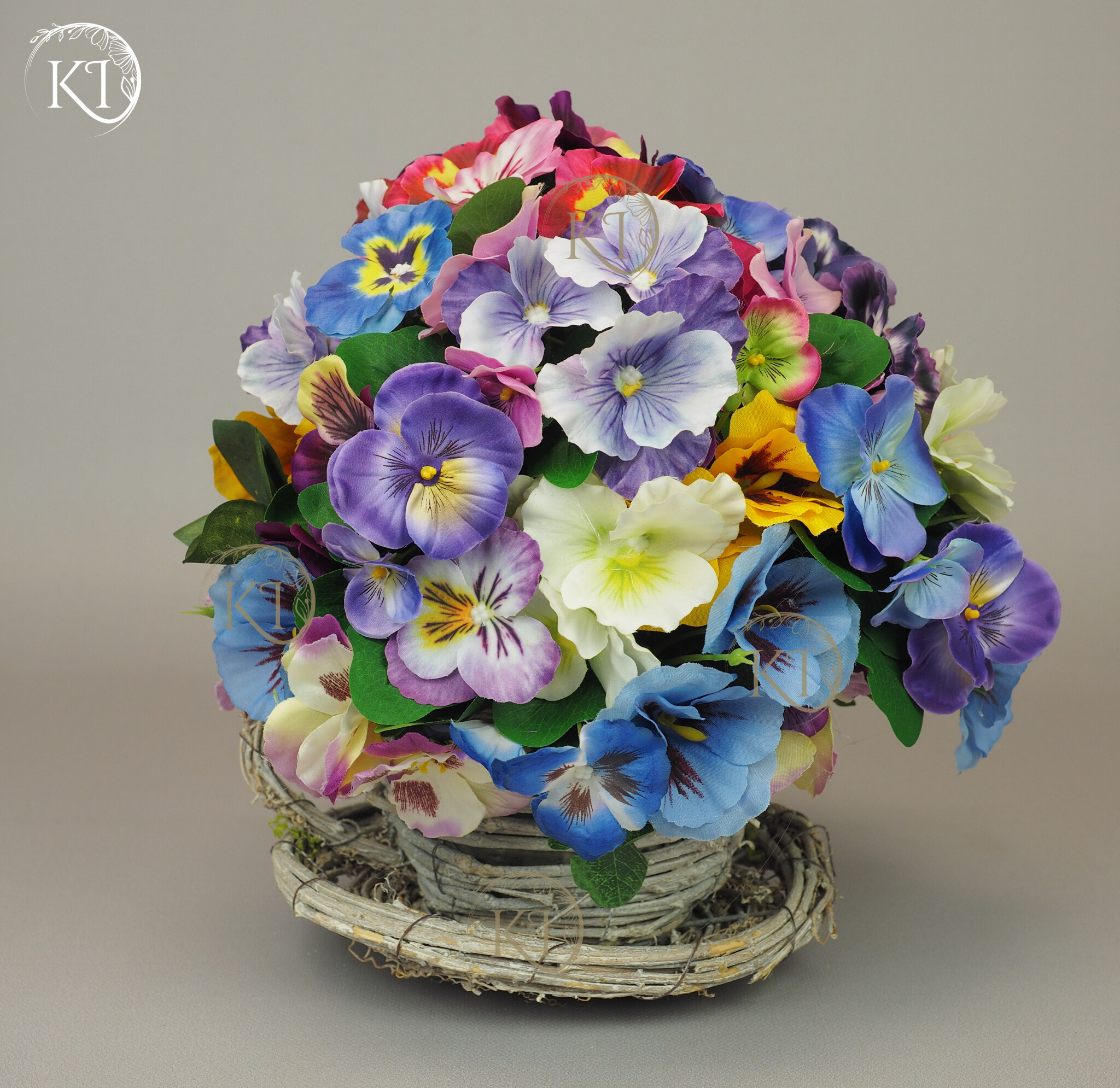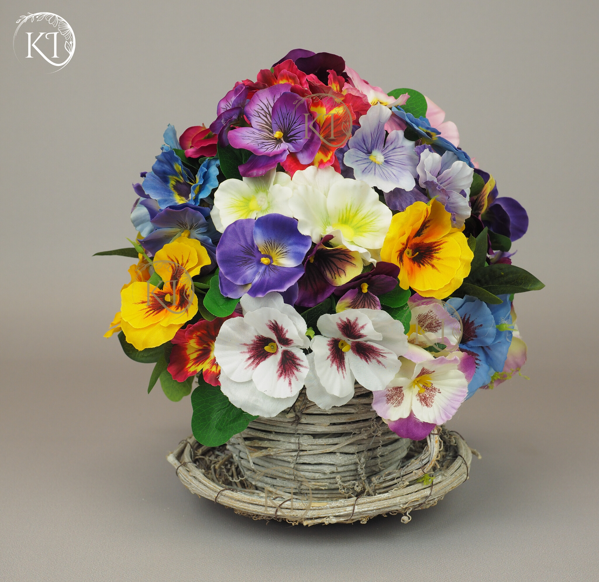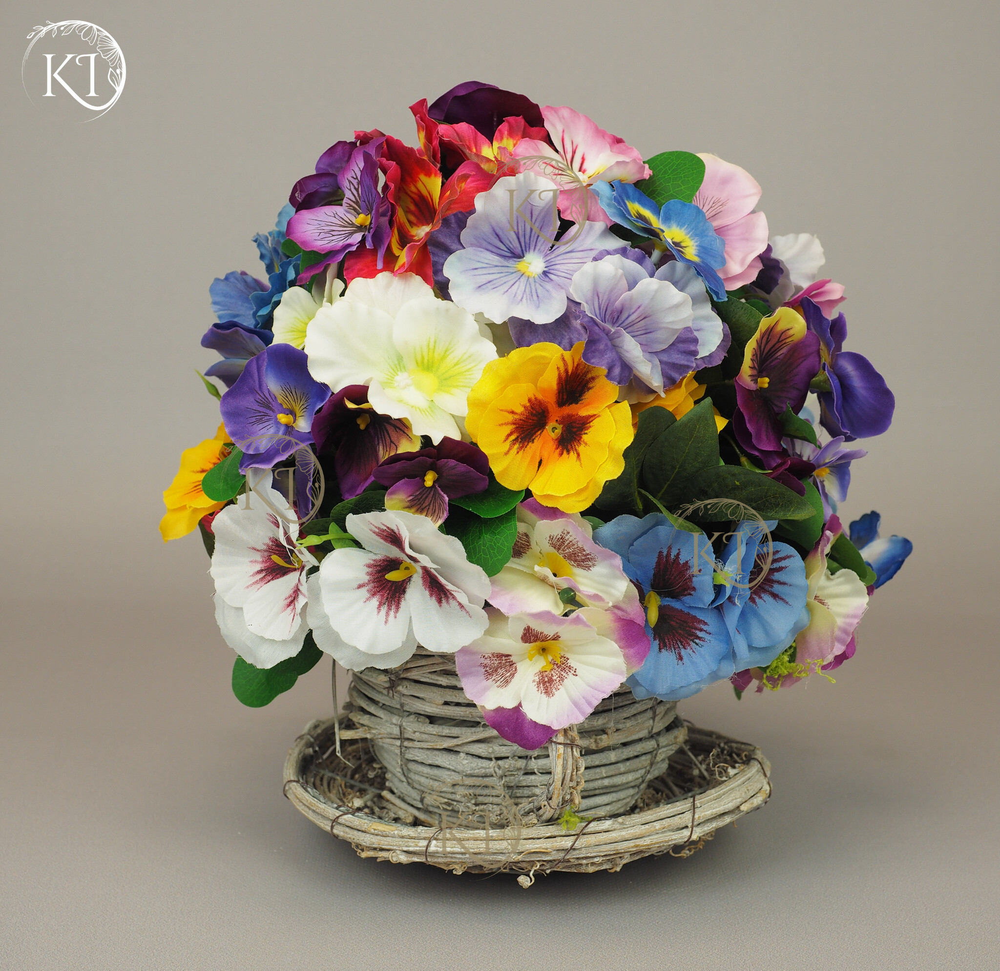 Uniwersalna kompozycja z kwiatów sztucznych wysokiej jakości, może być wykorzystana jako dekoracja nagrobna, lub dekoracja wnętrza domu, lub biura.