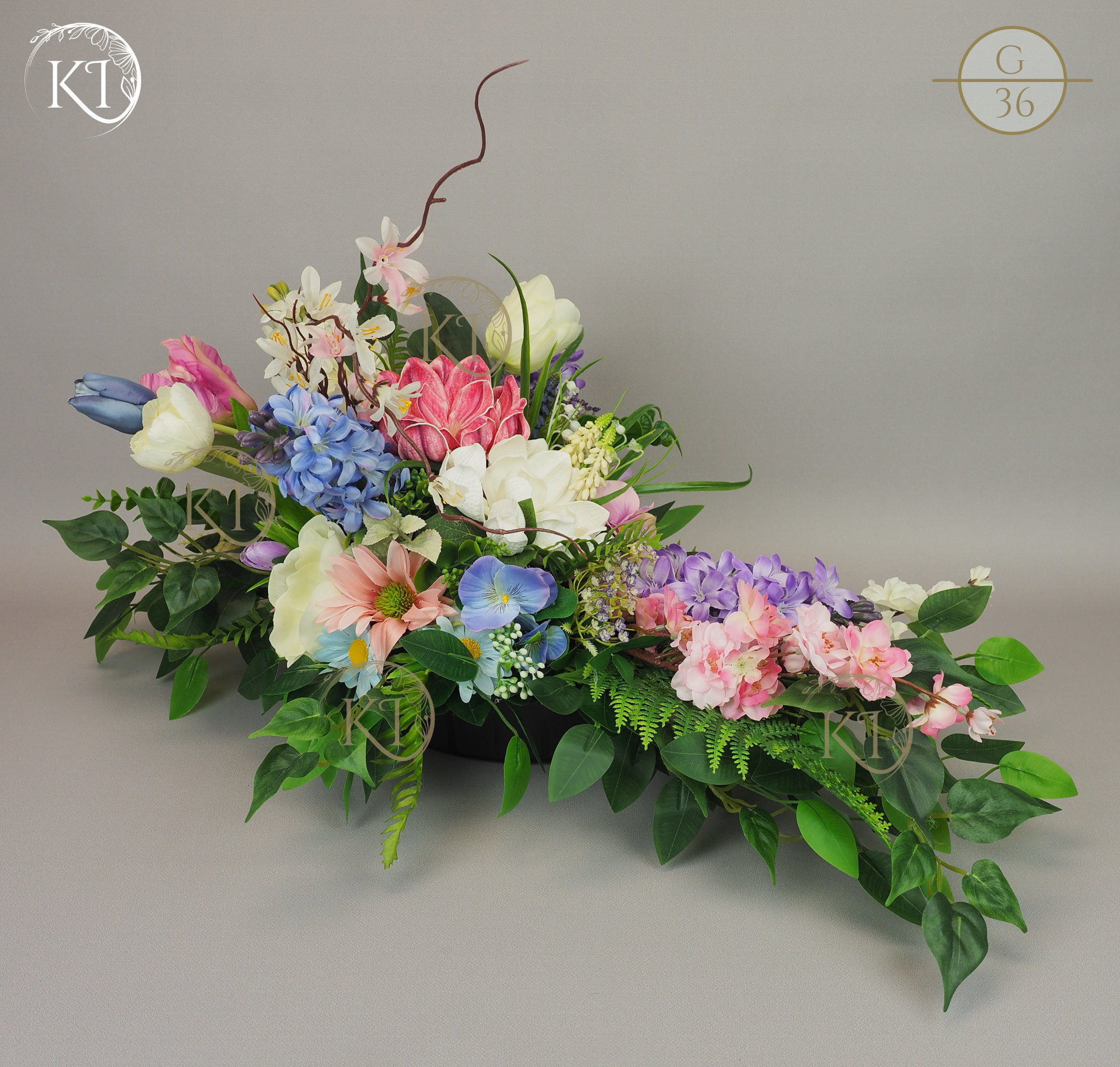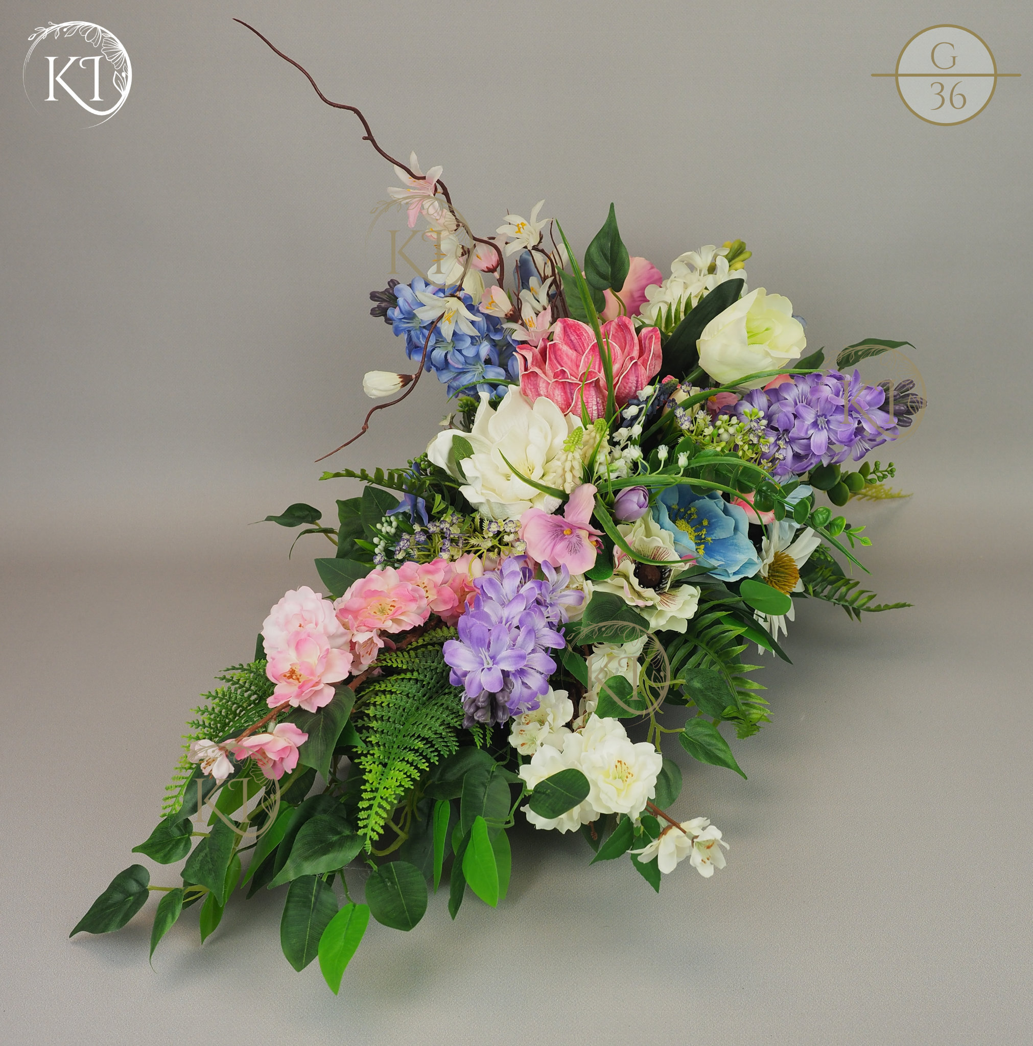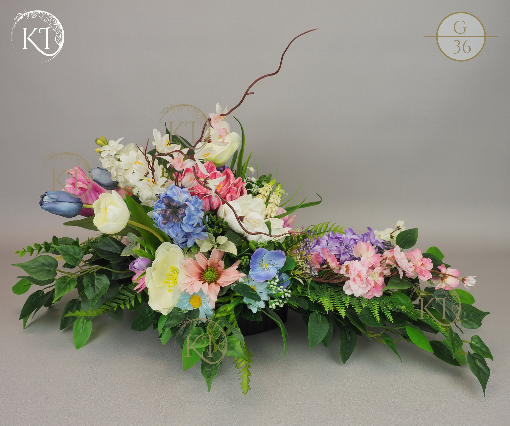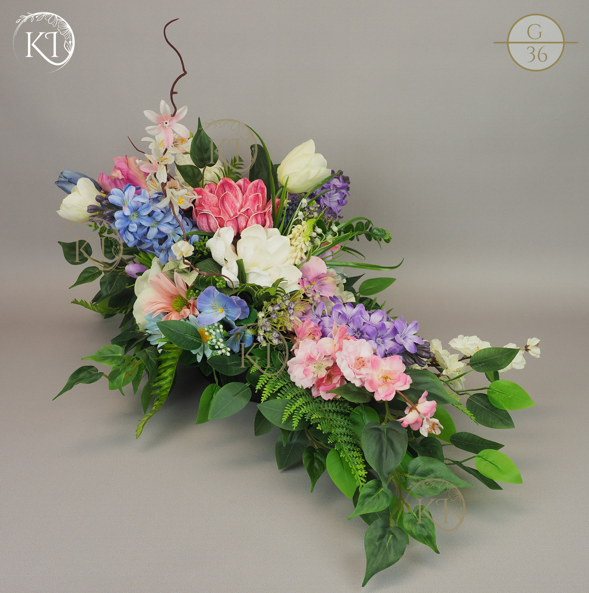 Tradycyjna Dekoracja nagrobna, w formie wiązanki, w obciążonej plastikowej podstawie, wykonana z gałązek i kwiatów sztucznych satynowych i piankowych wysokiej jakości, wykonana z dbałością o detale.