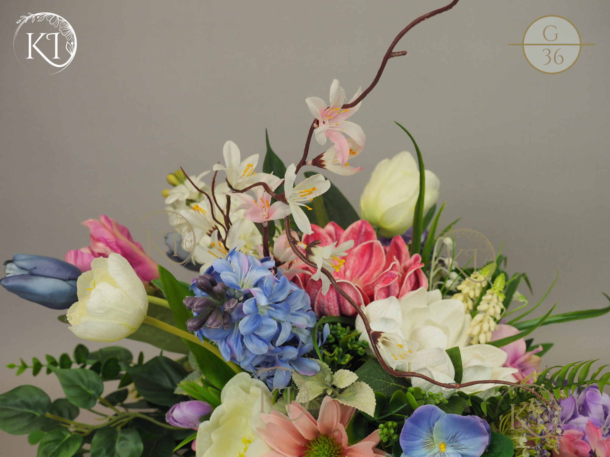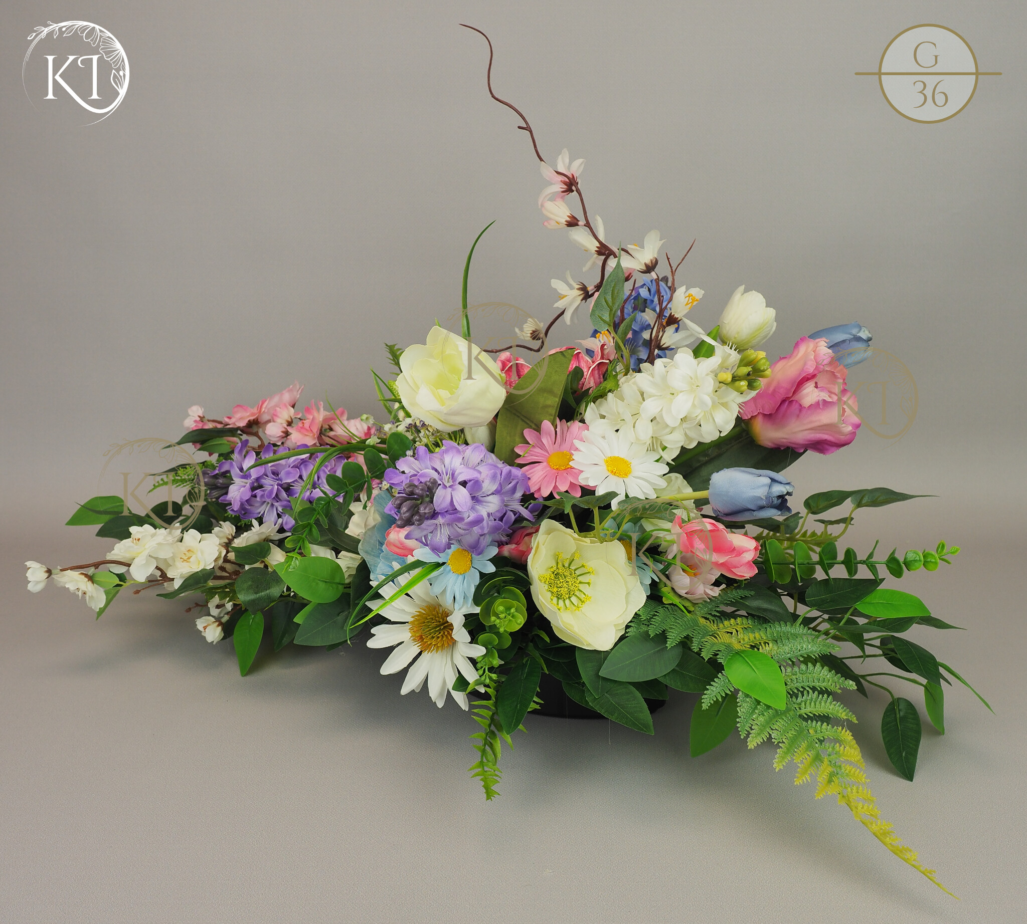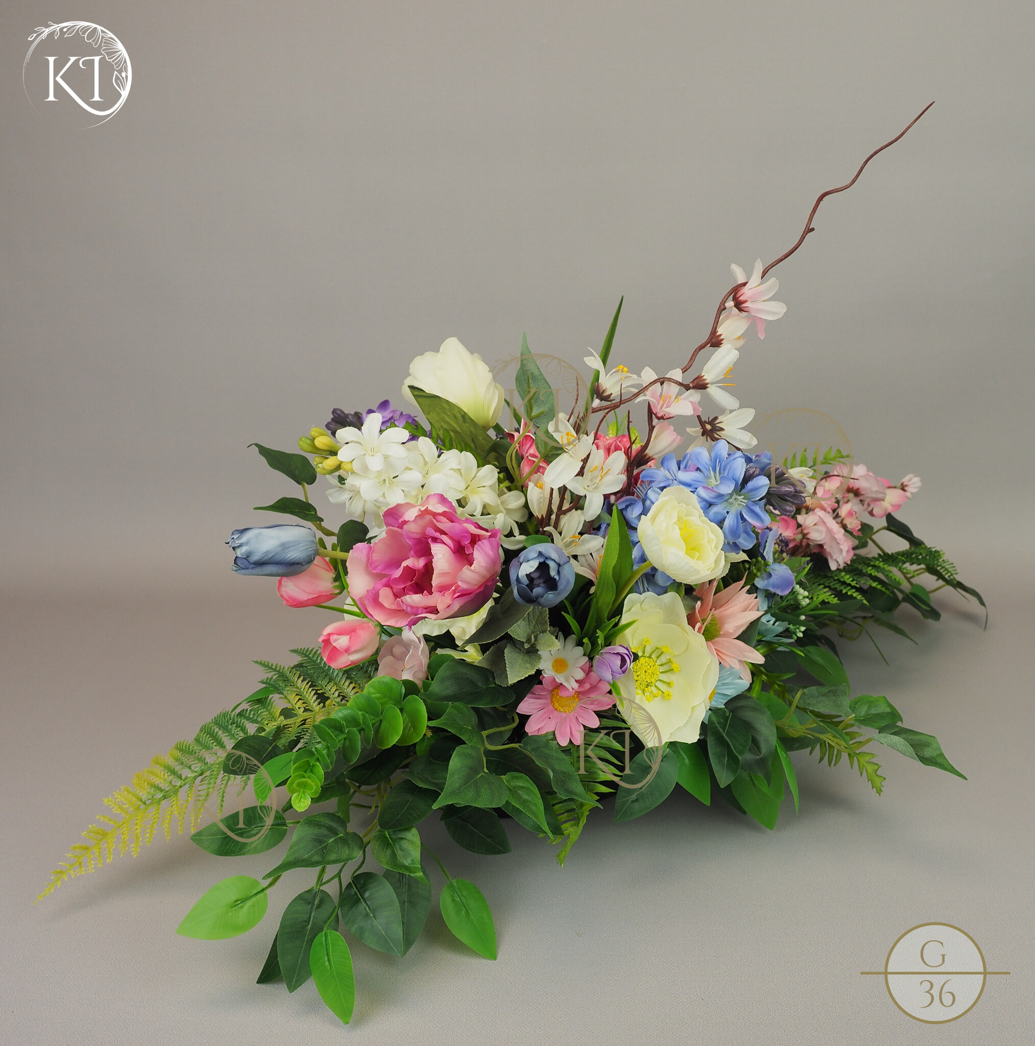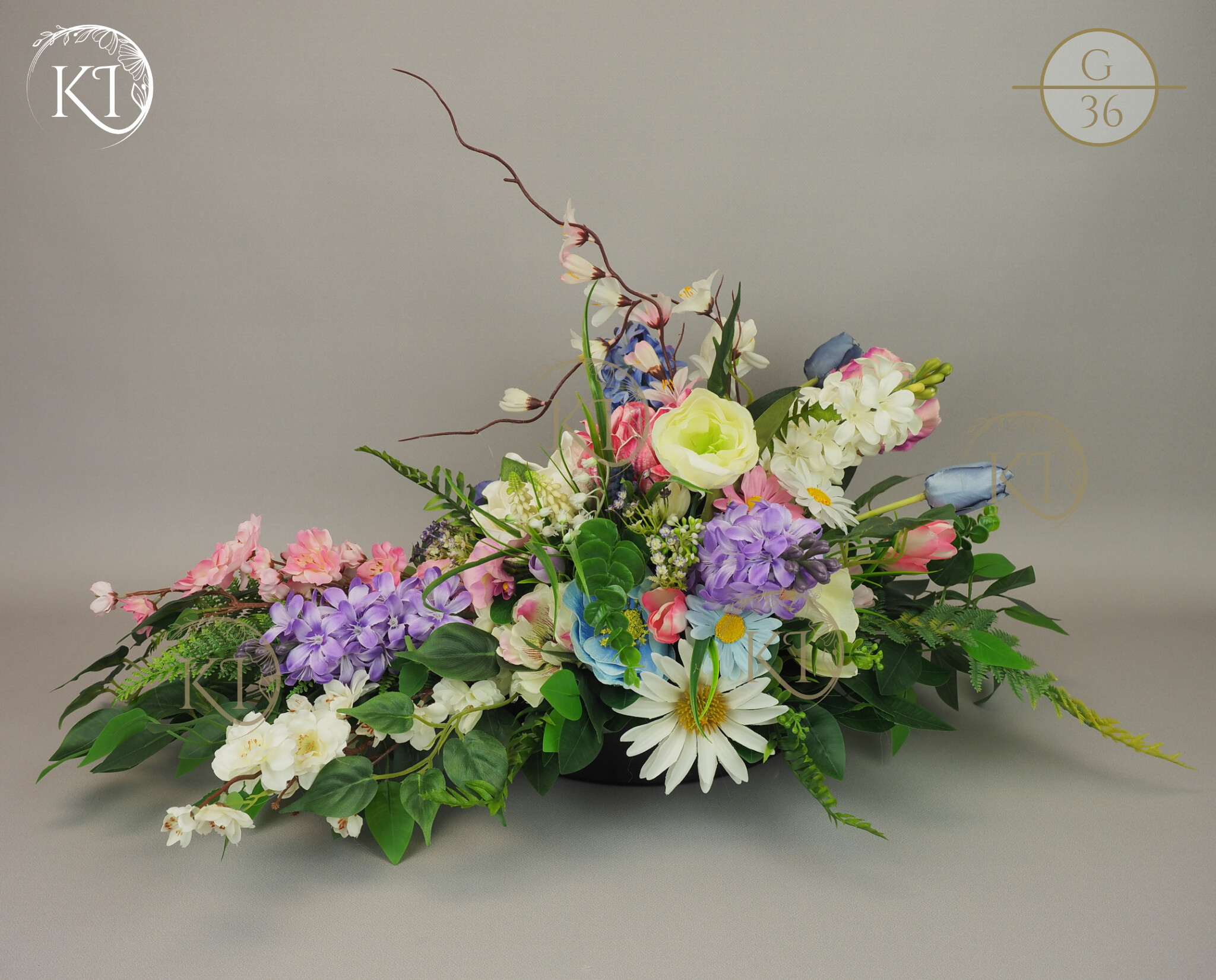 Tradycyjna Dekoracja nagrobna, w formie wiązanki, w obciążonej plastikowej podstawie, wykonana z gałązek i kwiatów sztucznych satynowych i piankowych wysokiej jakości, wykonana z dbałością o detale.