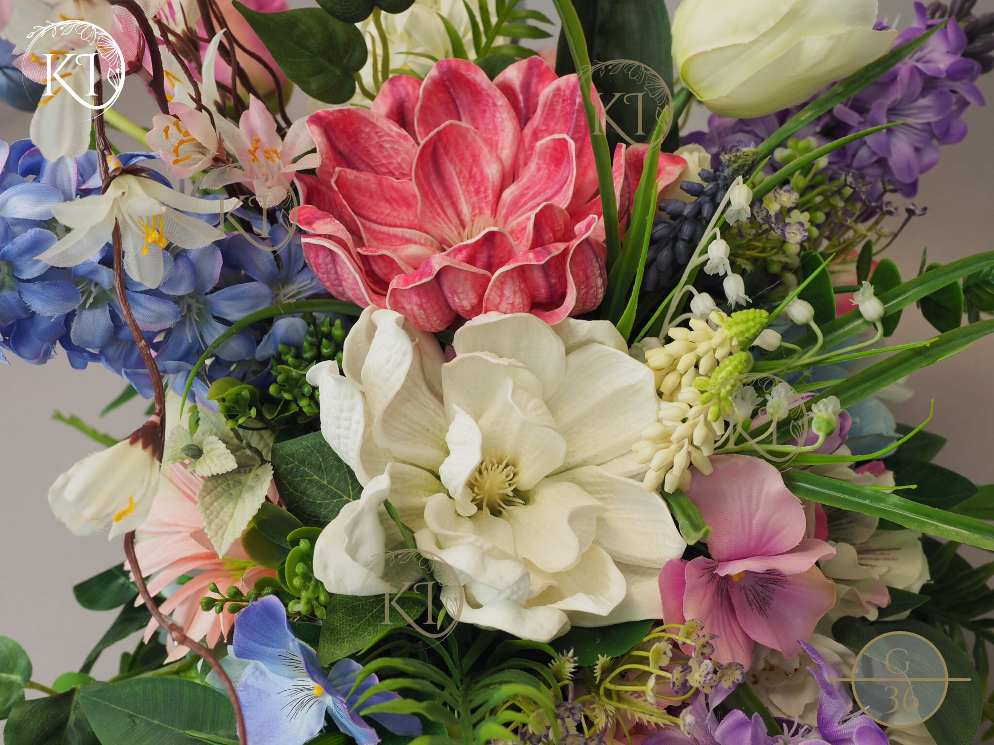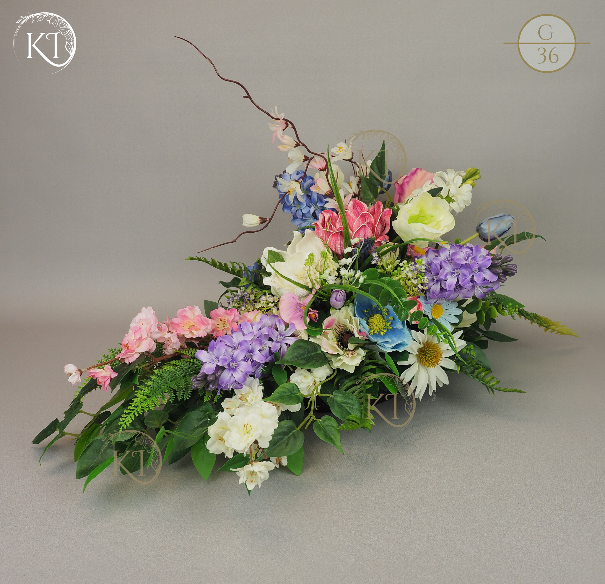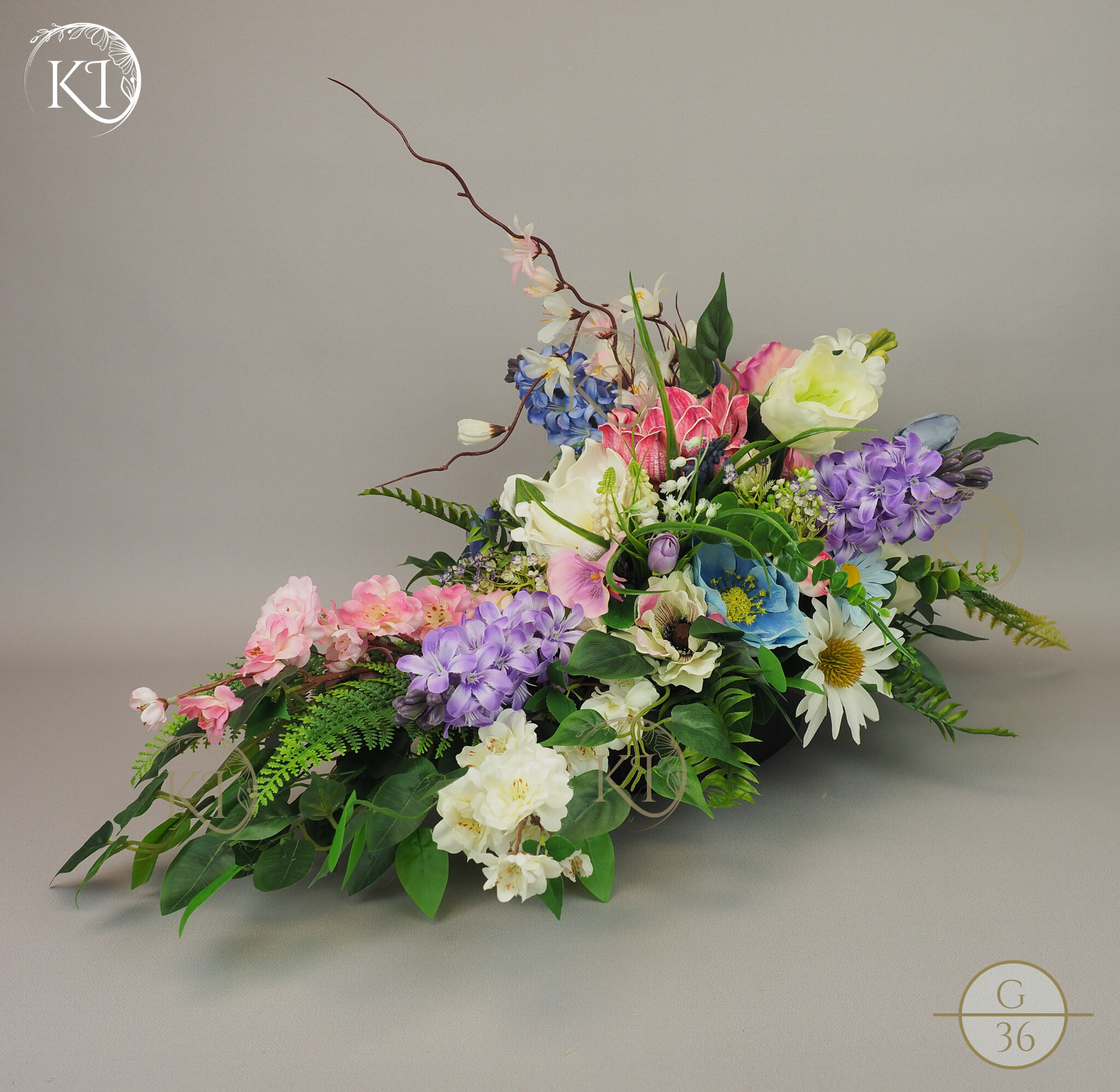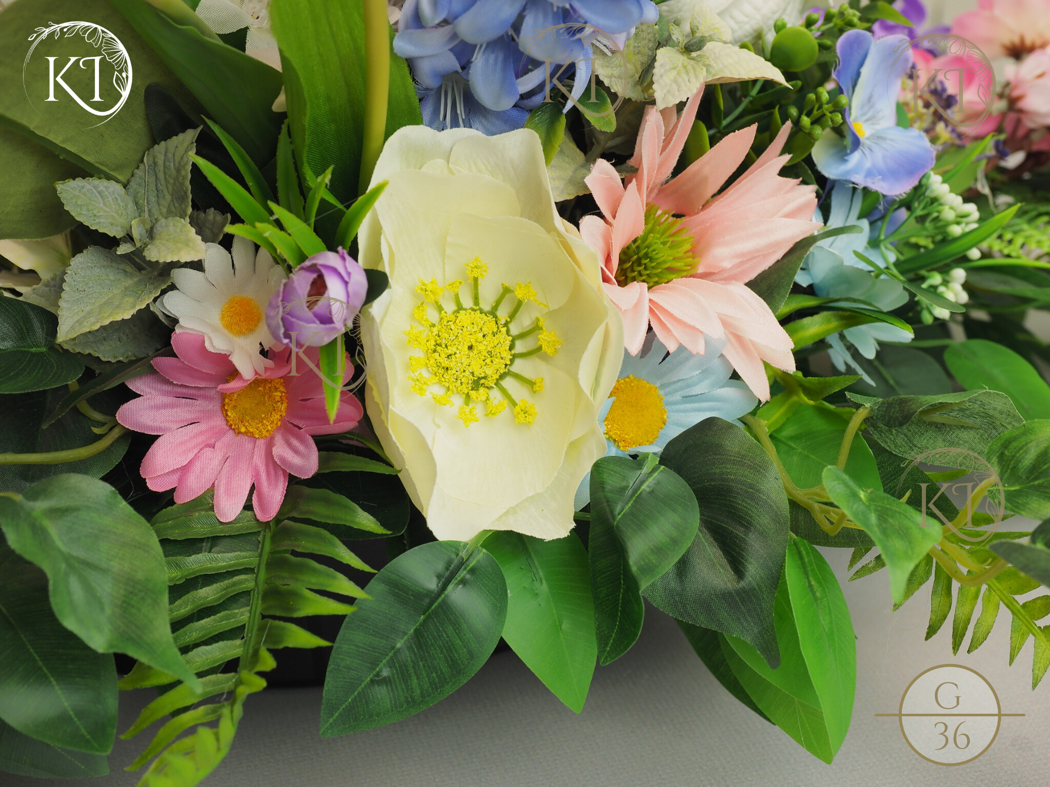 Tradycyjna Dekoracja nagrobna, w formie wiązanki, w obciążonej plastikowej podstawie, wykonana z gałązek i kwiatów sztucznych satynowych i piankowych wysokiej jakości, wykonana z dbałością o detale.