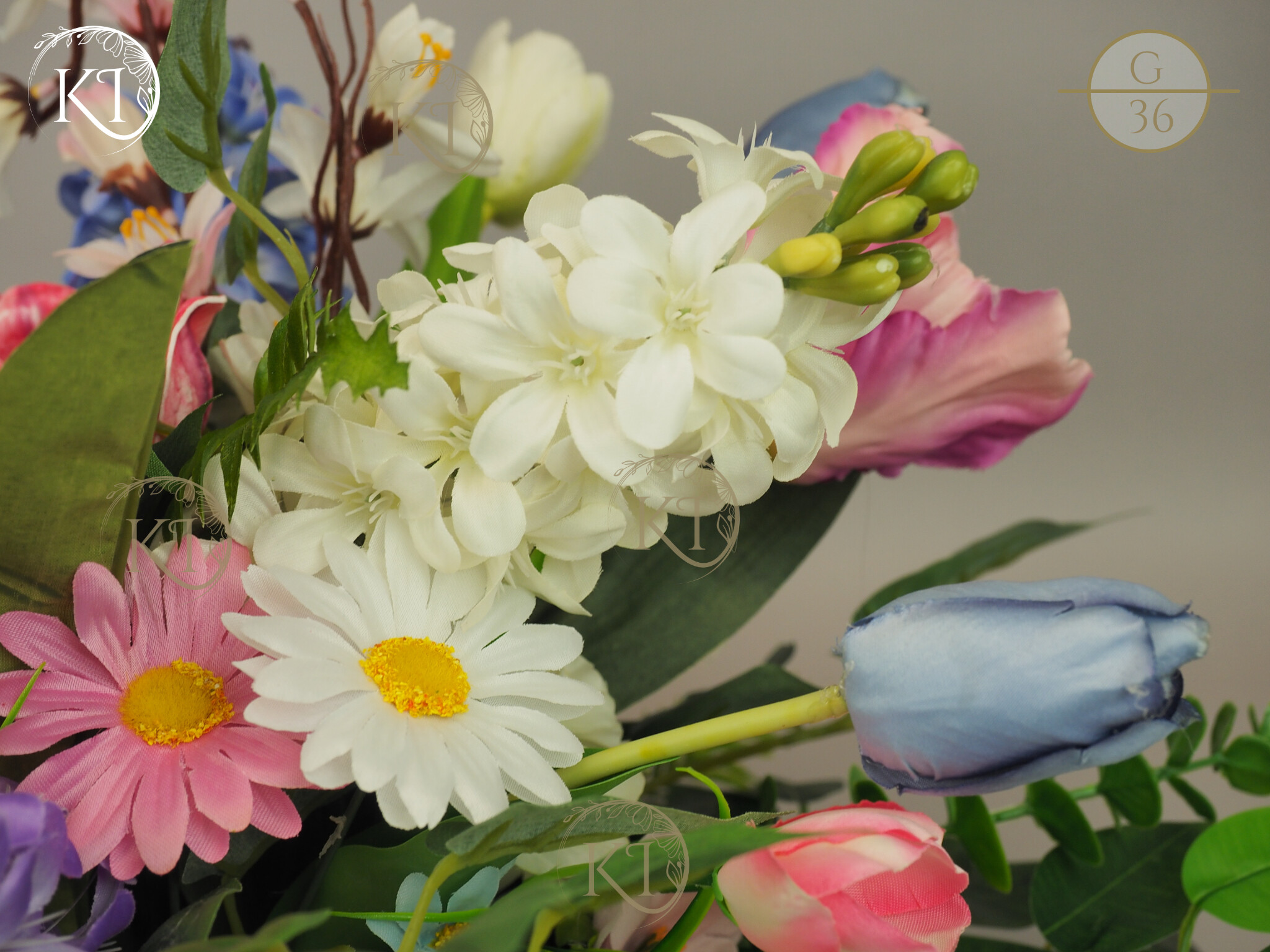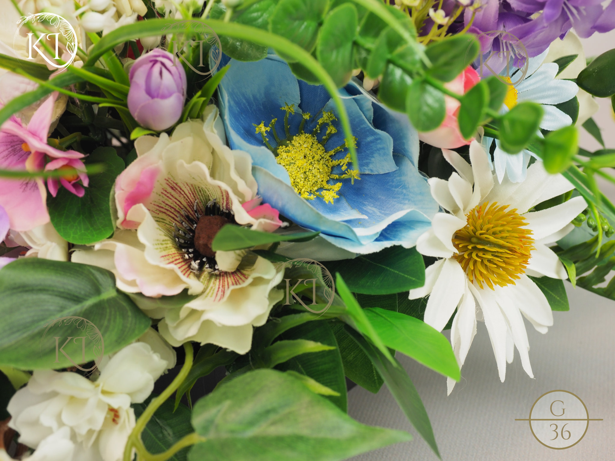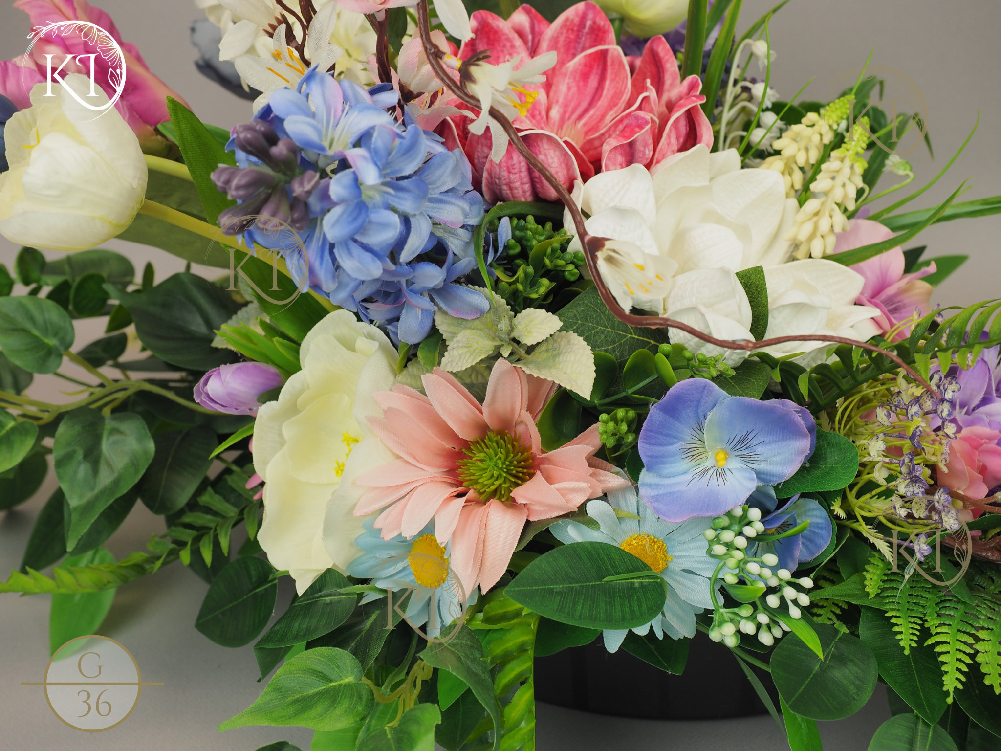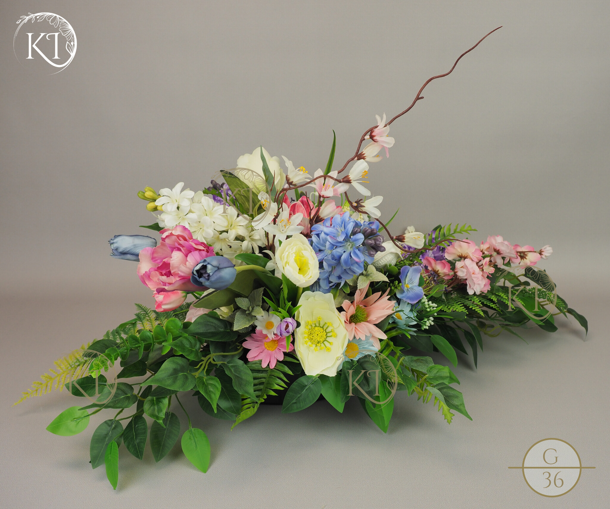 Tradycyjna Dekoracja nagrobna, w formie wiązanki, w obciążonej plastikowej podstawie, wykonana z gałązek i kwiatów sztucznych satynowych i piankowych wysokiej jakości, wykonana z dbałością o detale.