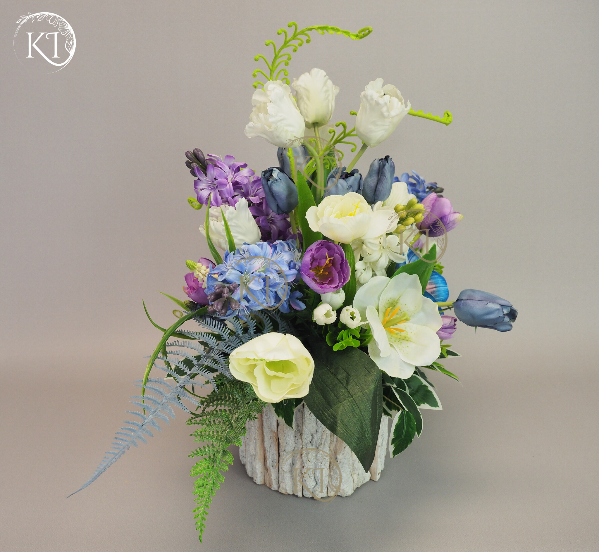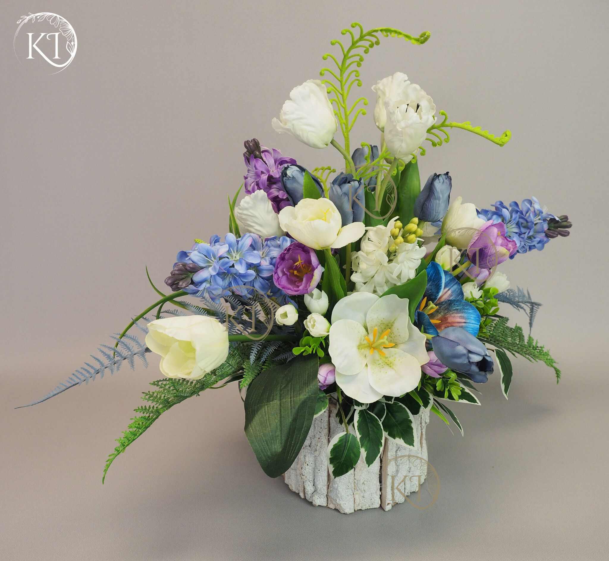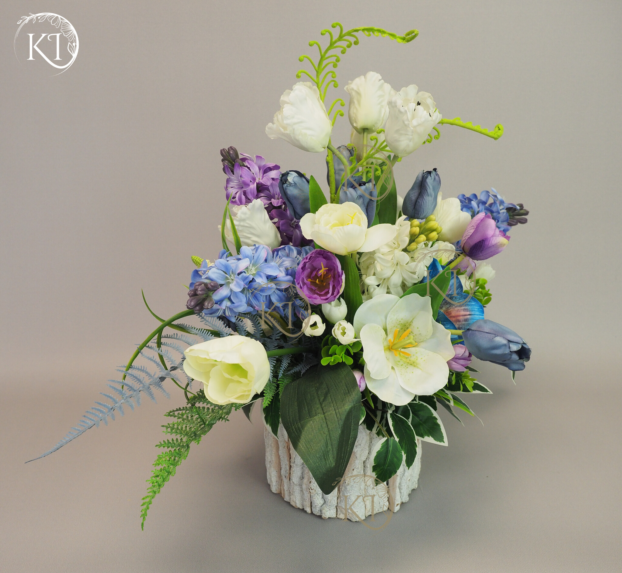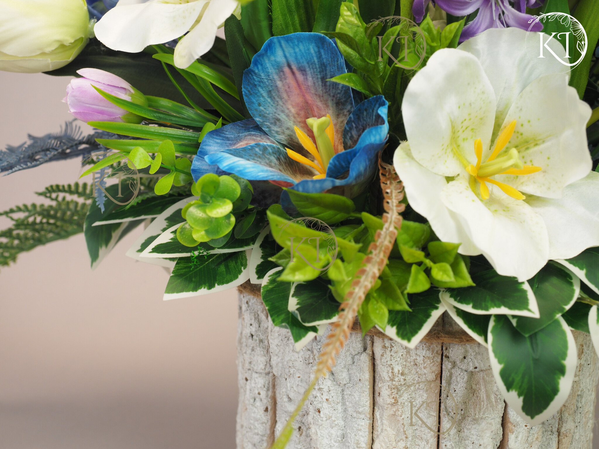Dekoracja z kwiatów sztucznych wysokiej jakości , w obciążonej, okrągłej podstawie z kory naturalnej.