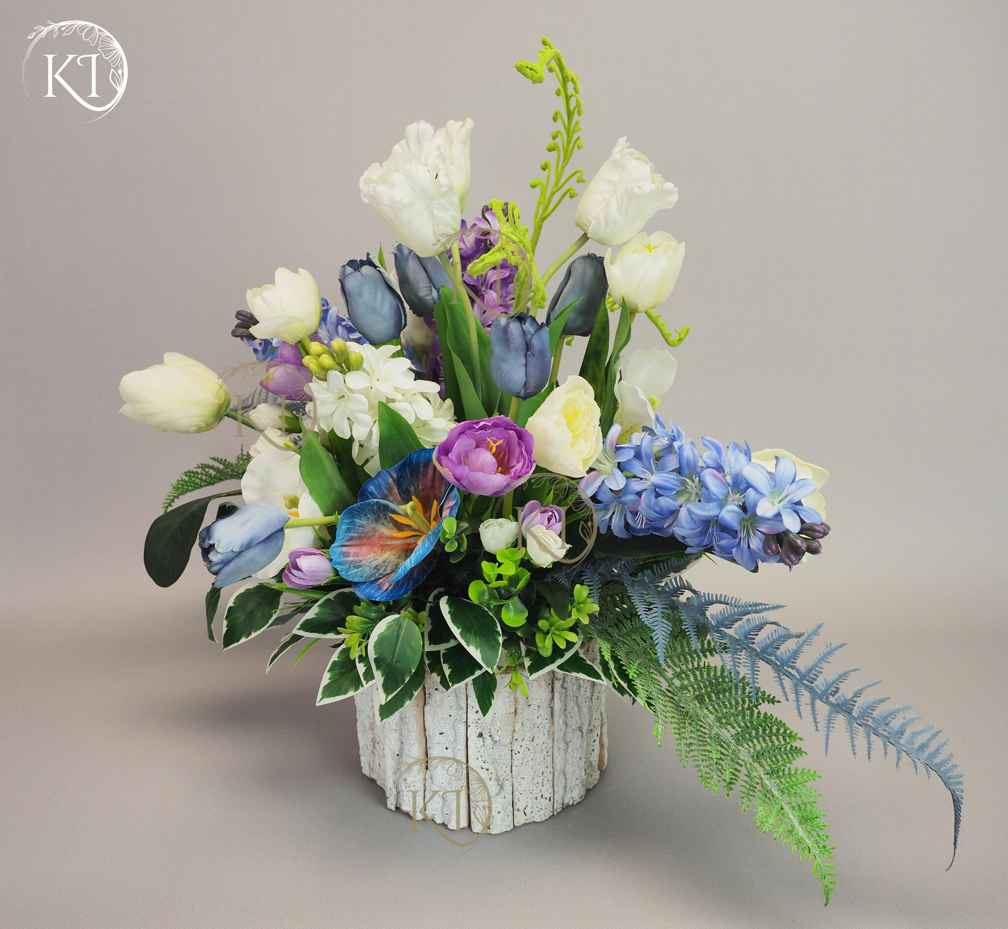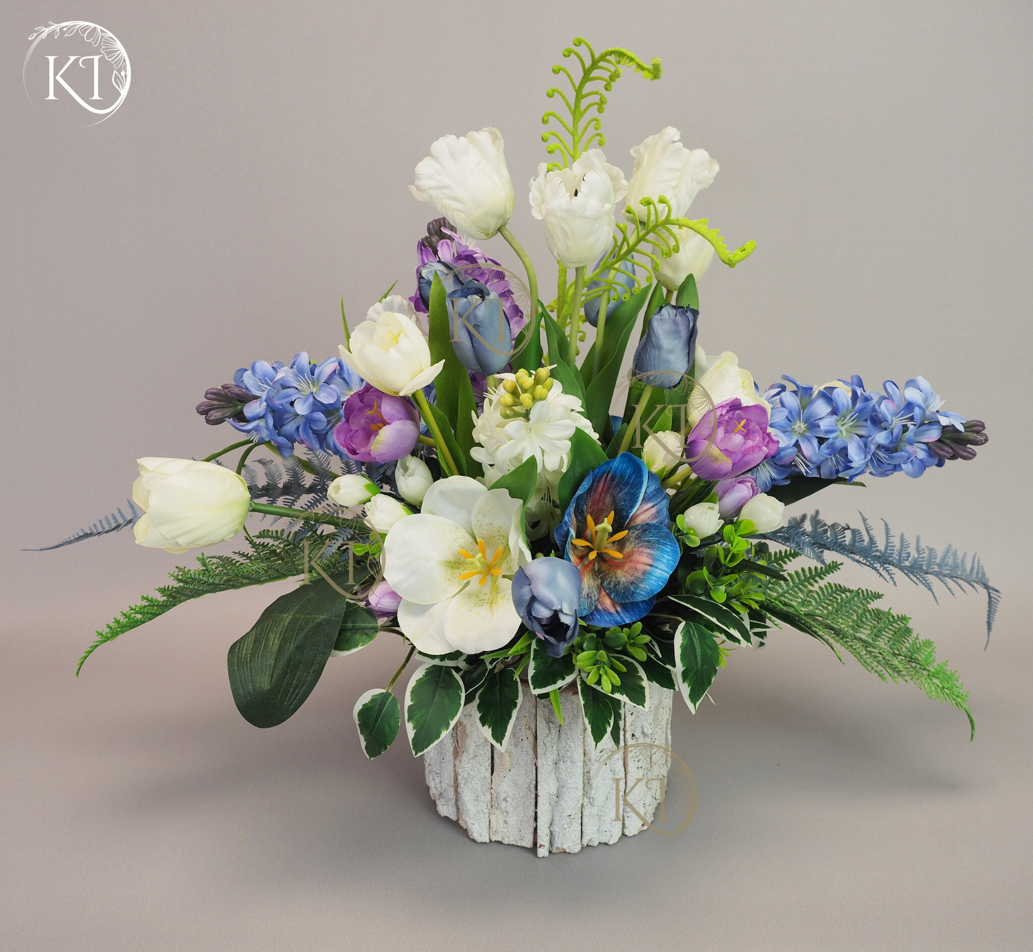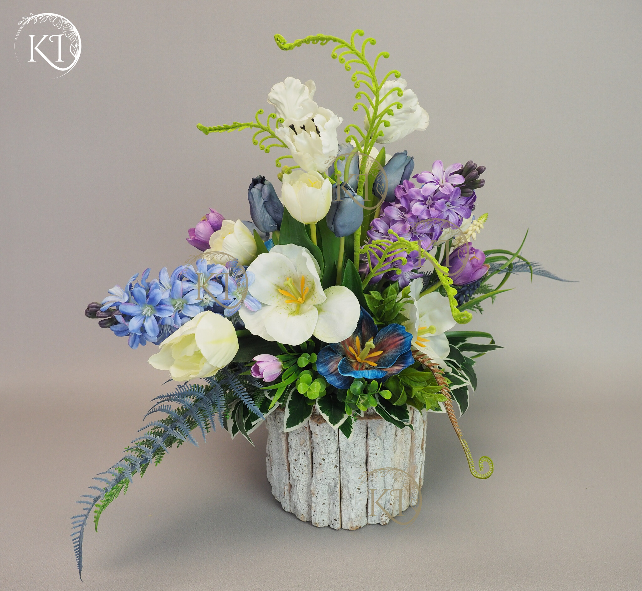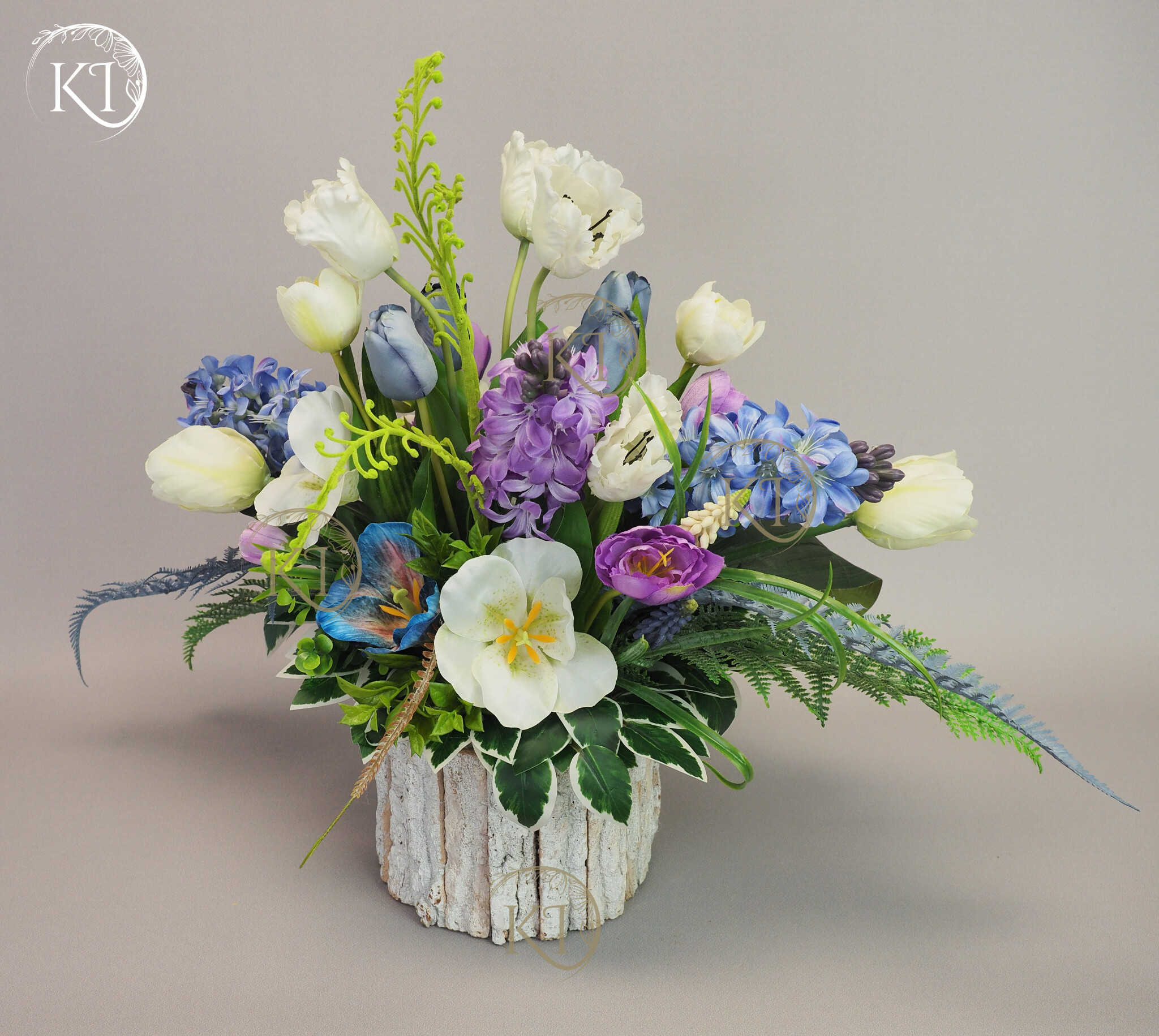 Dekoracja z kwiatów sztucznych wysokiej jakości , w obciążonej, okrągłej podstawie z kory naturalnej.
