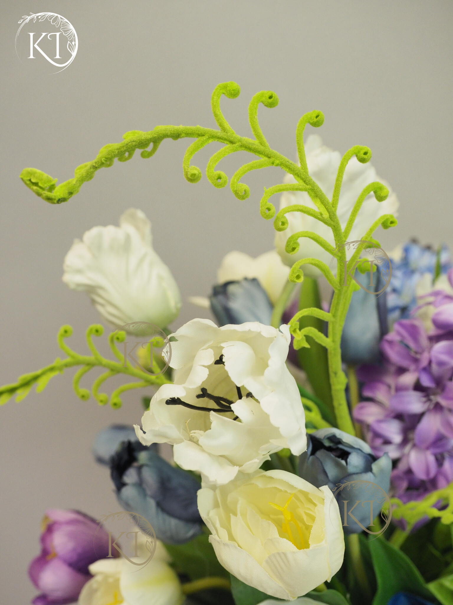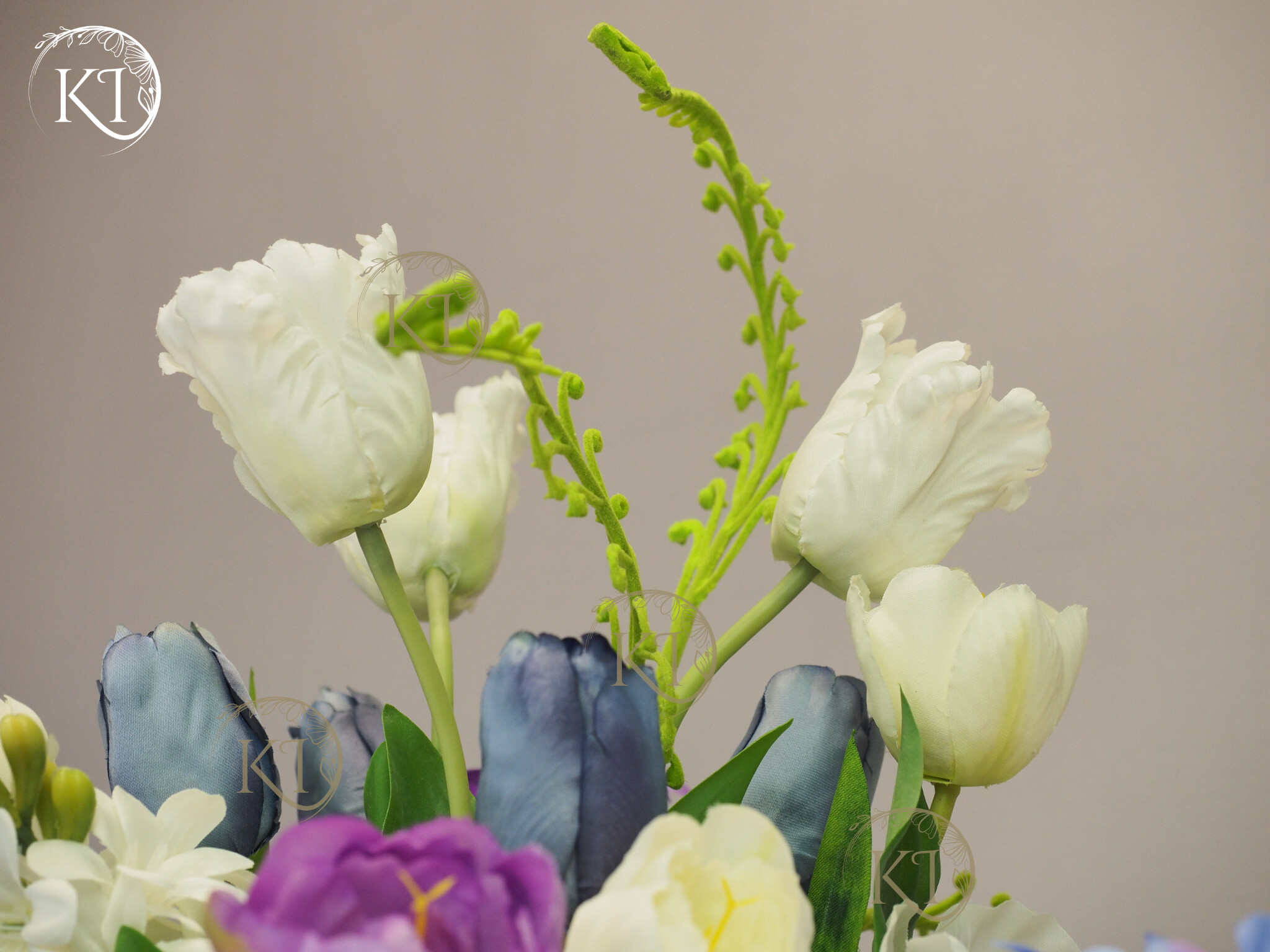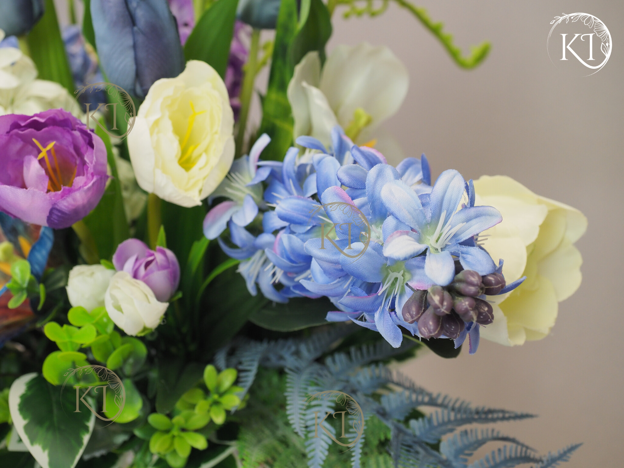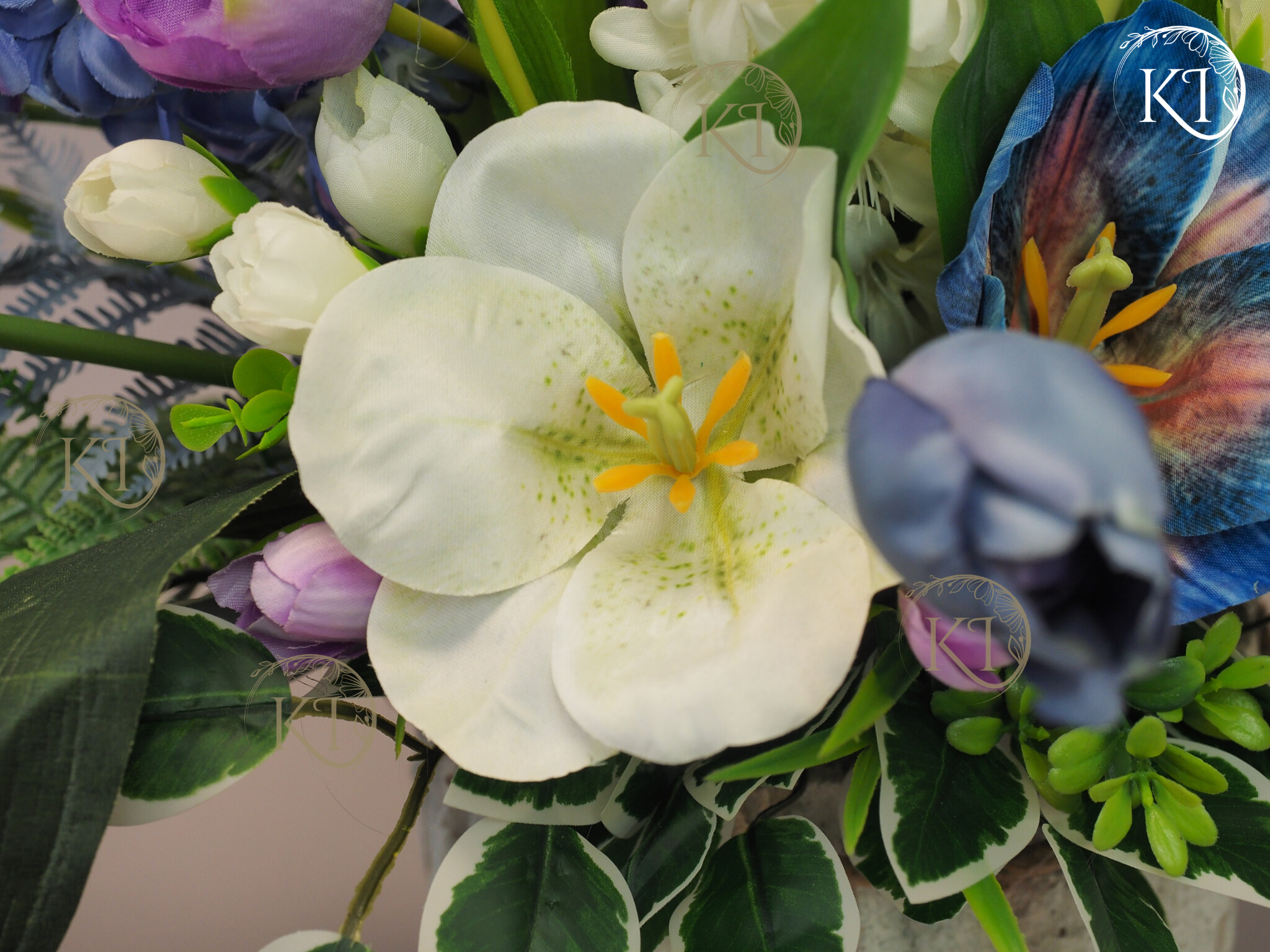 Ta uniwersalna kompozycja kwiatowa może być wykorzystana jako stroik na grób, lub dekoracja wnętrza domu, lub biura.