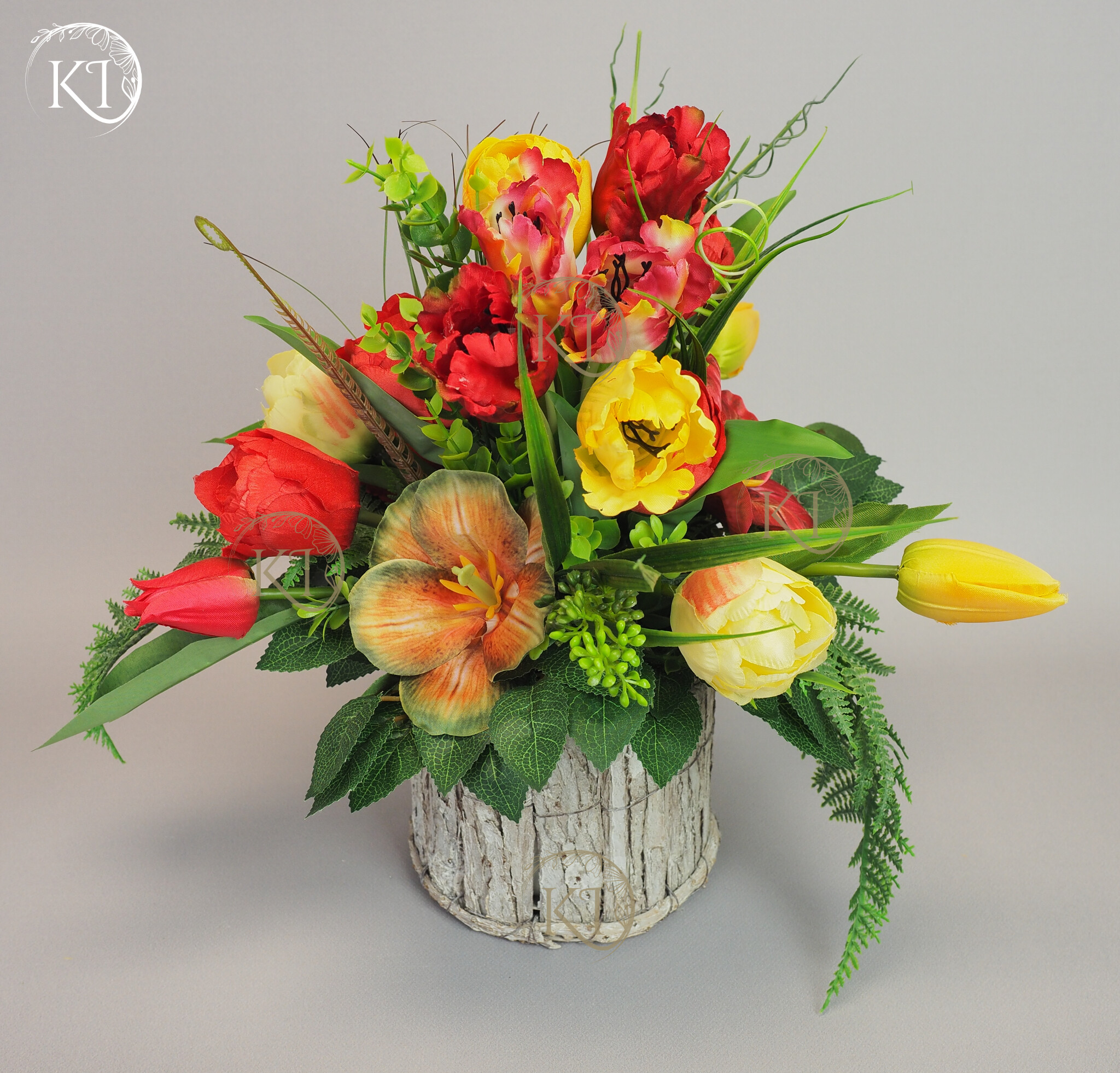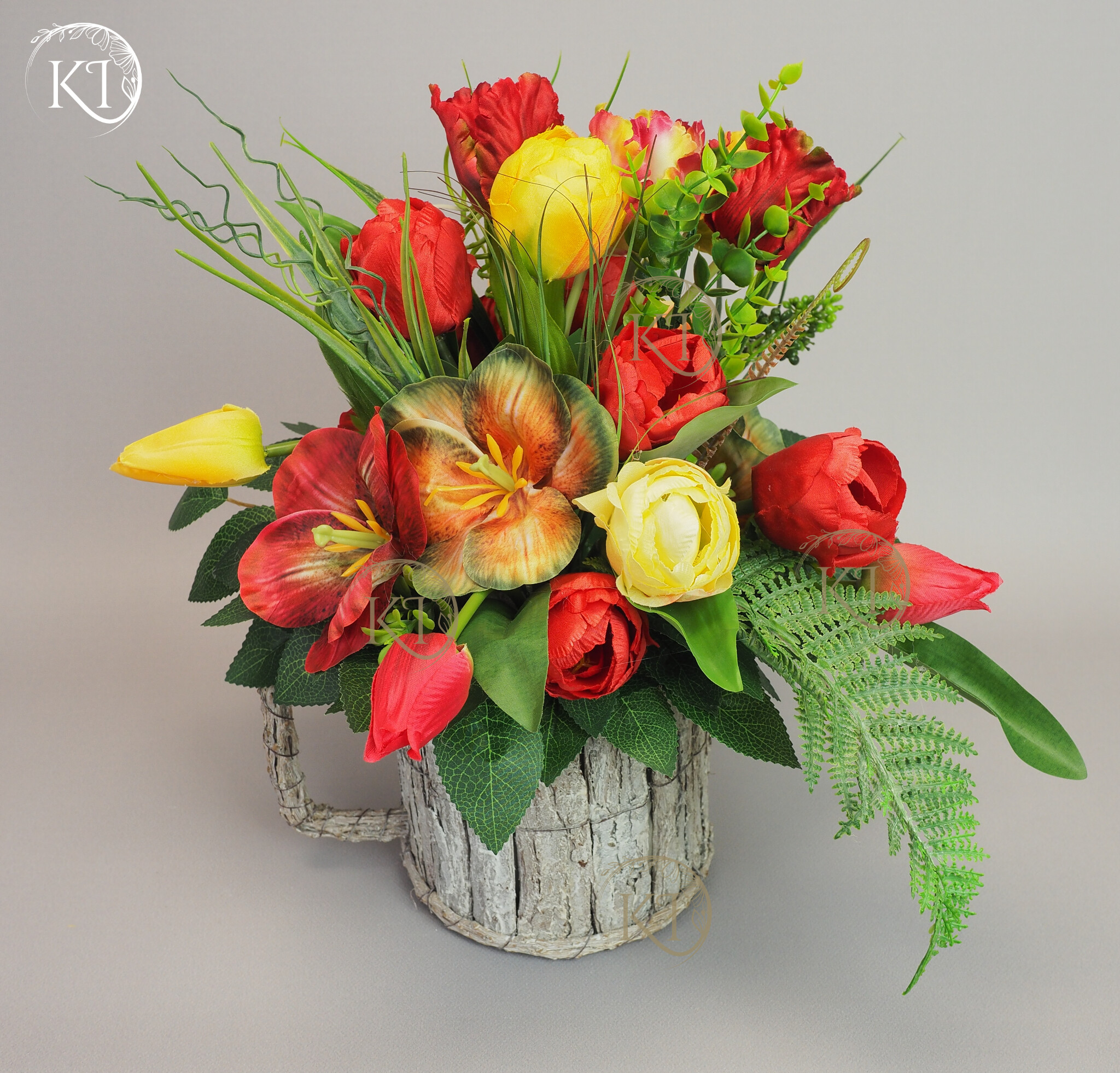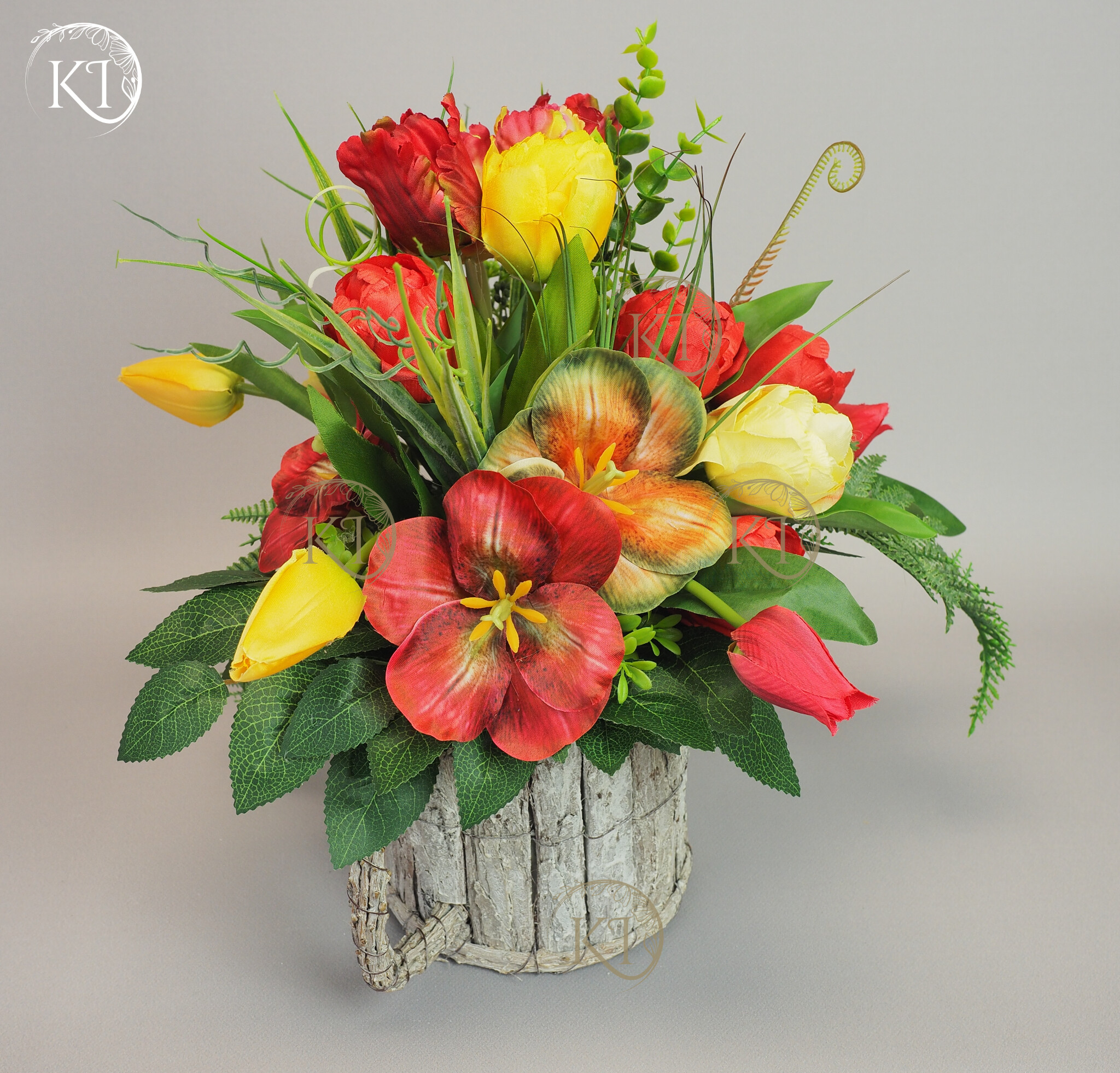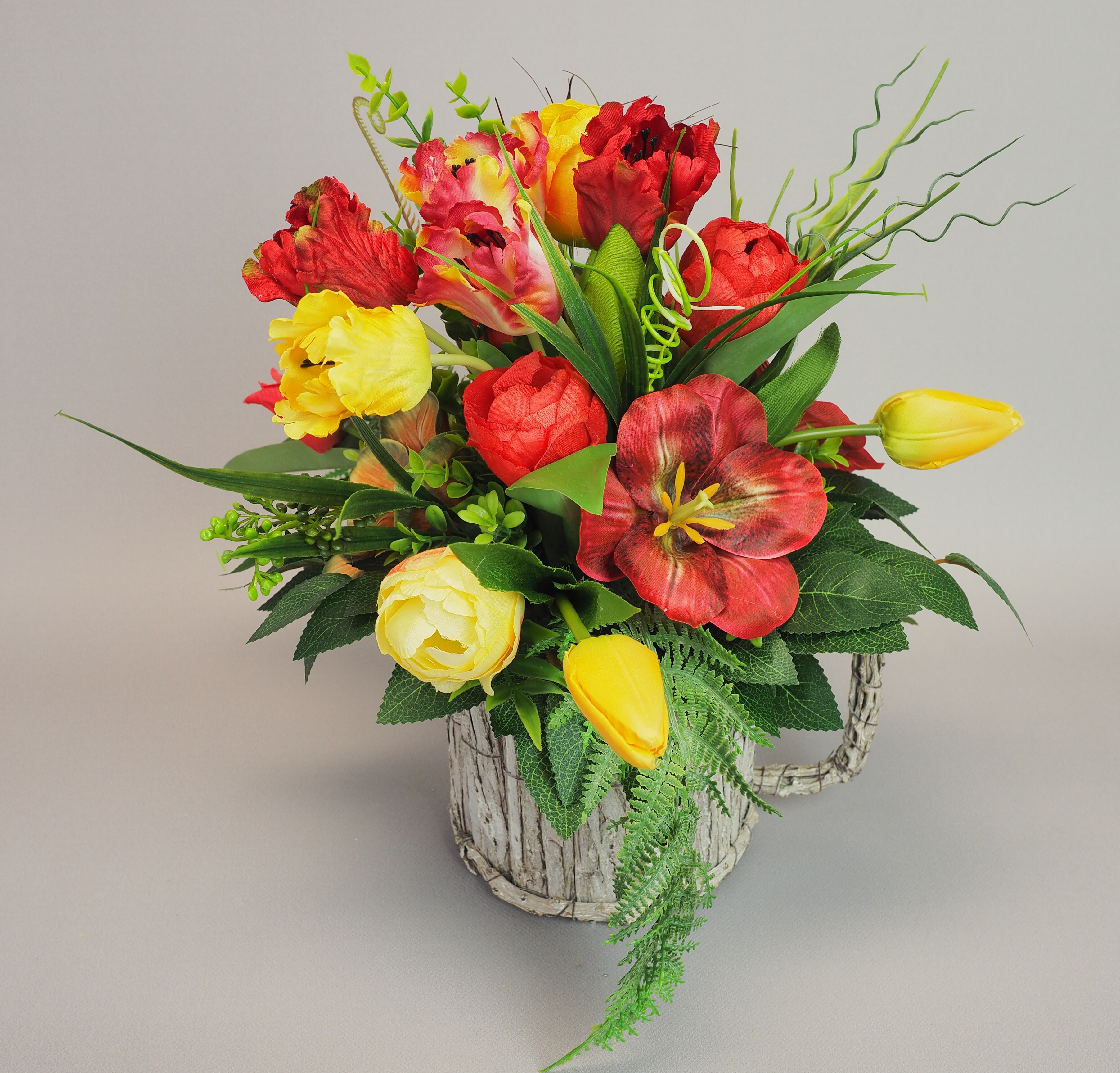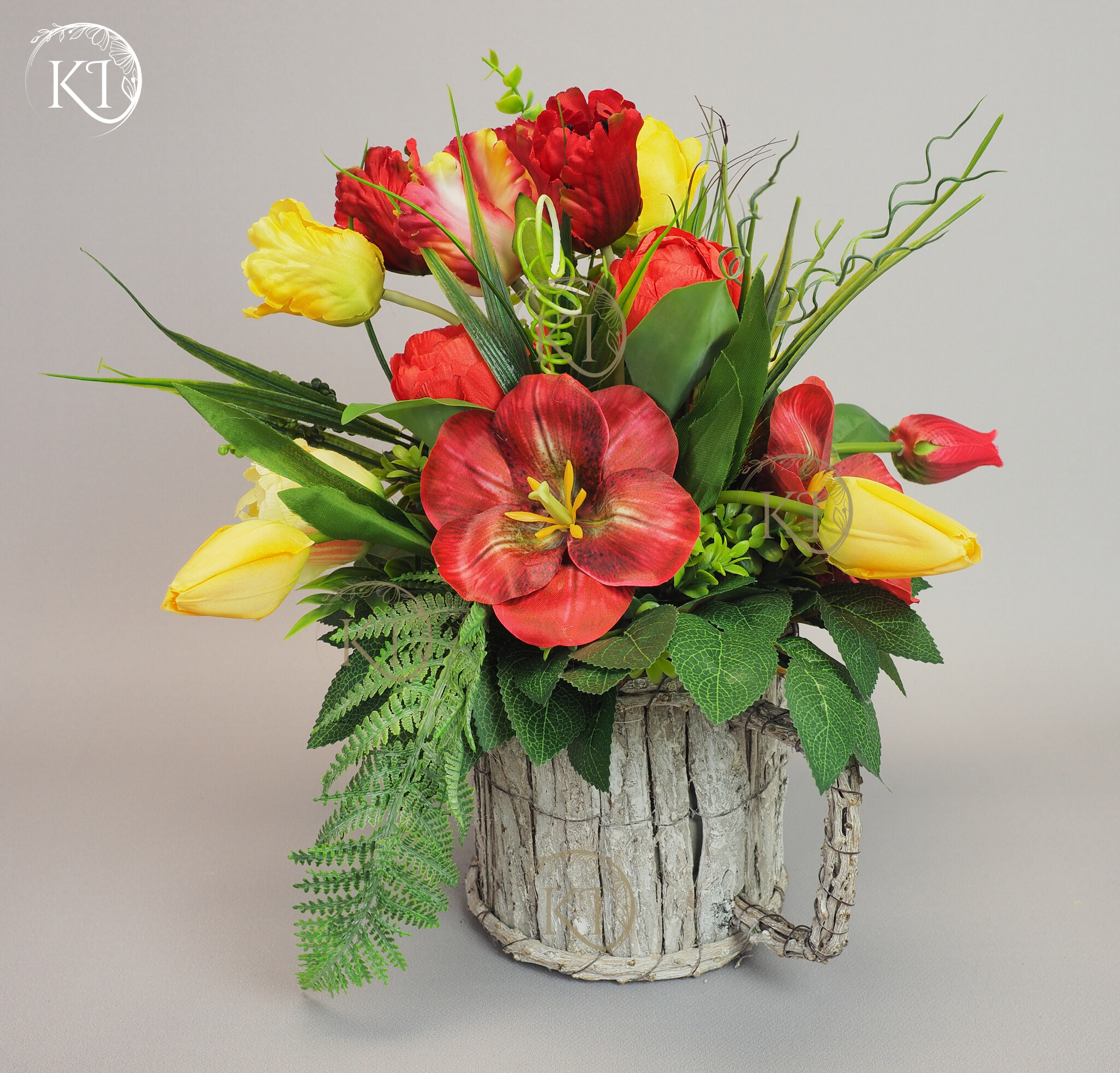 Stroik, Dekoracja ze sztucznych tulipanów w obciążonej podstawie, imitującej kubek z uchem.
