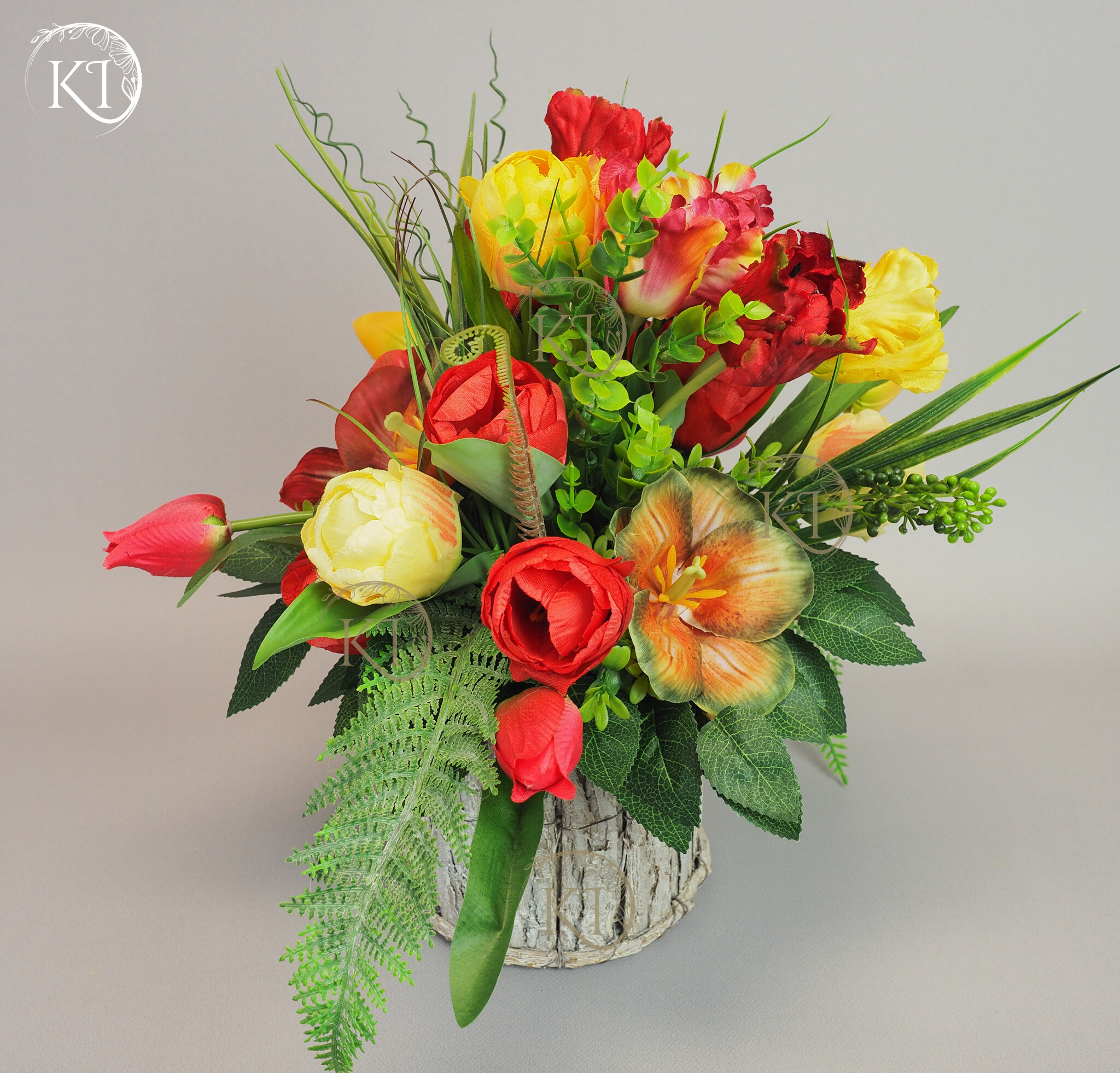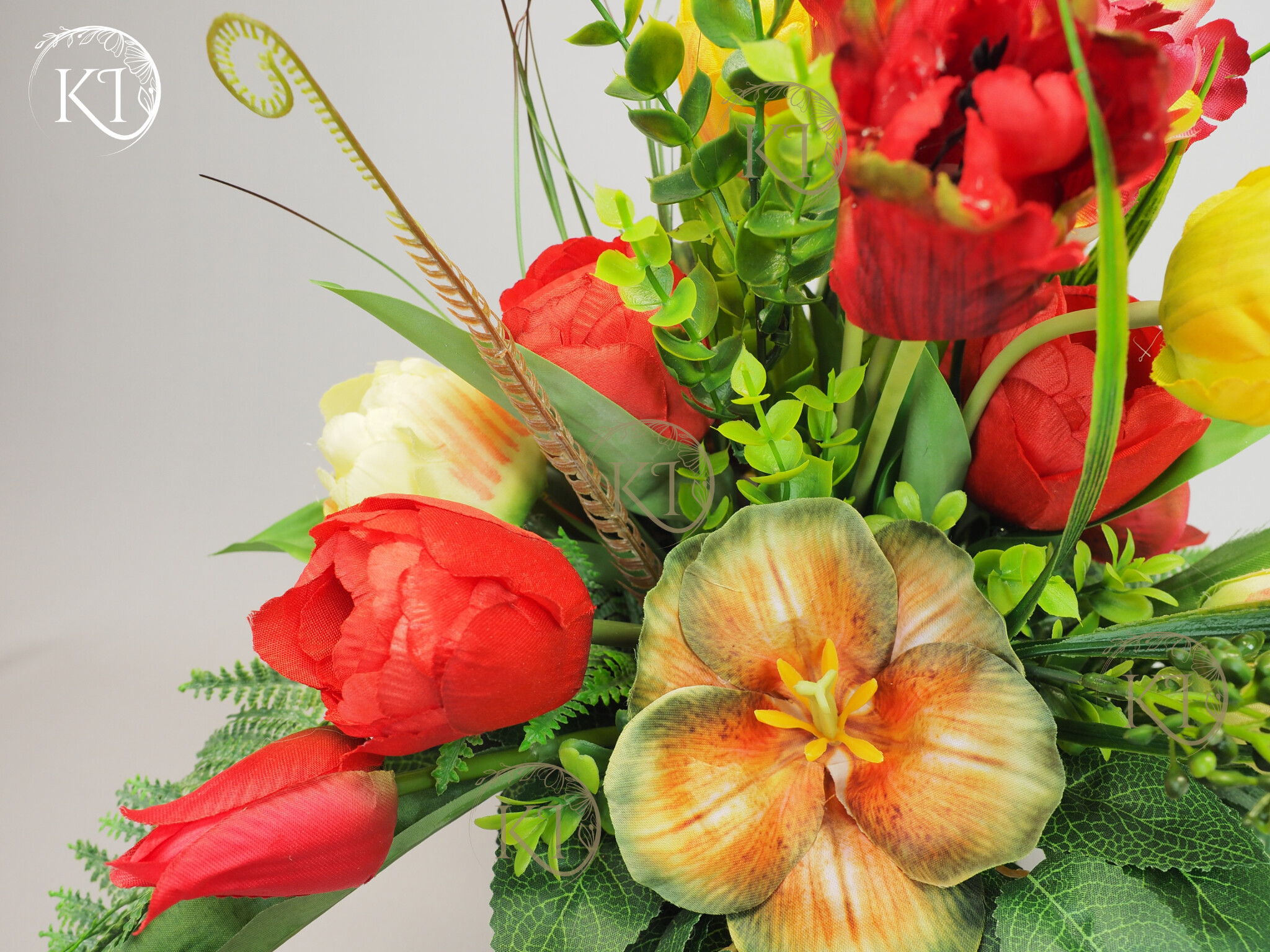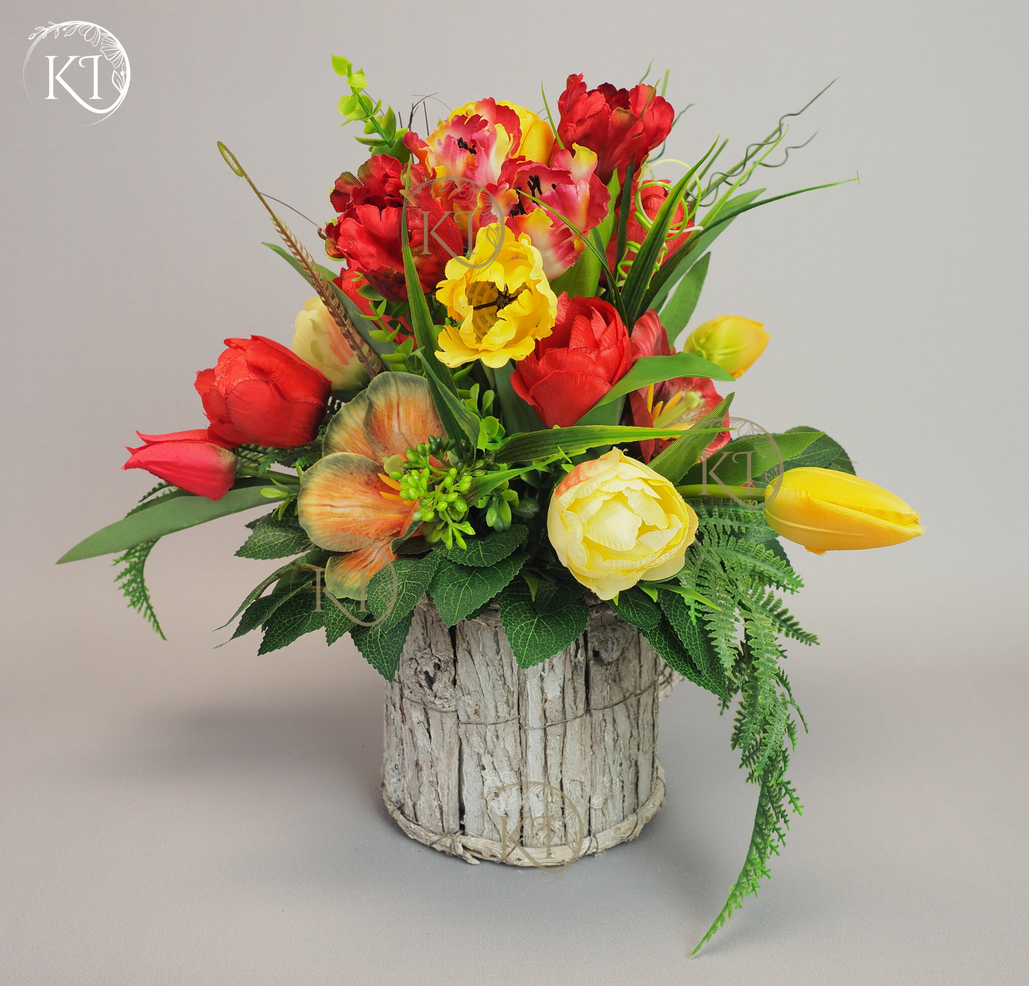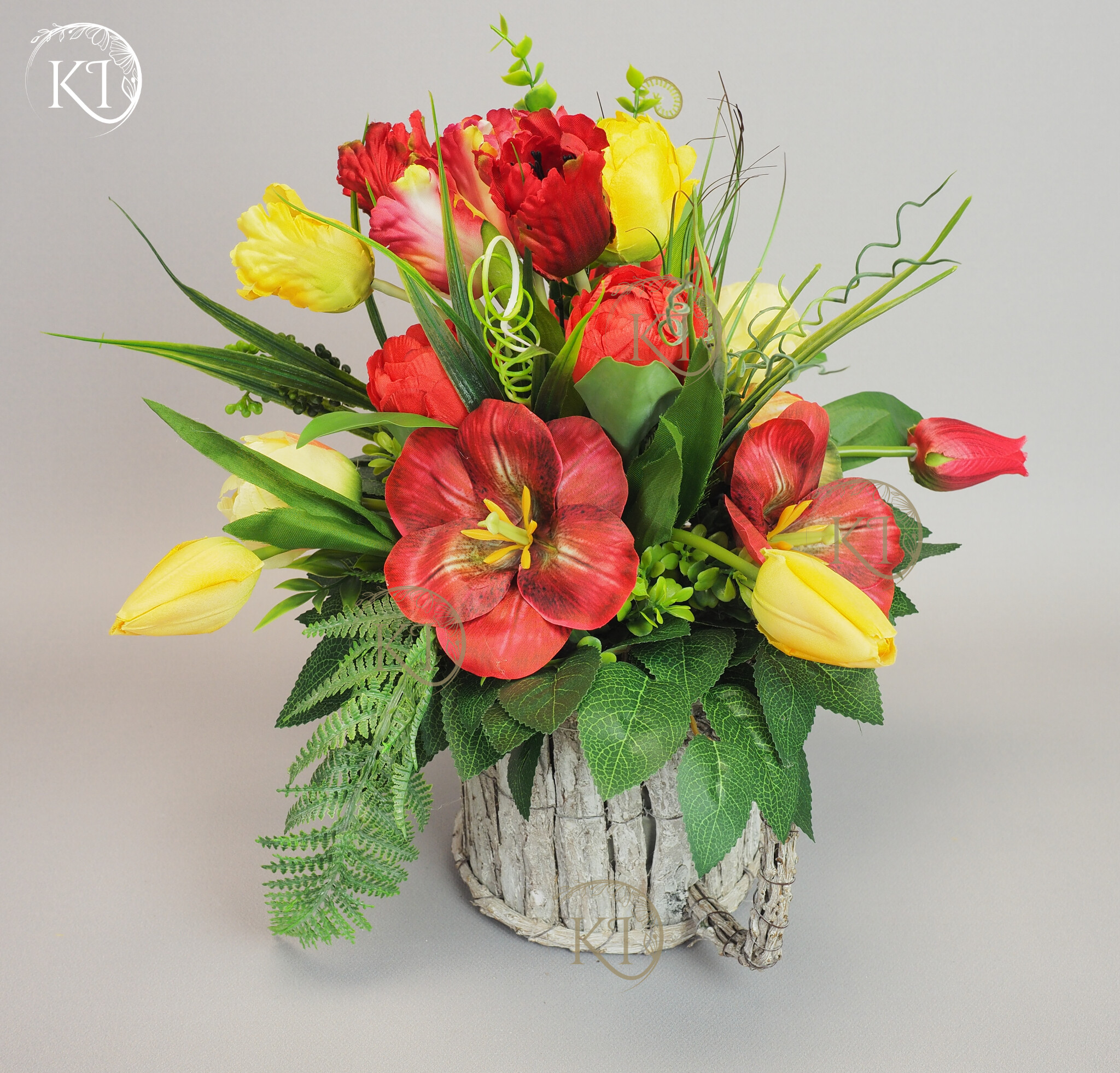Stroik, Dekoracja ze sztucznych tulipanów w obciążonej podstawie, imitującej kubek z uchem.