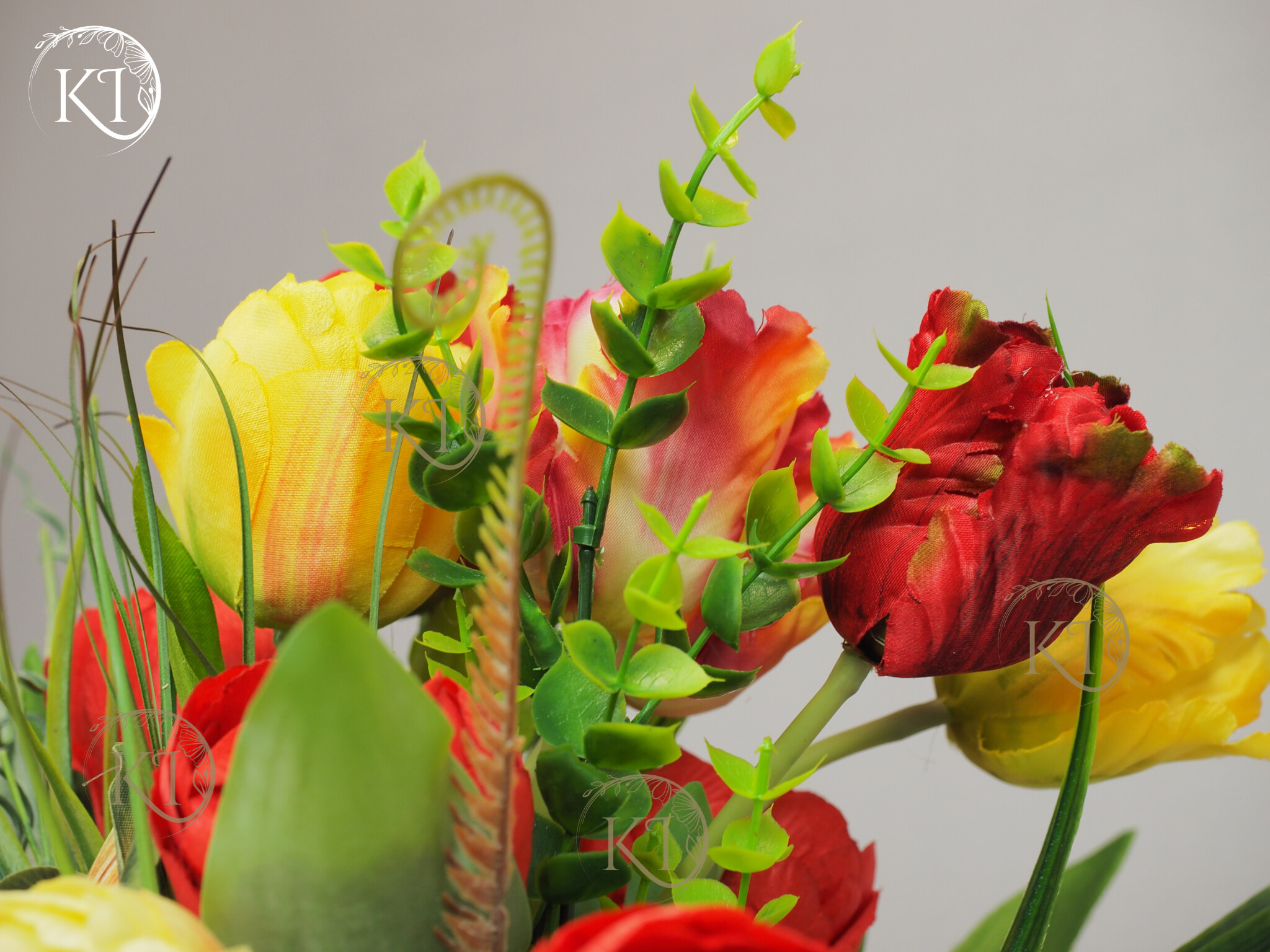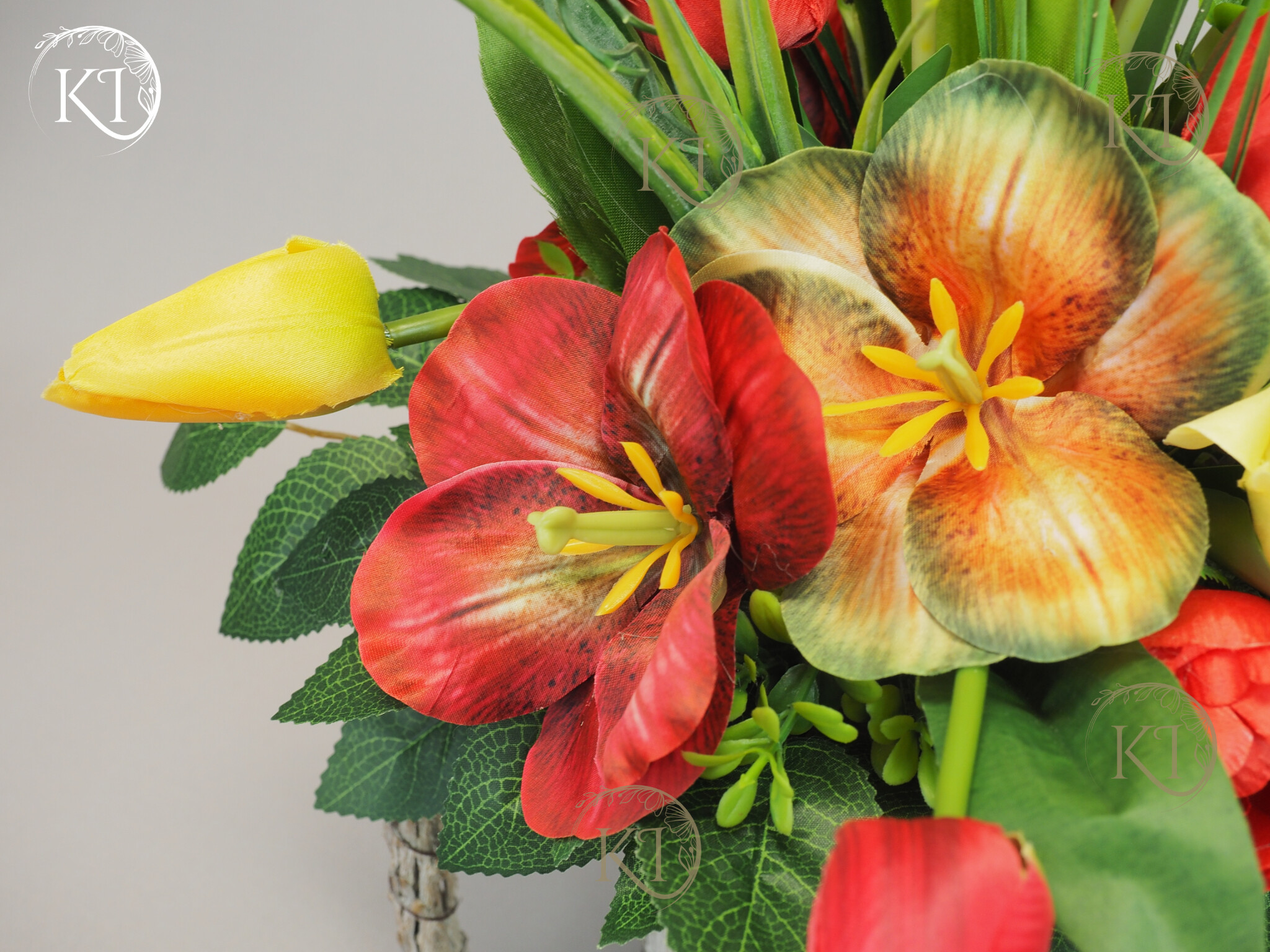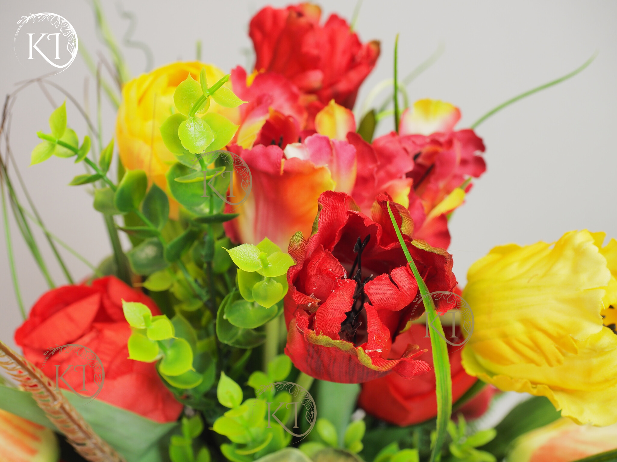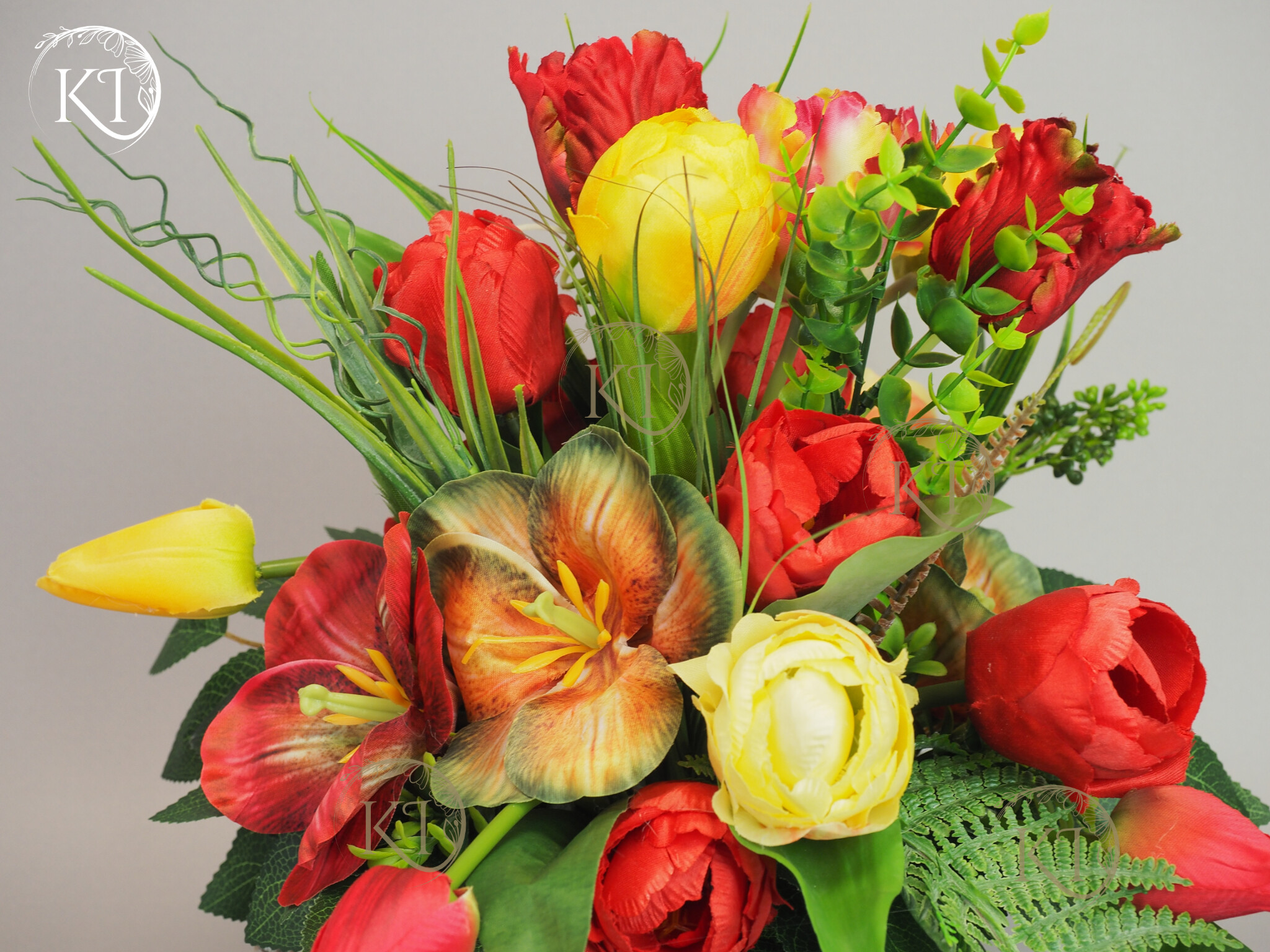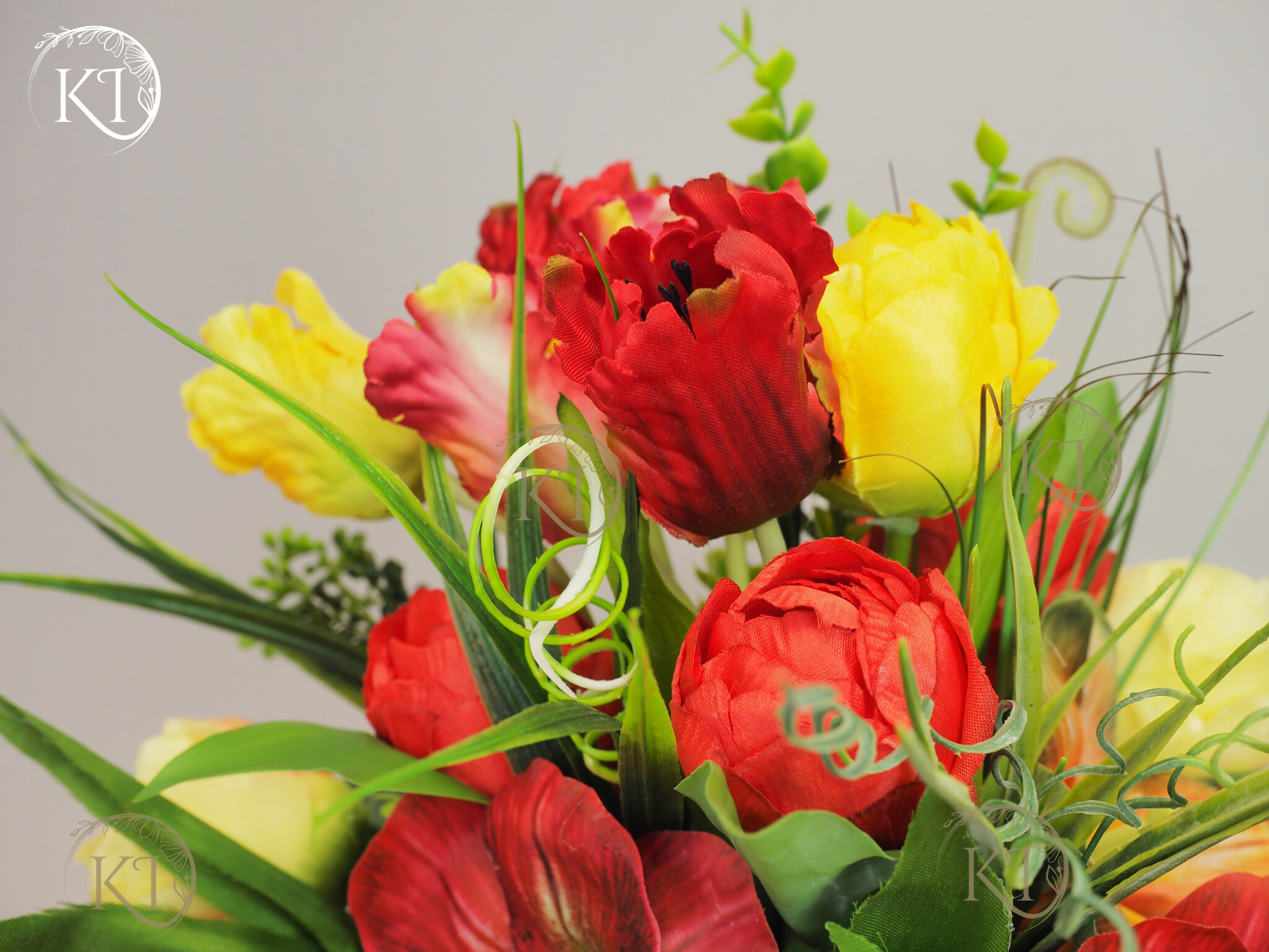 Stroik, Dekoracja ze sztucznych tulipanów w obciążonej podstawie, imitującej kubek z uchem.