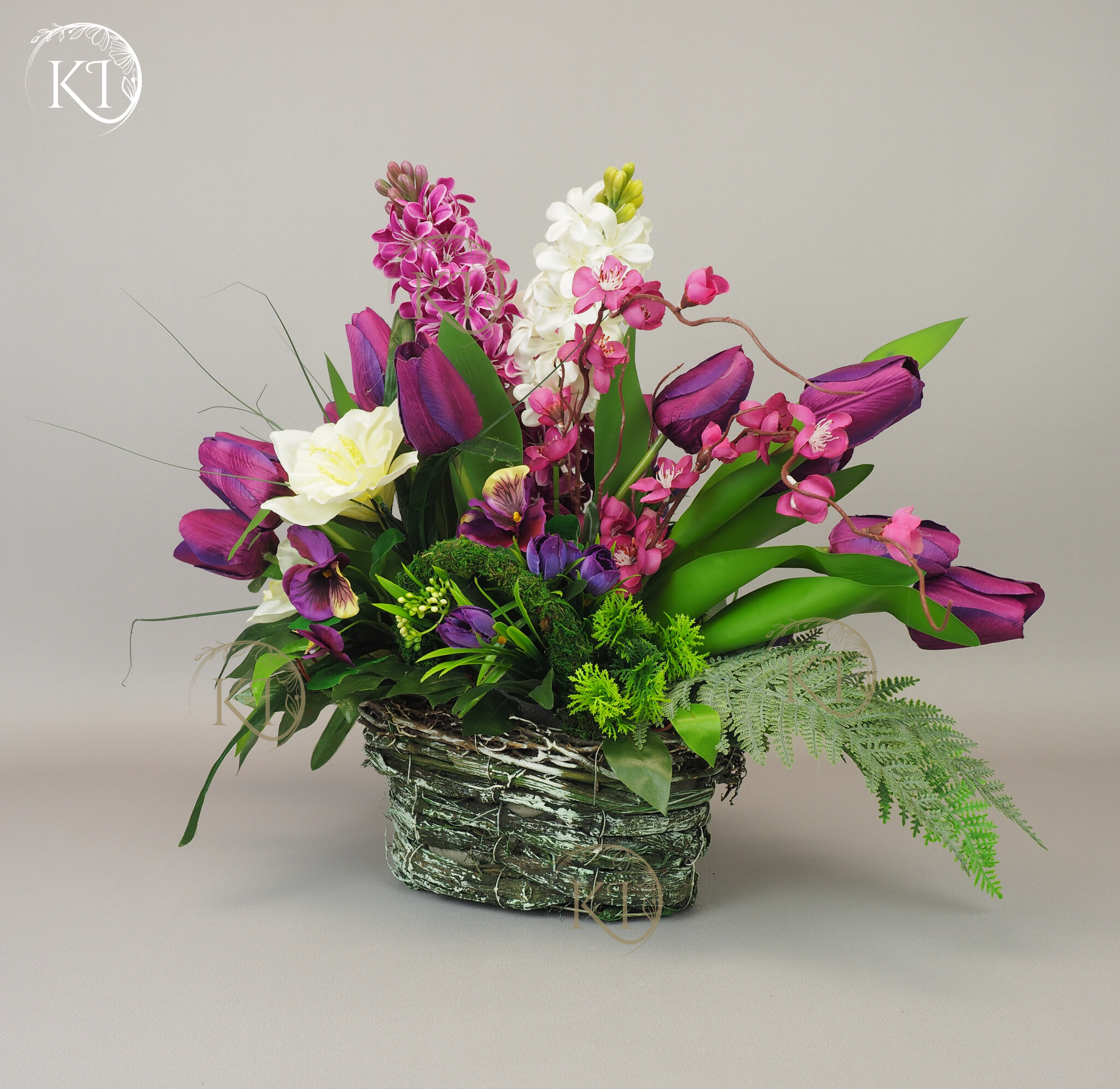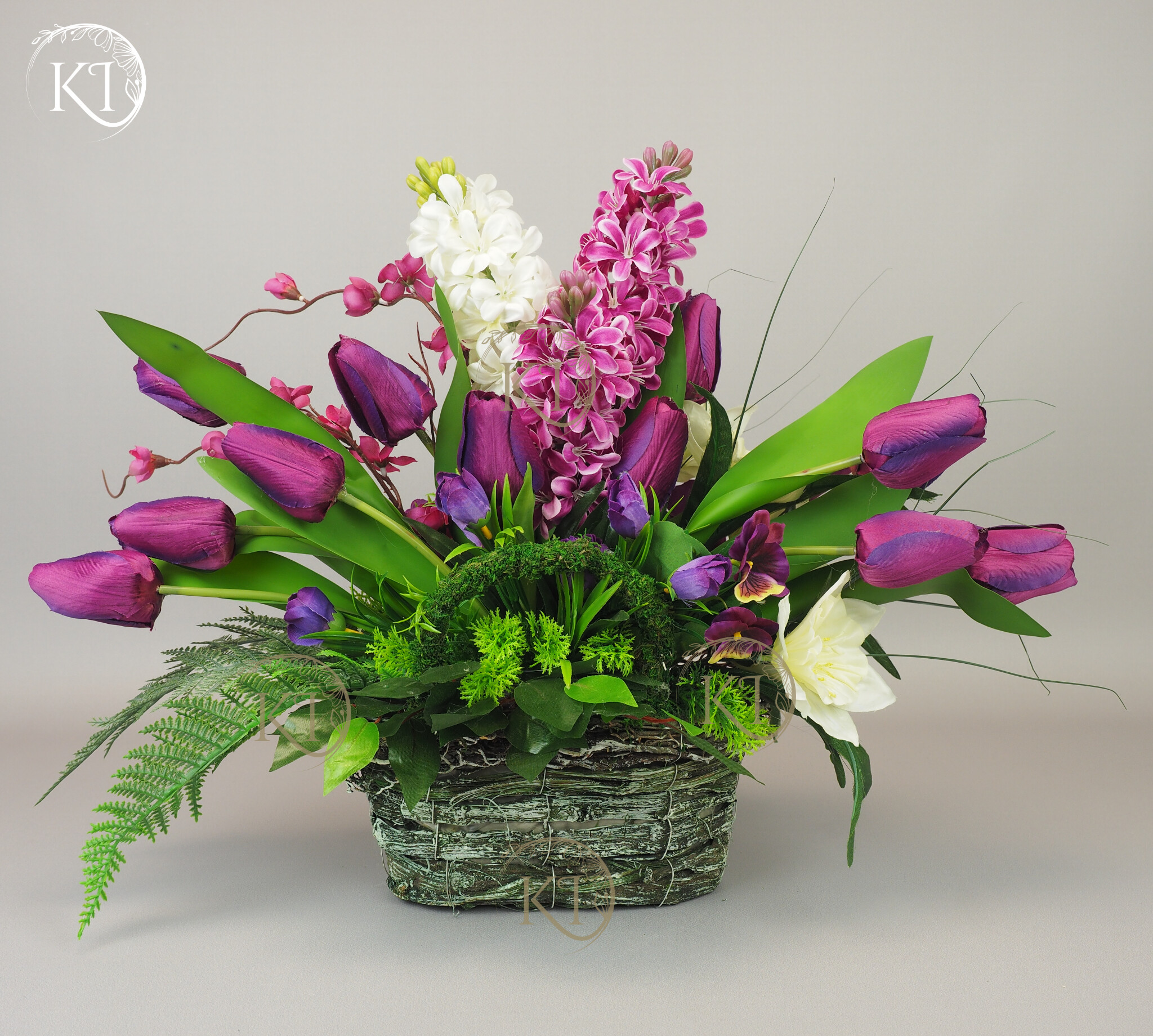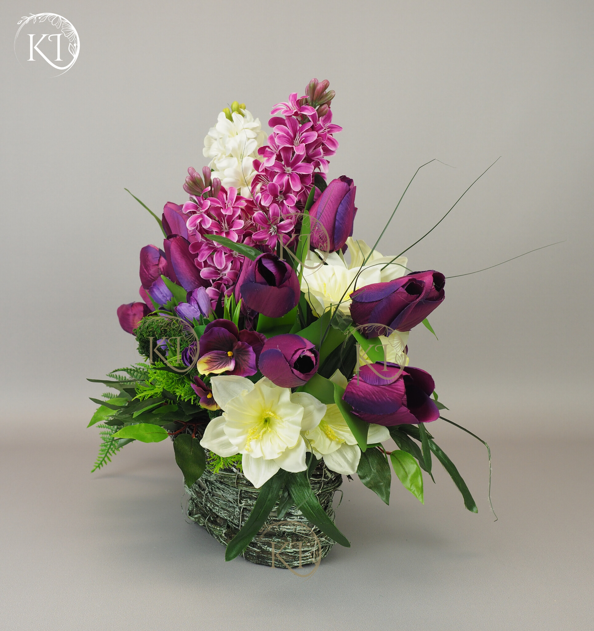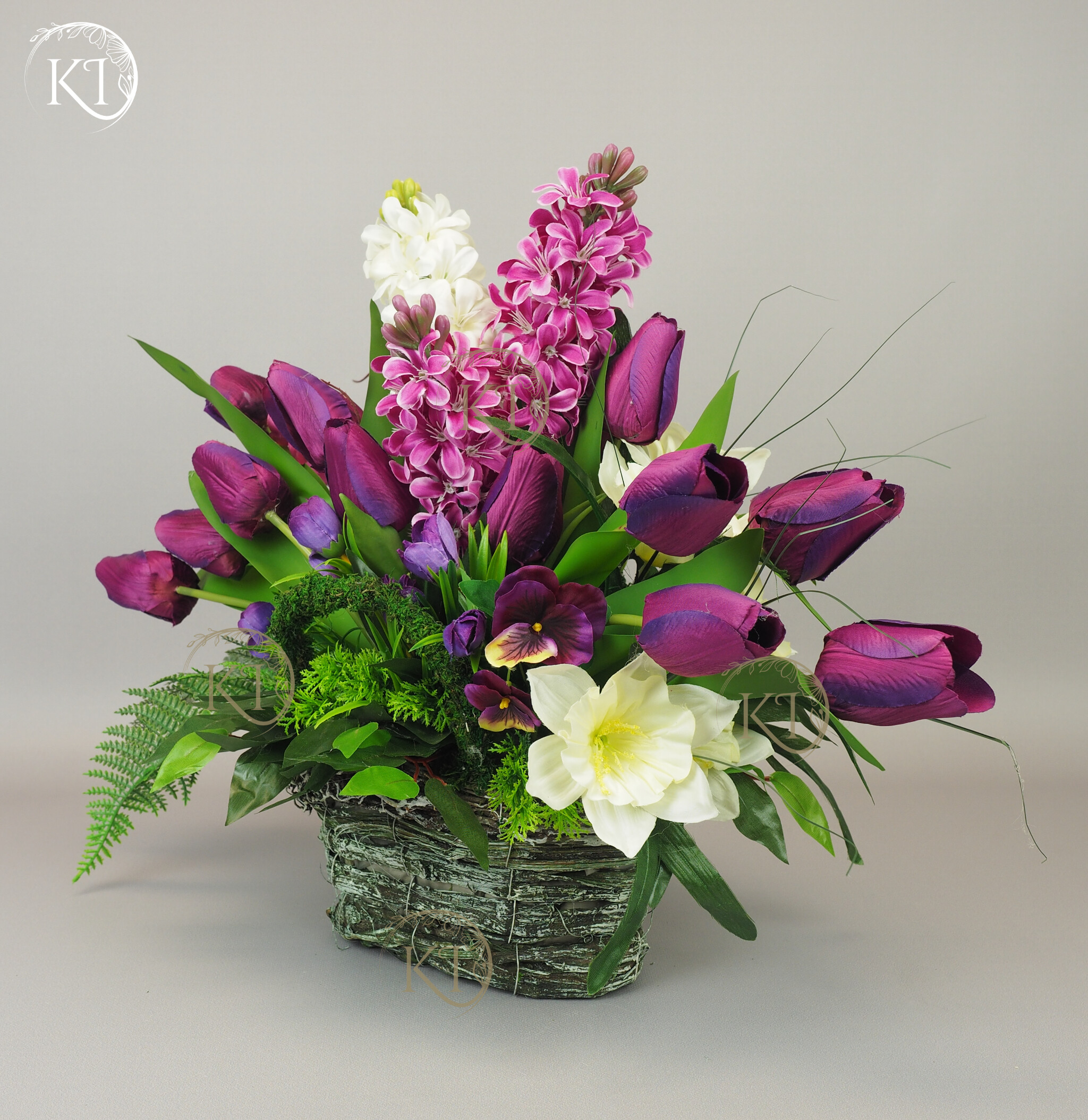 Kompozycja z kwiatów sztucznych wysokiej jakości… hiacyntów, tulipanów, bratków, żonkili… wykonana z dbałością o detale, w obciążonym wiklinowym koszyku, imitujący koszyk w stylu vintage.