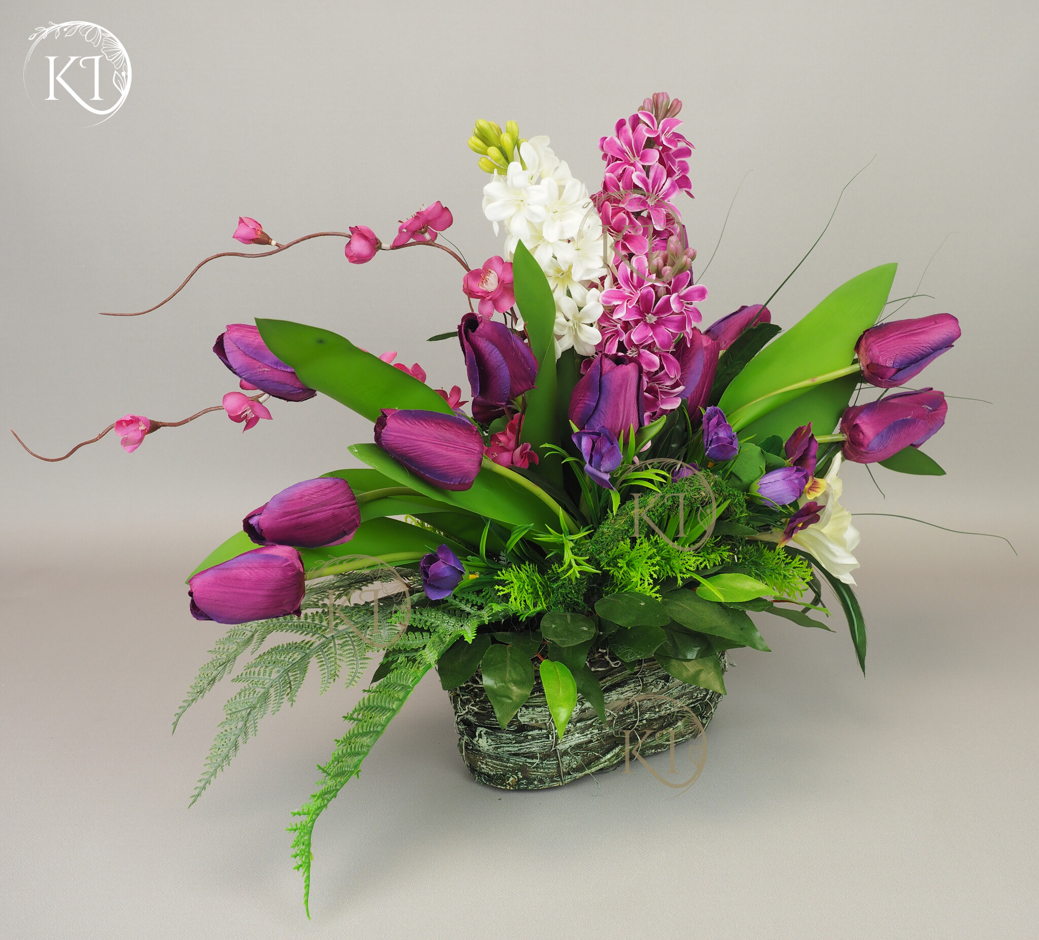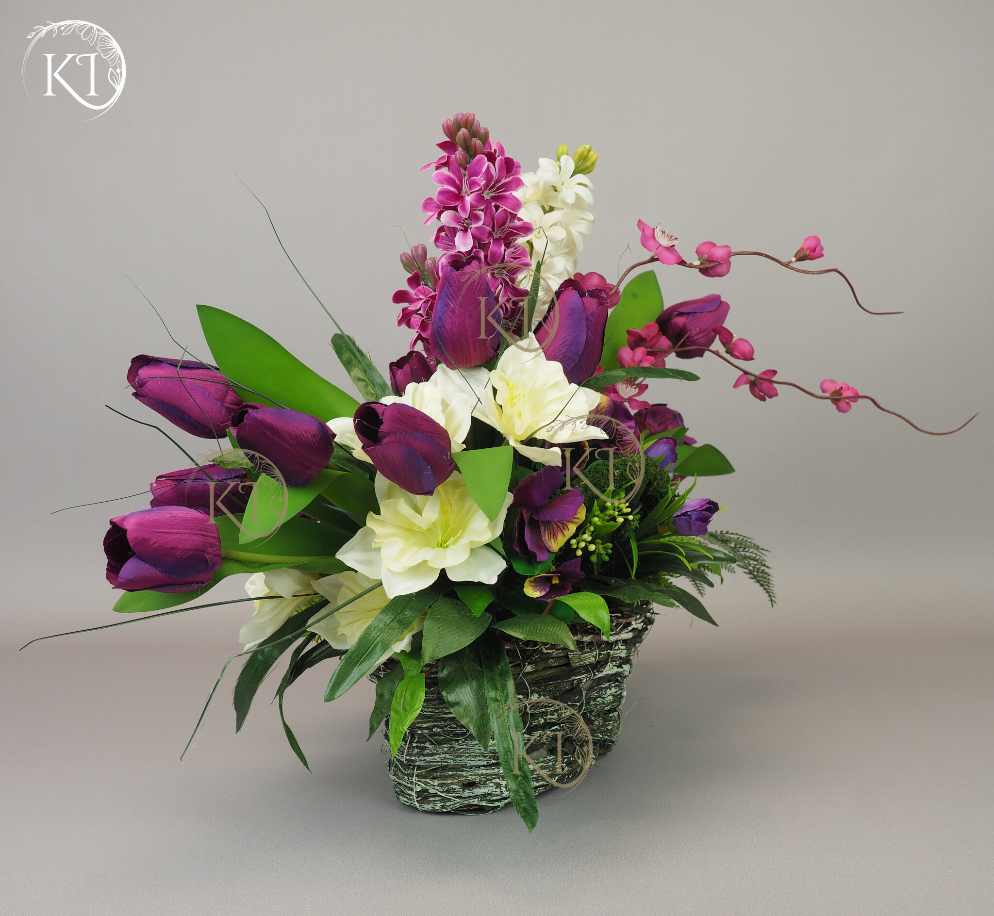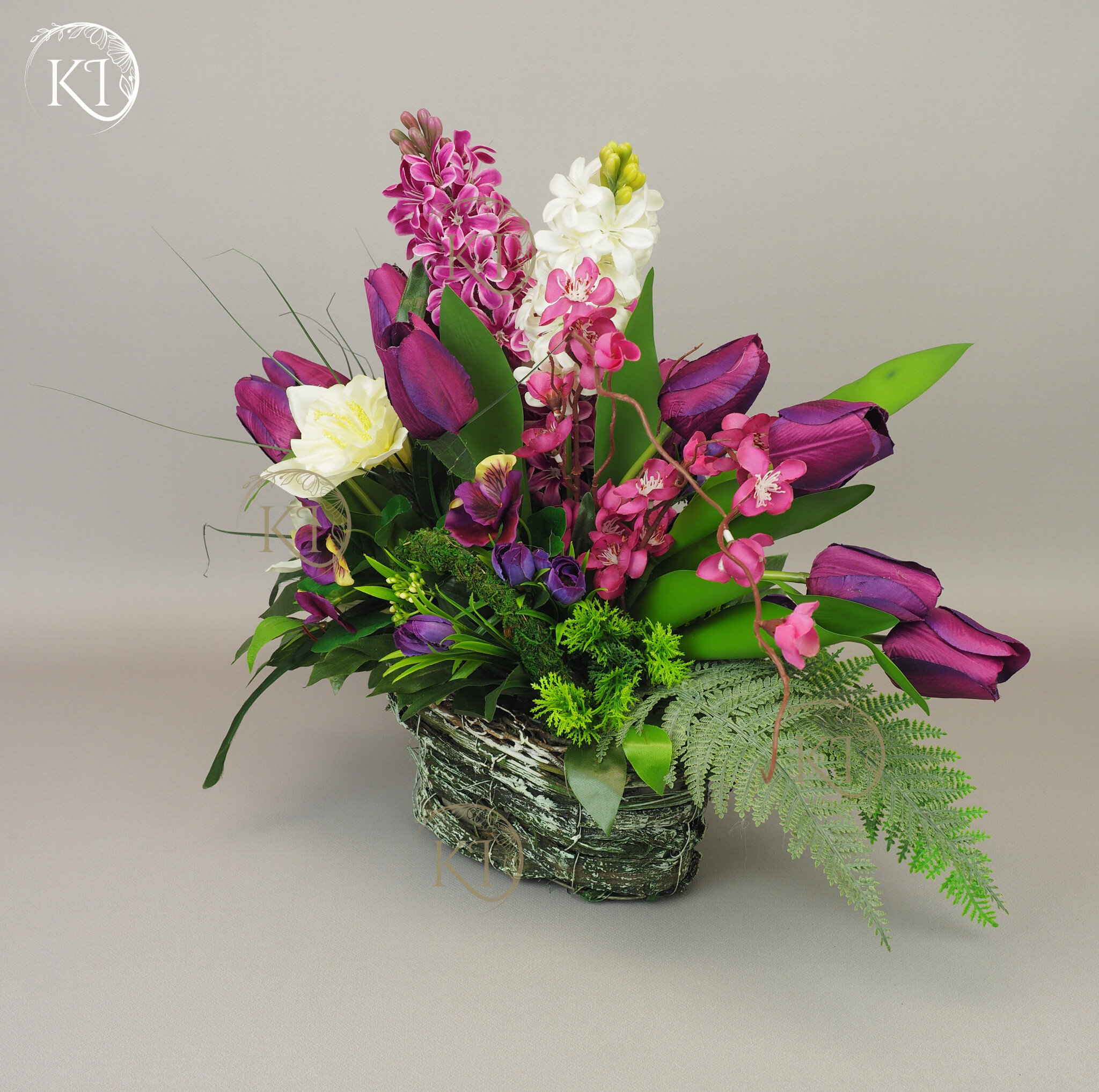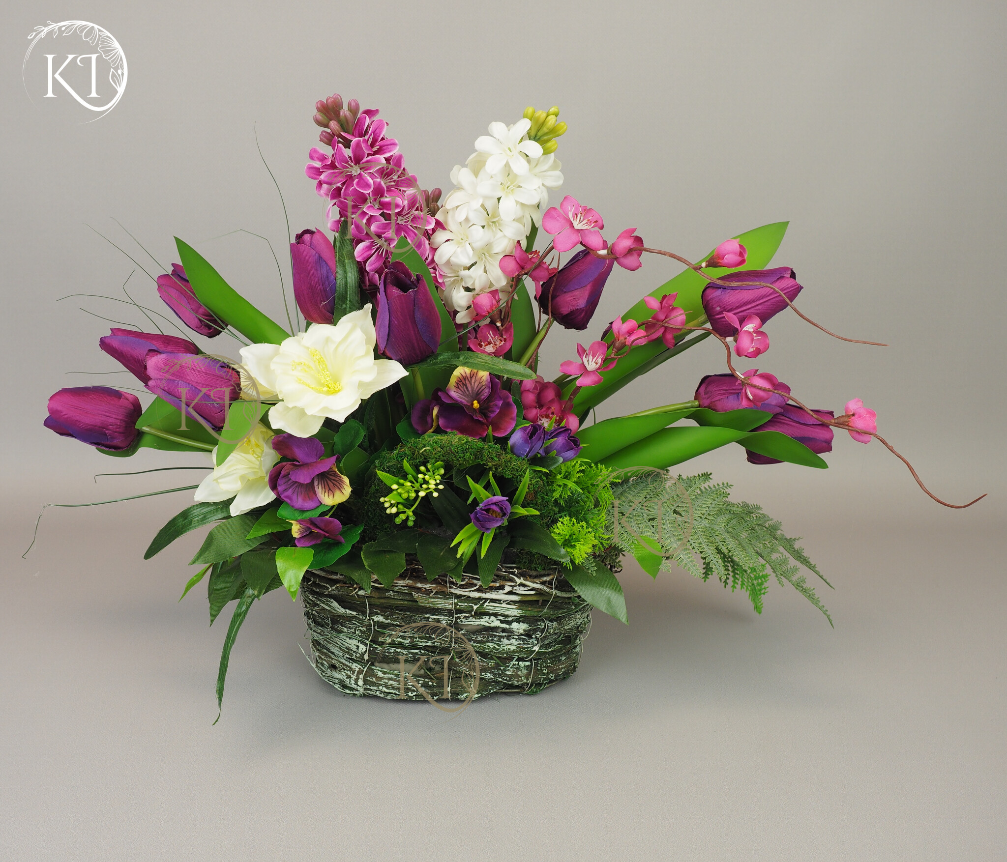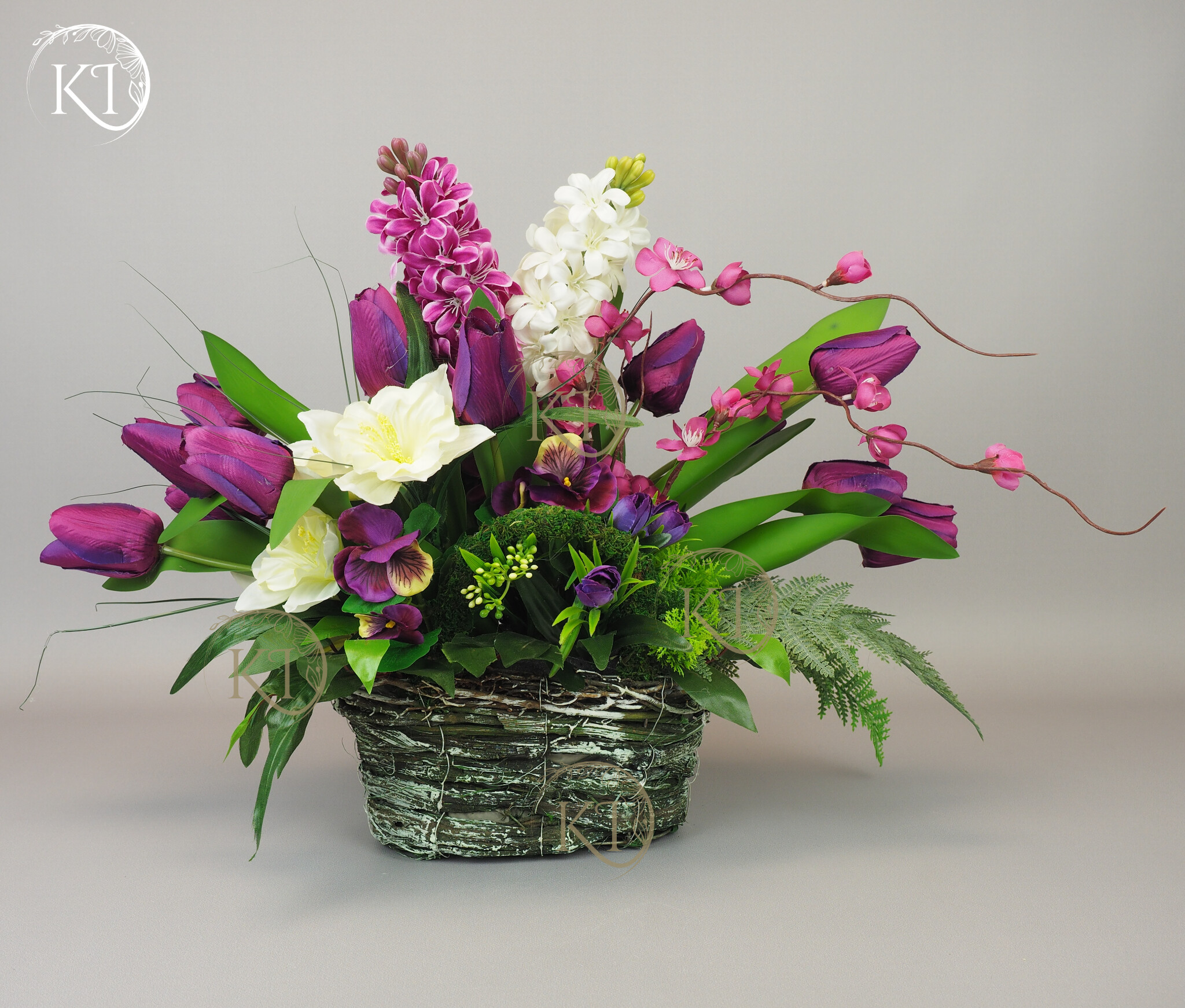 Kompozycja z kwiatów sztucznych wysokiej jakości… hiacyntów, tulipanów, bratków, żonkili… wykonana z dbałością o detale, w obciążonym wiklinowym koszyku, imitujący koszyk w stylu vintage.