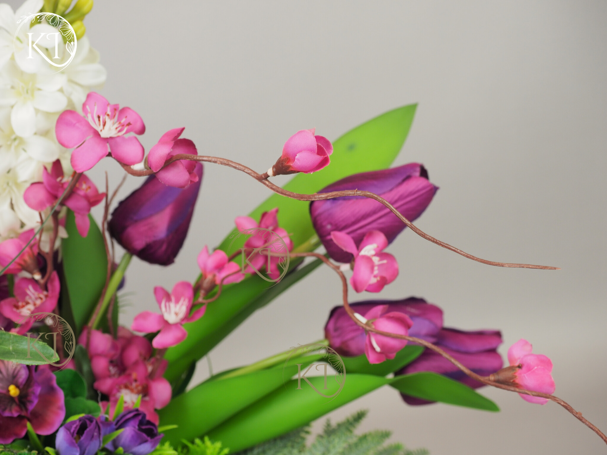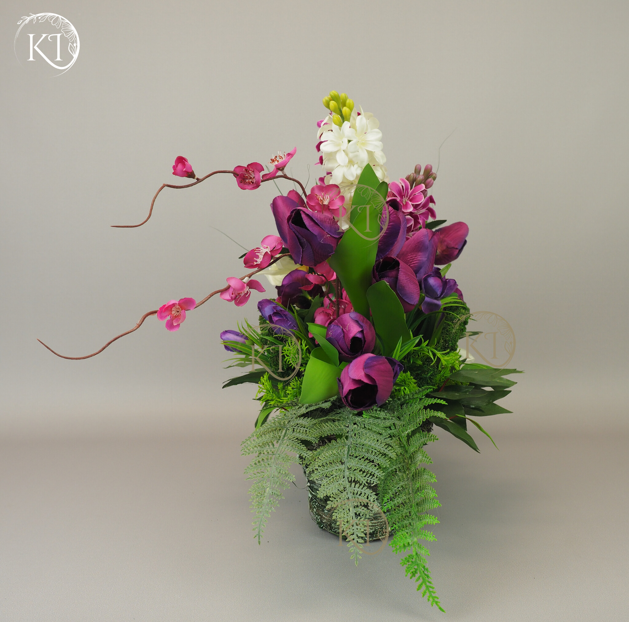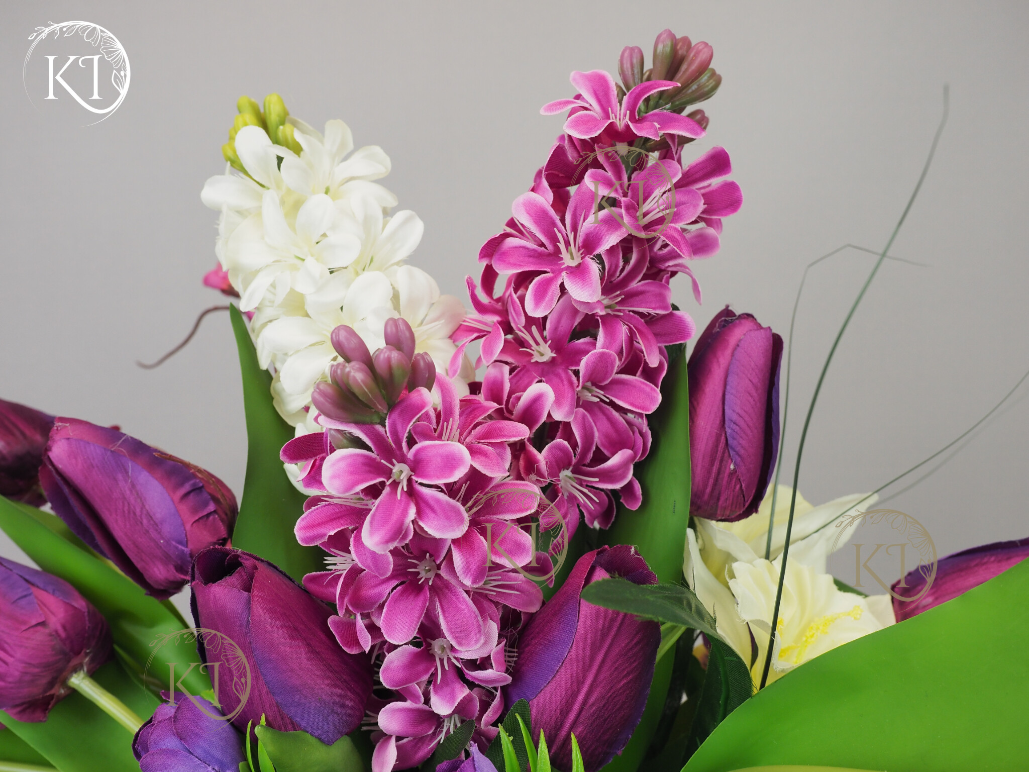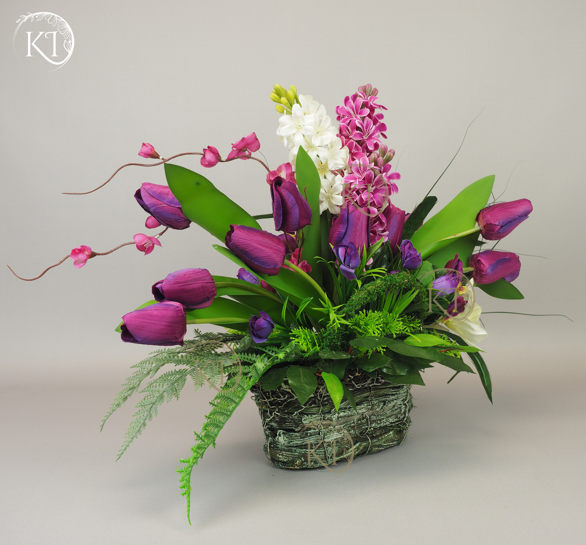 Kompozycja z kwiatów sztucznych wysokiej jakości… hiacyntów, tulipanów, bratków, żonkili… wykonana z dbałością o detale, w obciążonym wiklinowym koszyku, imitujący koszyk w stylu vintage.
