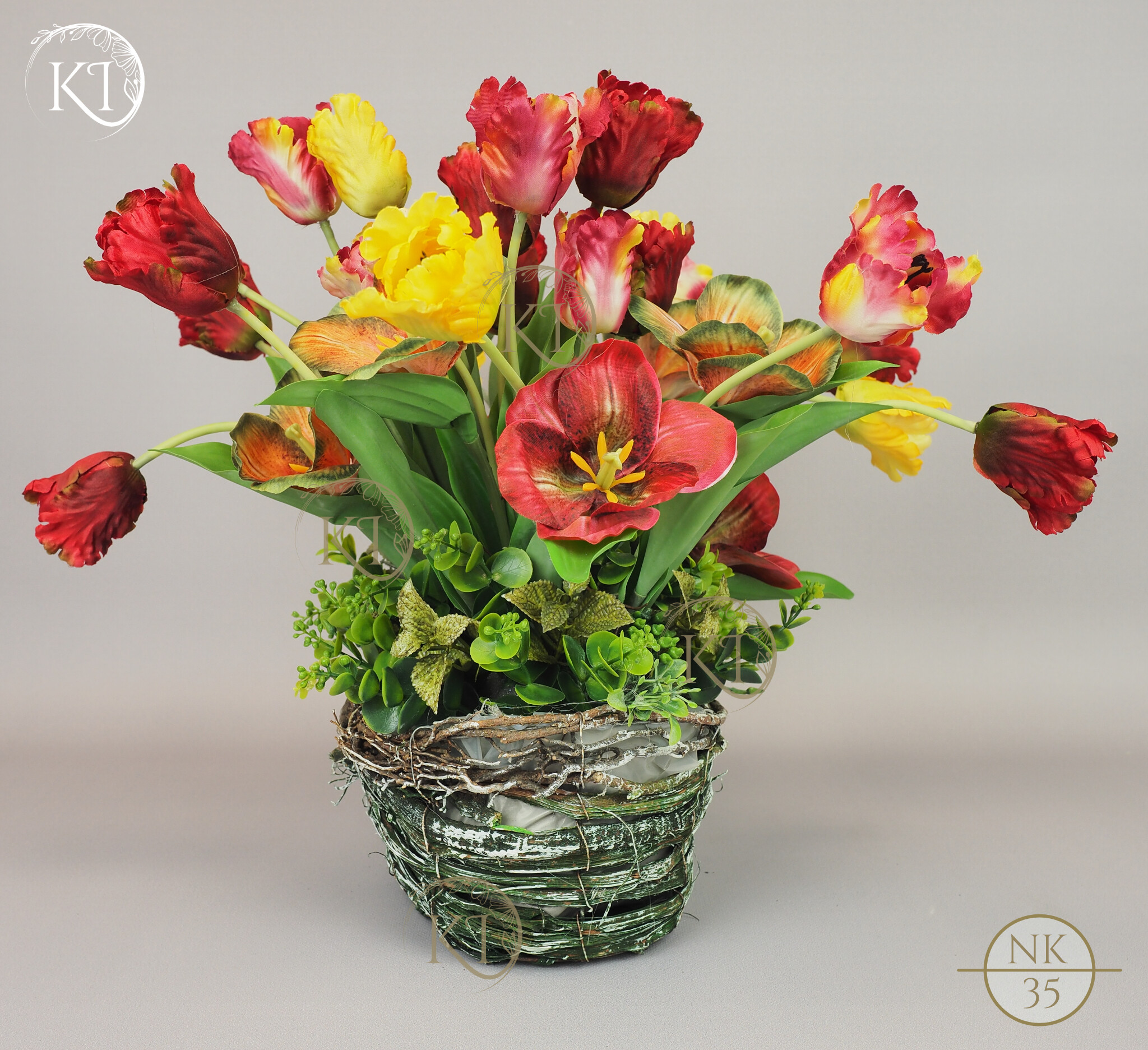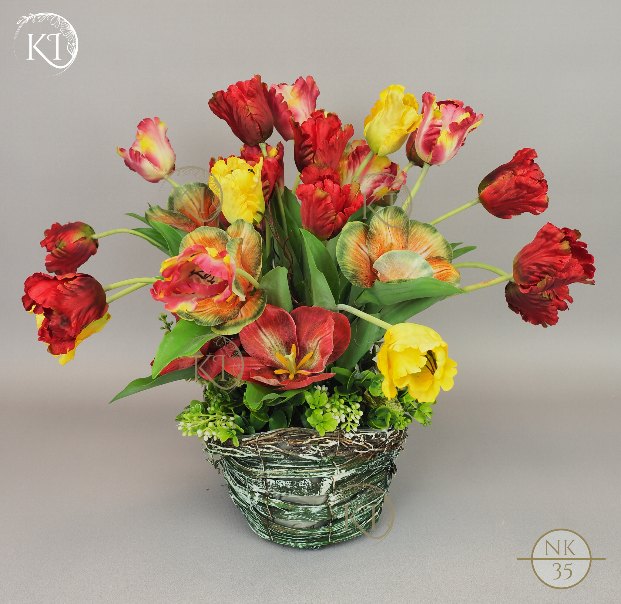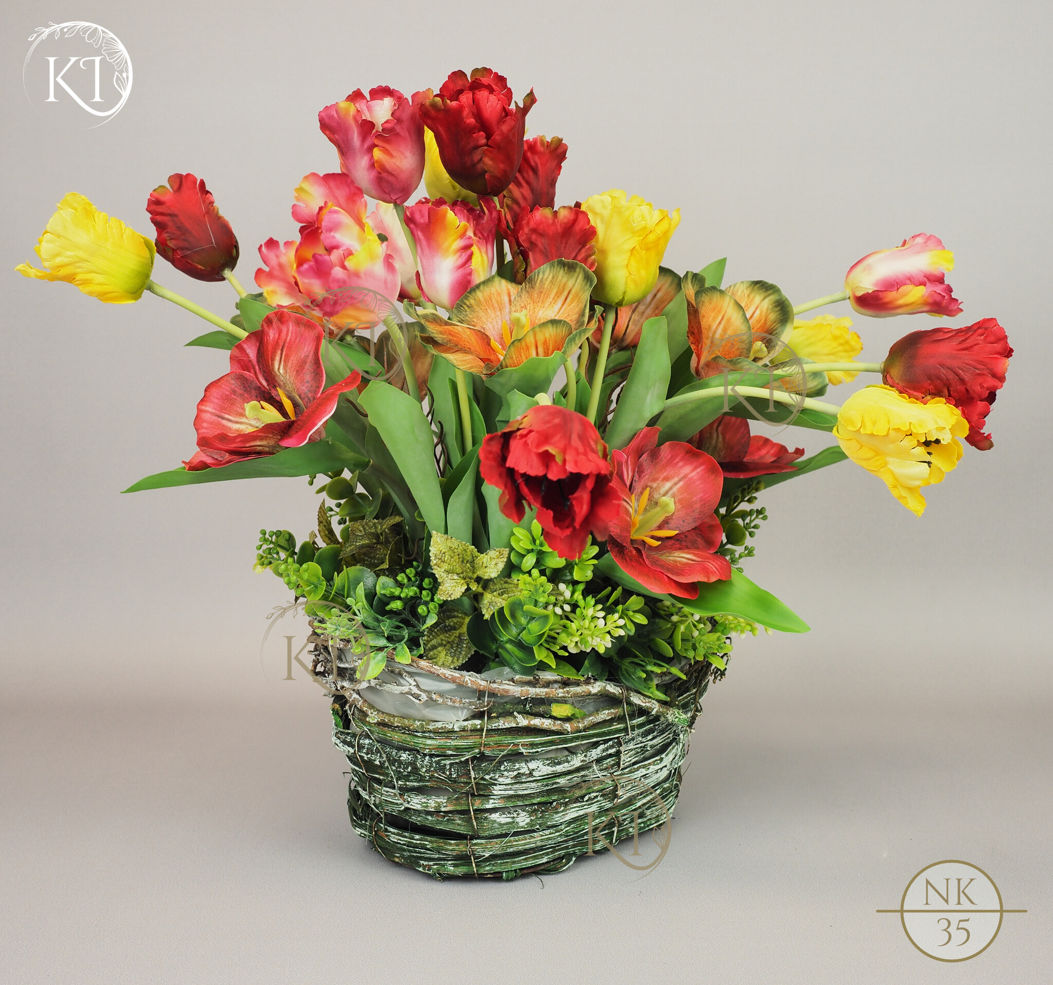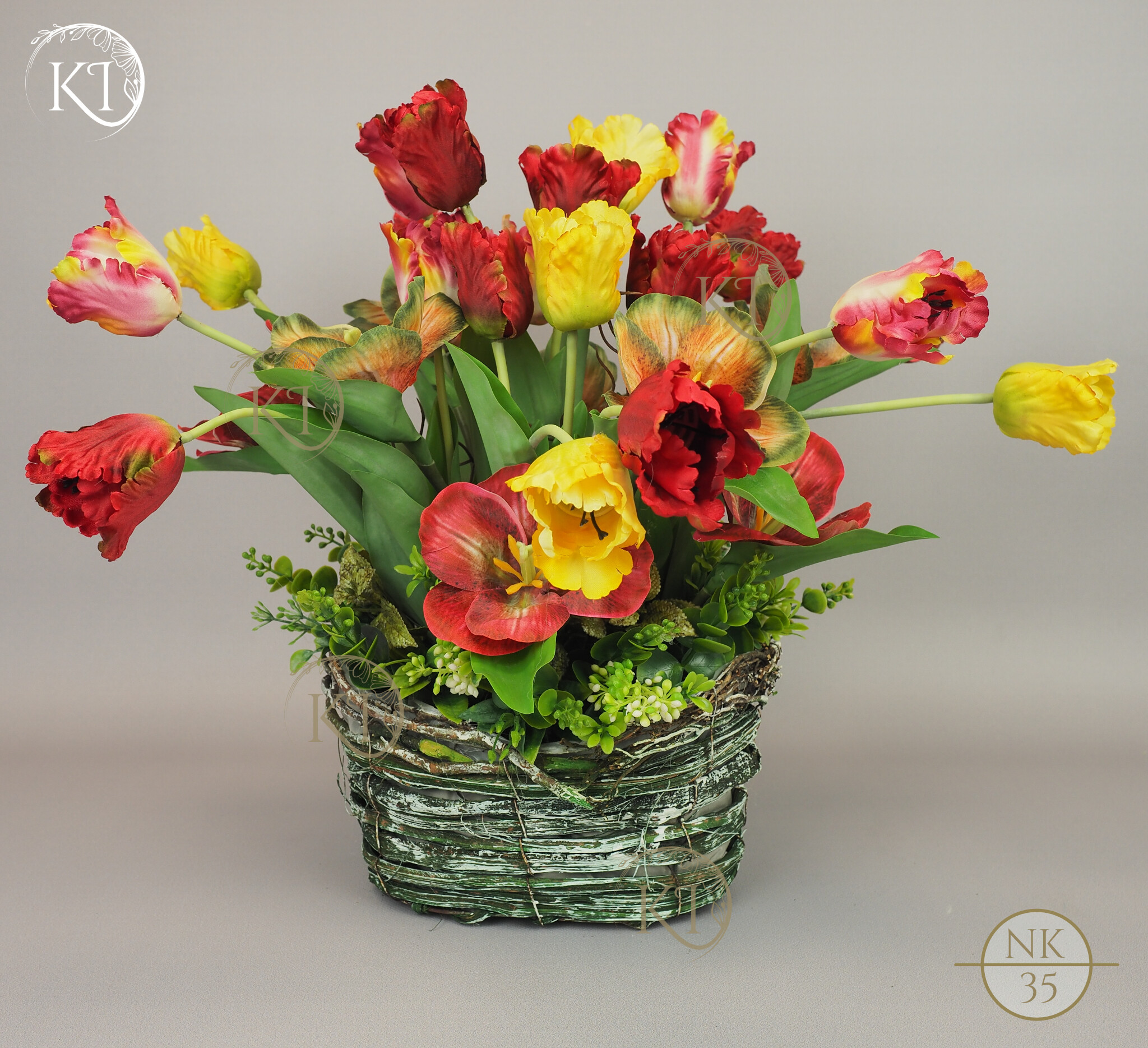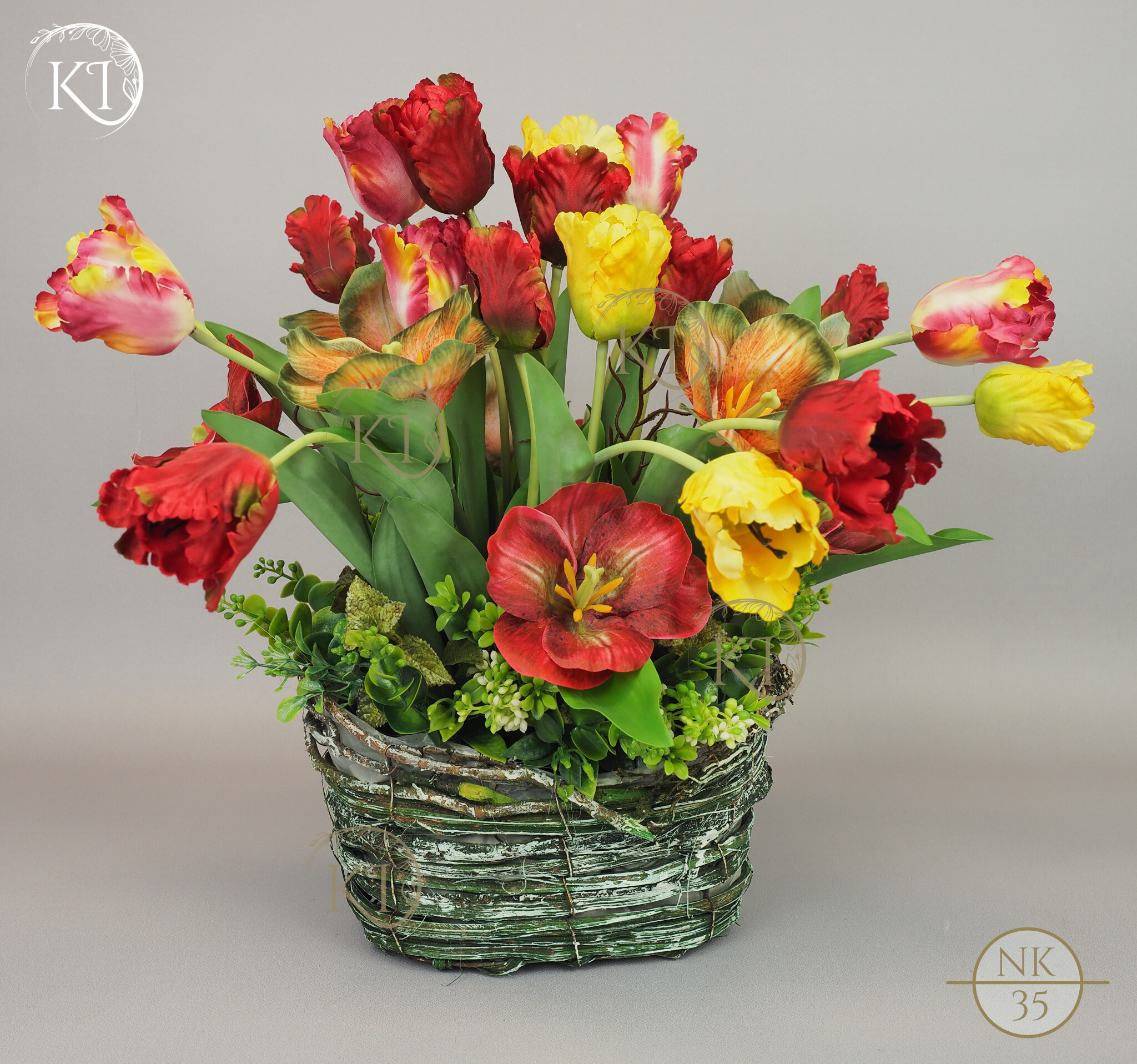 Tulipany papuzie, w obciążonym koszyku wiklinowym, imitujący koszyk w stylu vintage.