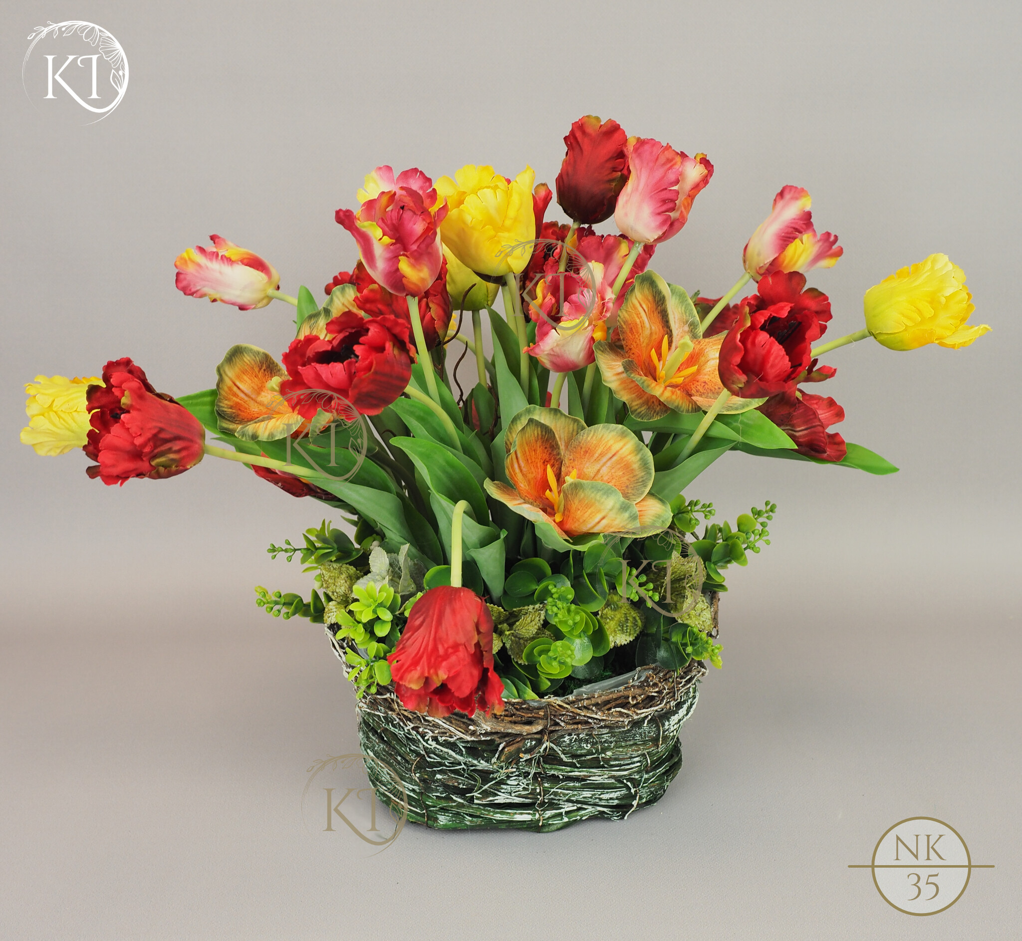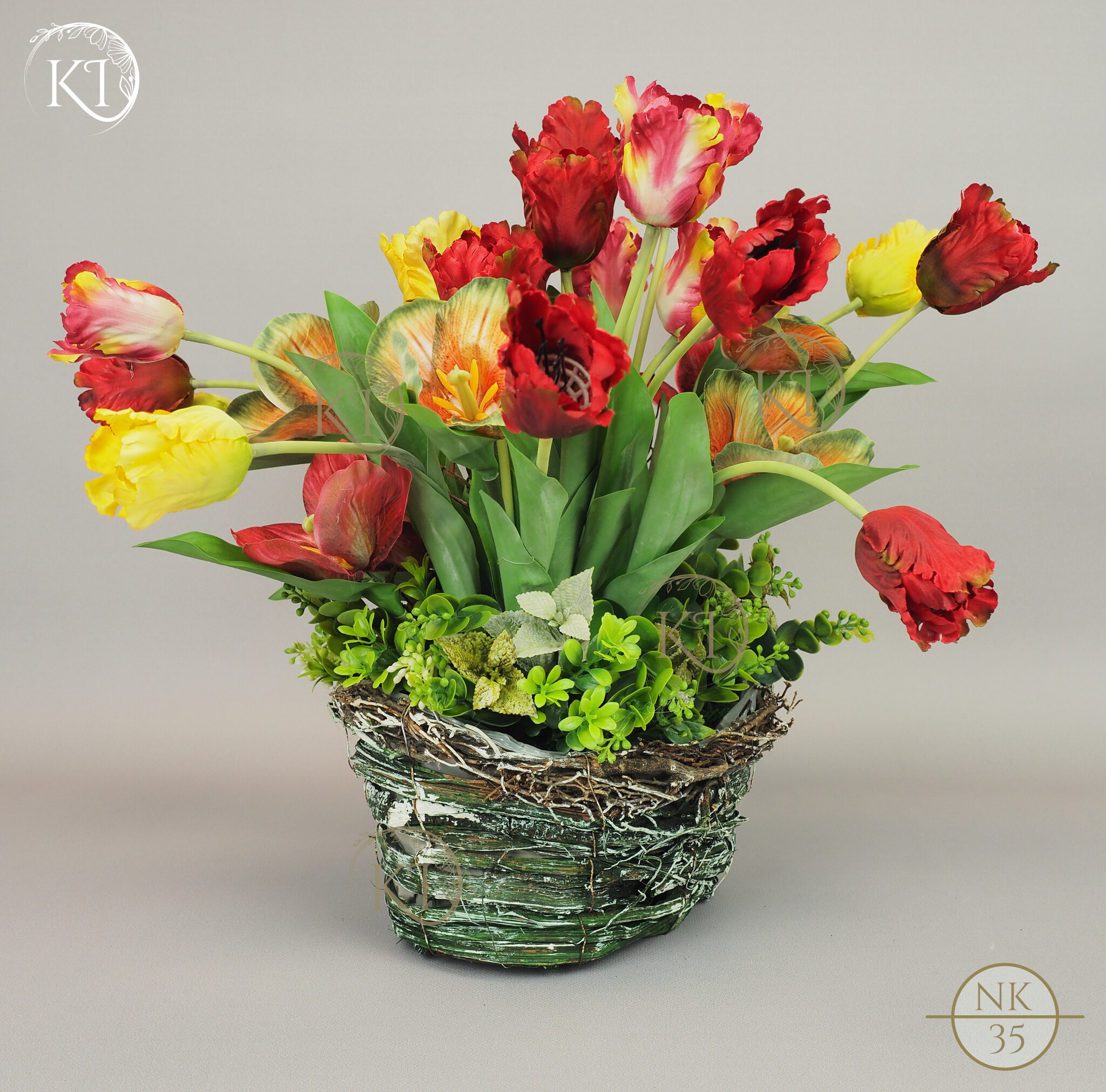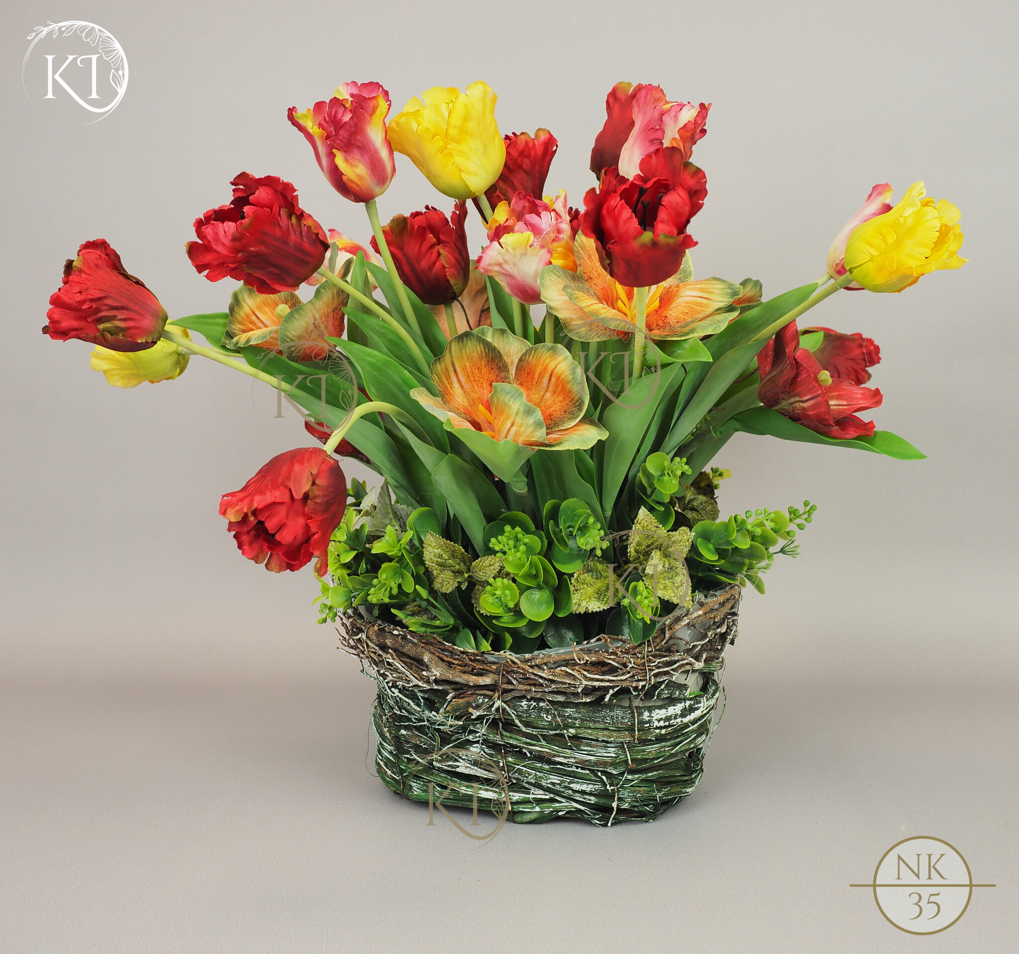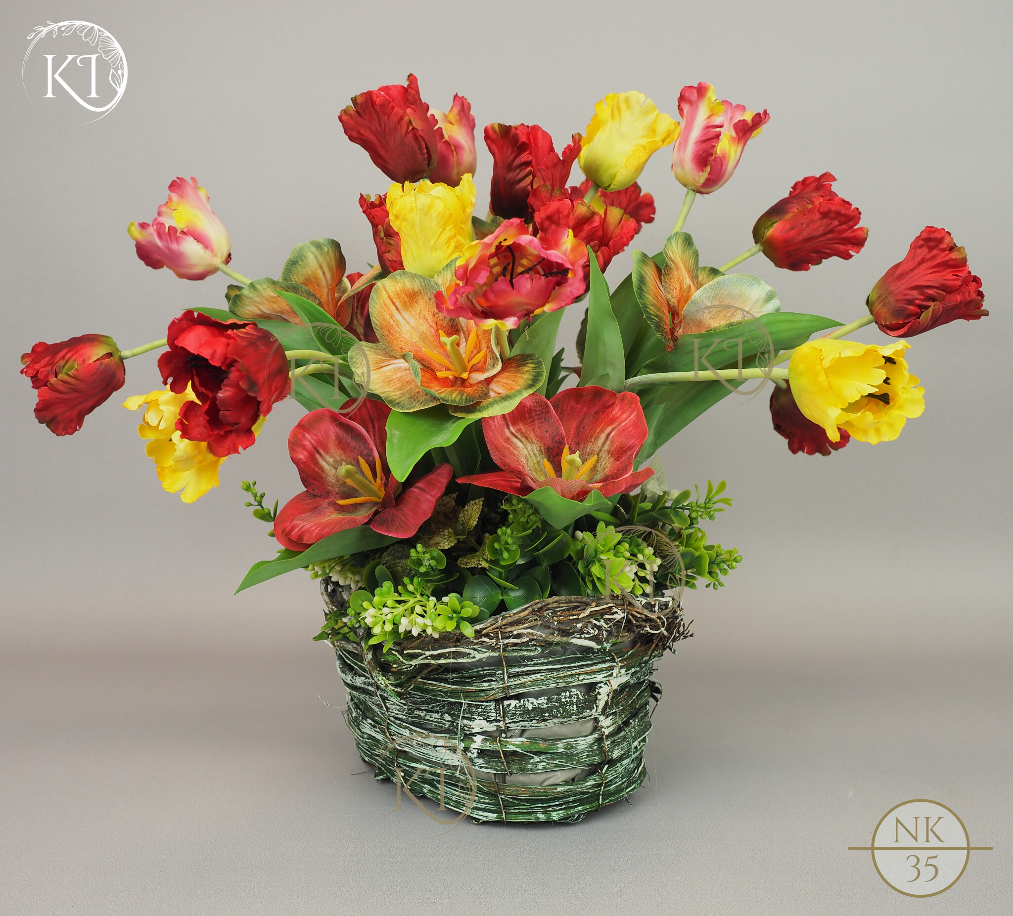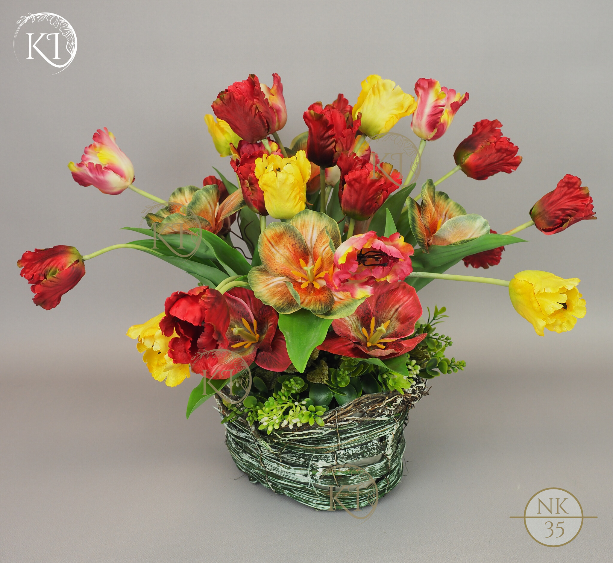 Tulipany papuzie, w obciążonym koszyku wiklinowym, imitujący koszyk w stylu vintage.
