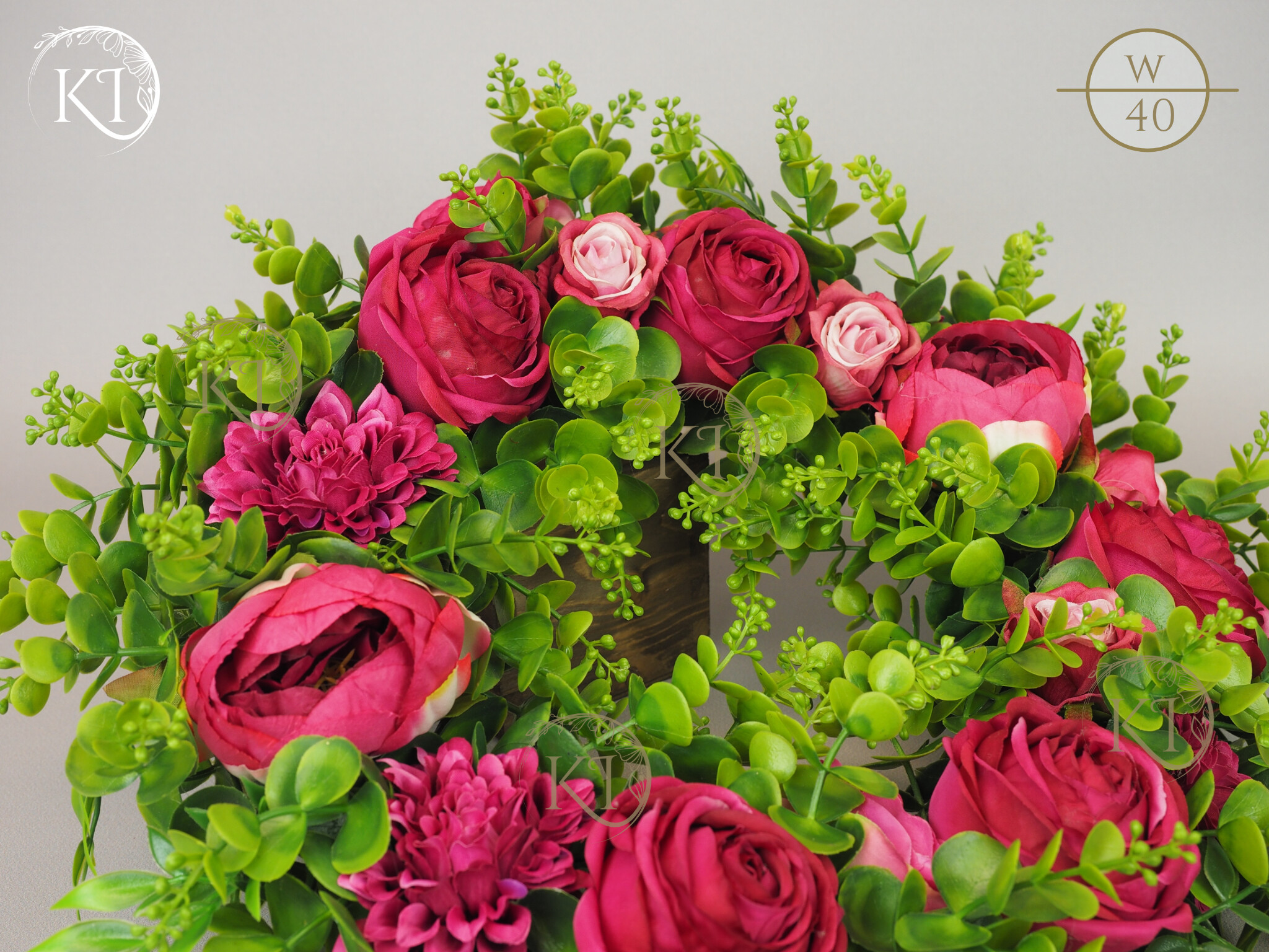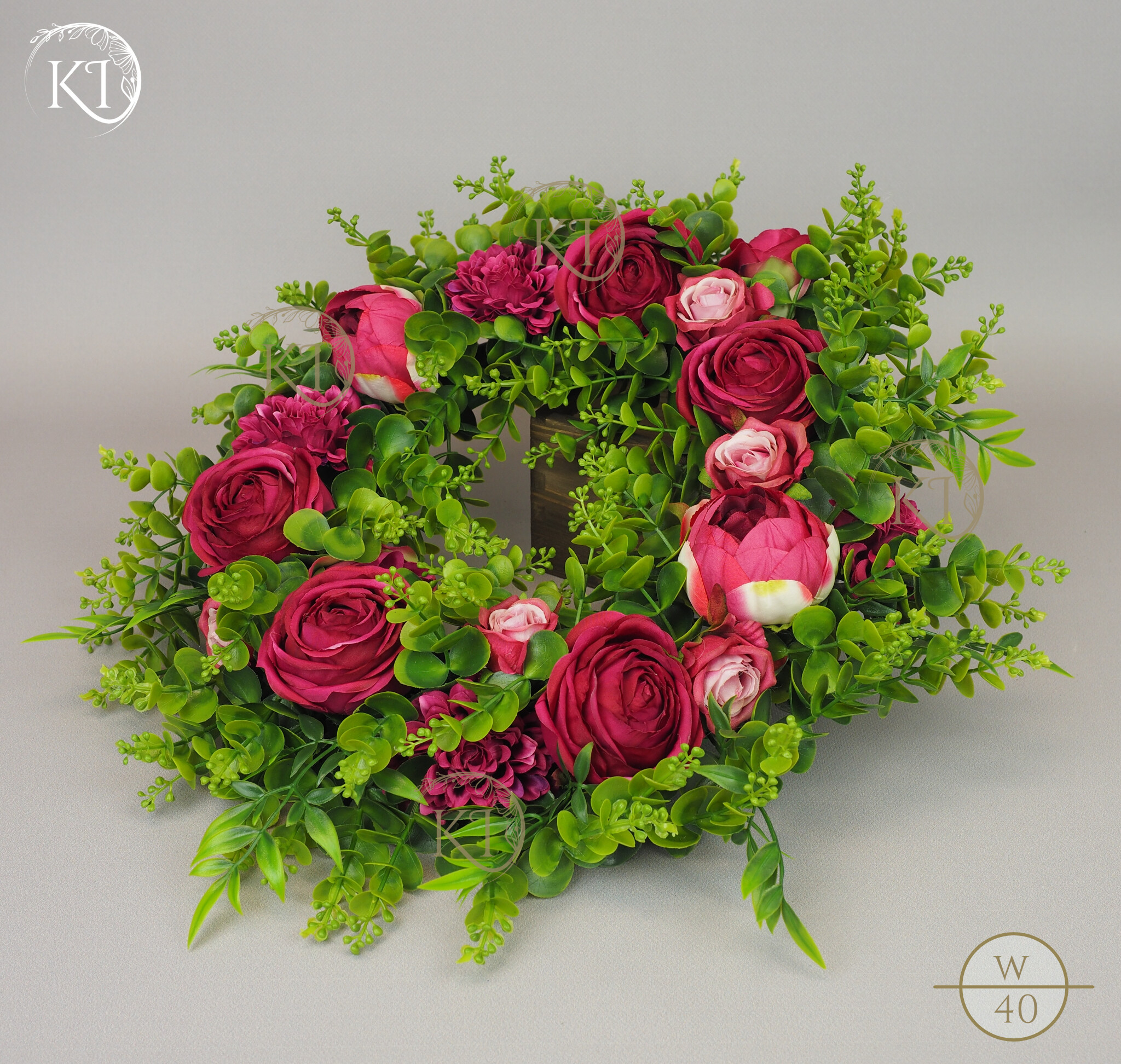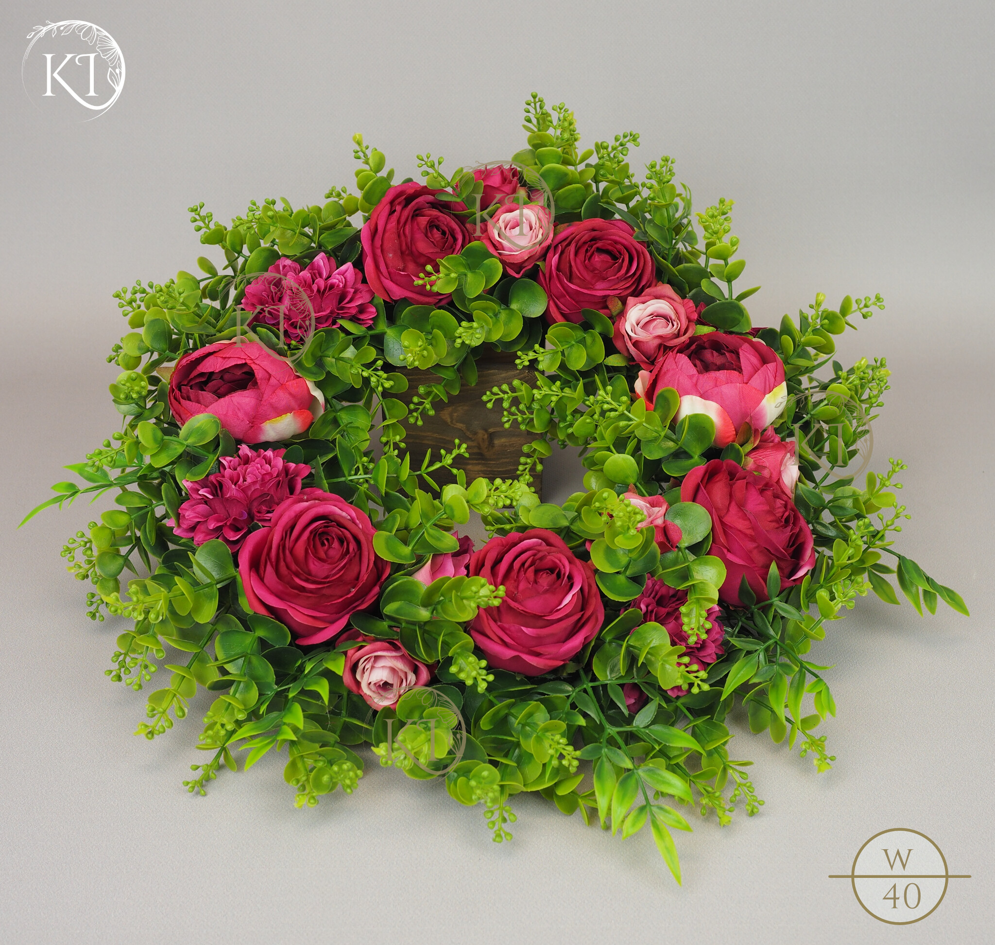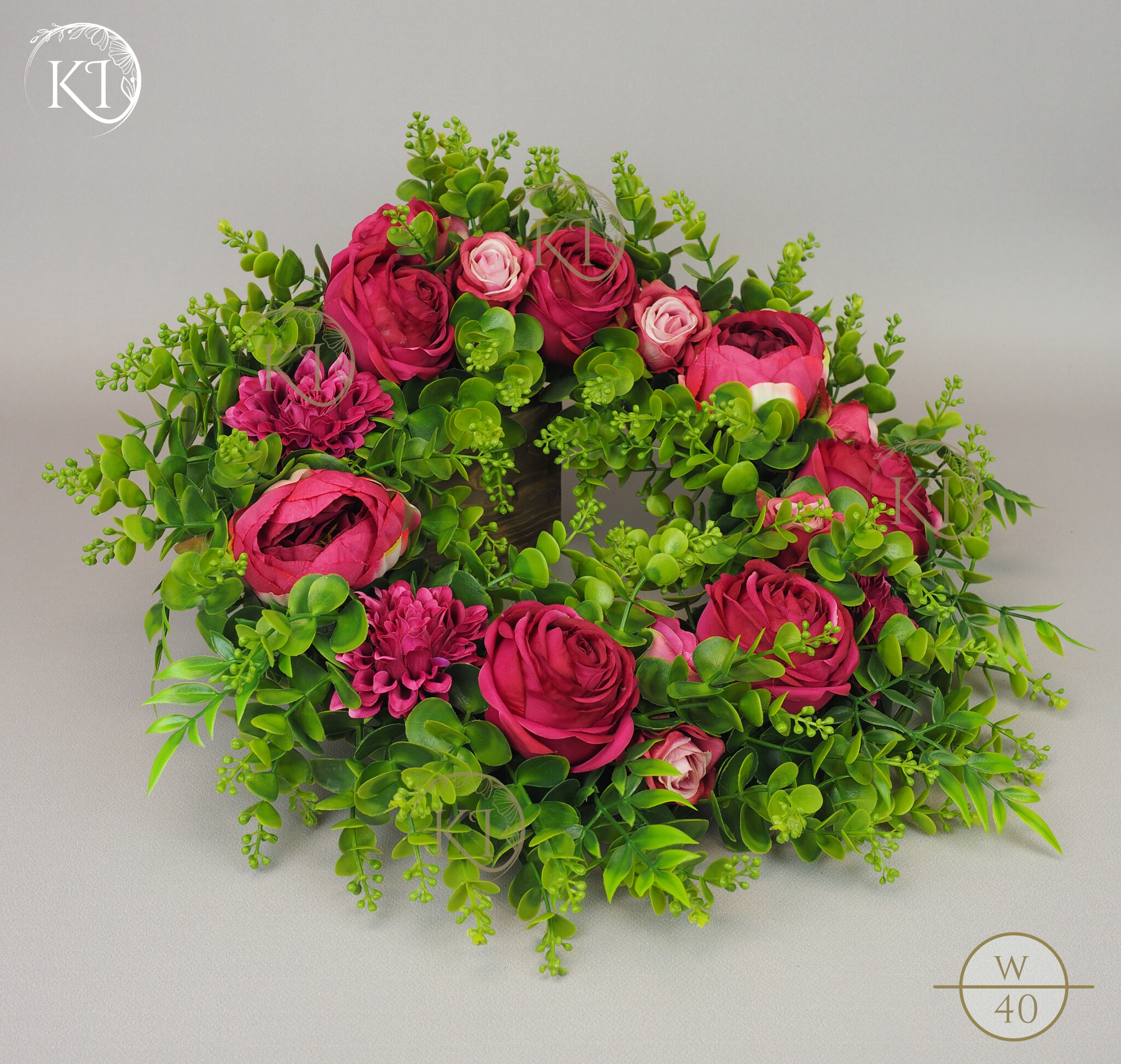 Całoroczny, trwały Wianek, w całości wykonany ze sztucznych kwiatów i gałązek wysokiej jakości, lekko obciążony i podniesiony po niewielkim kątem (przedstawione na fotografiach).