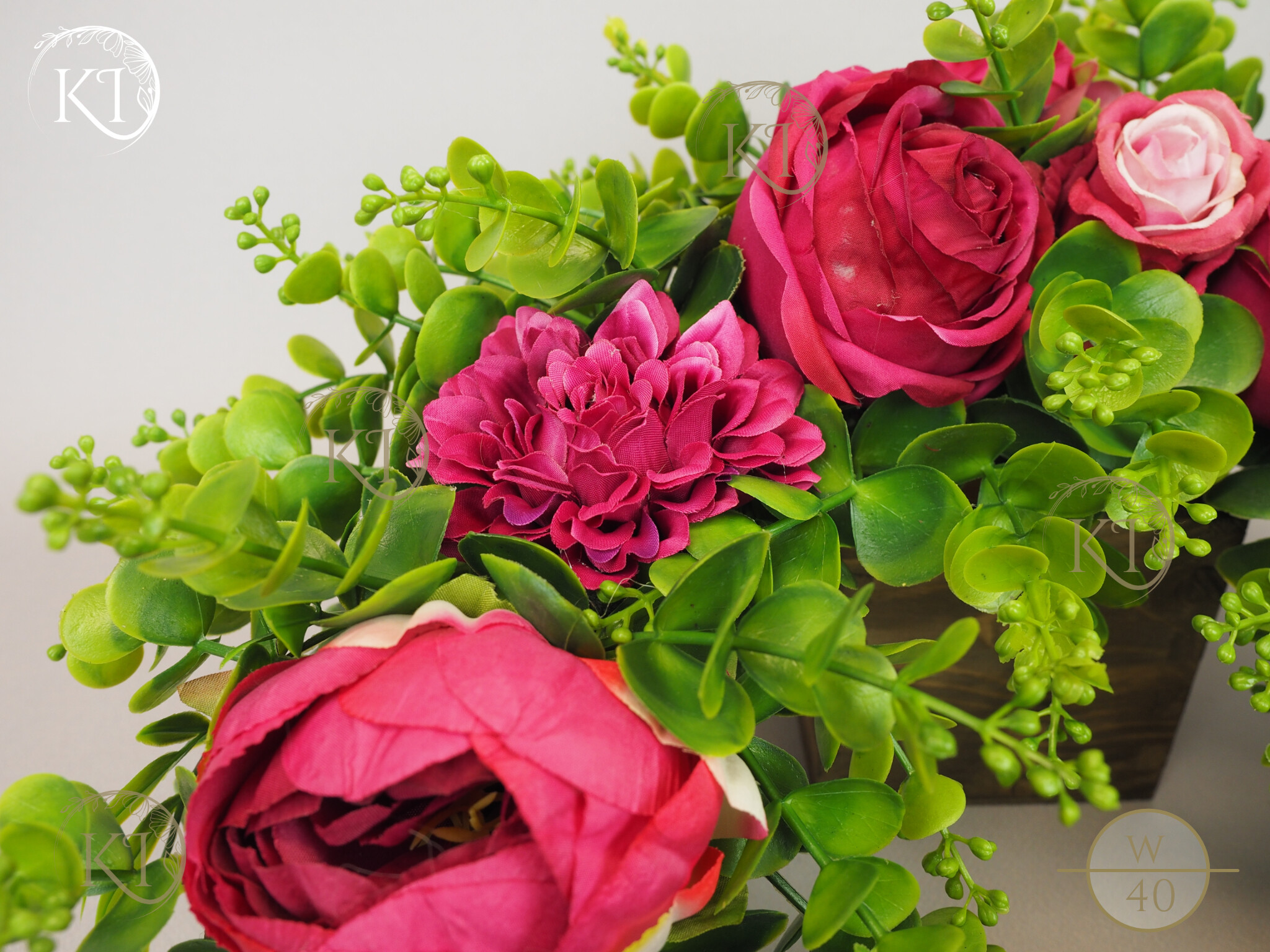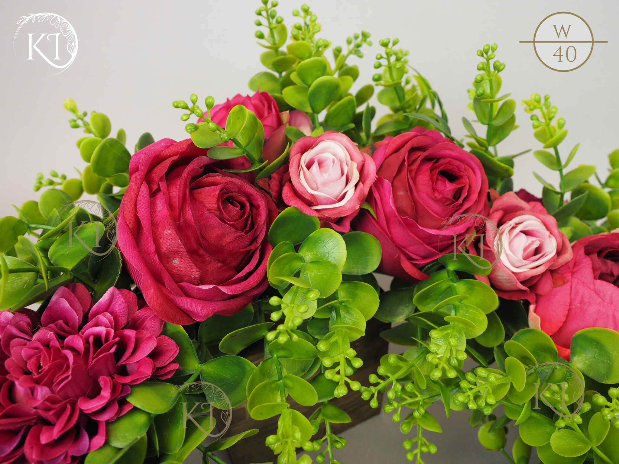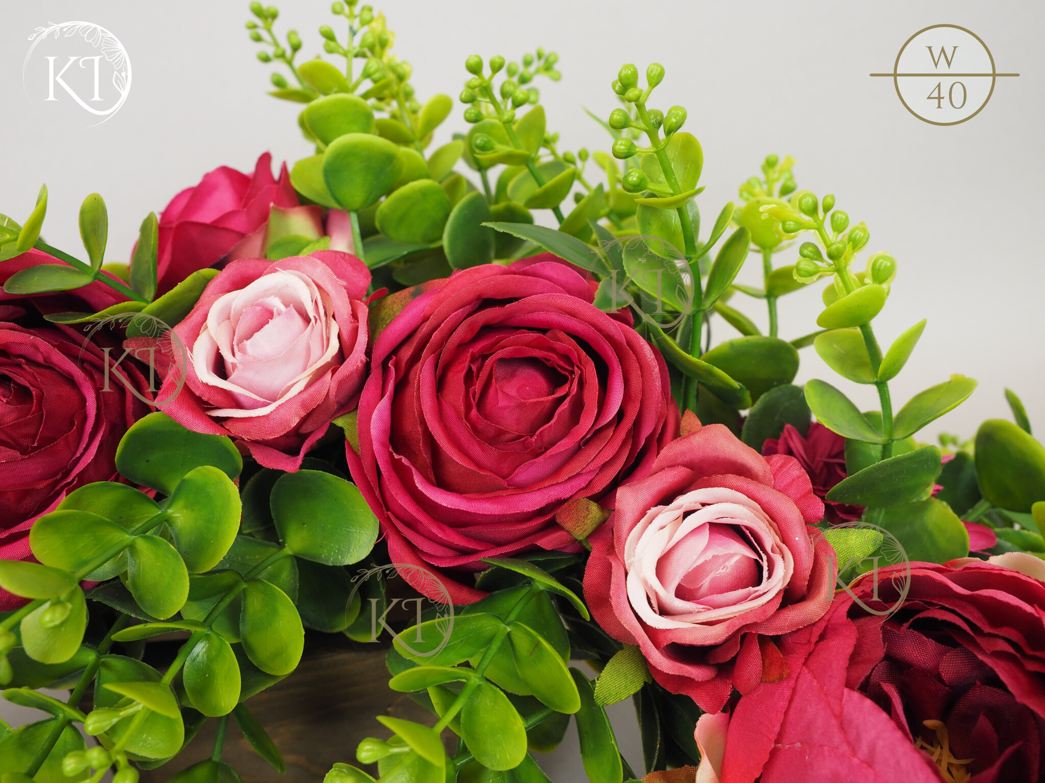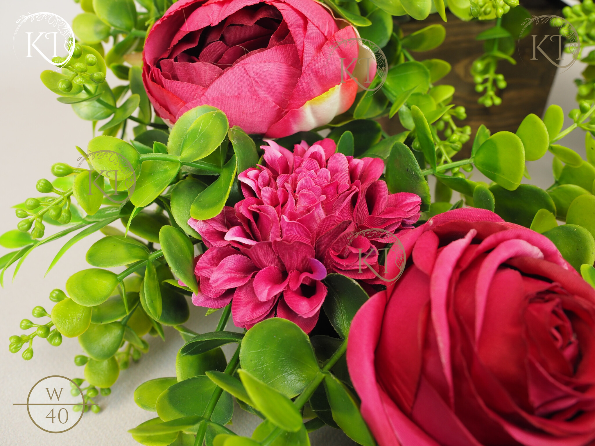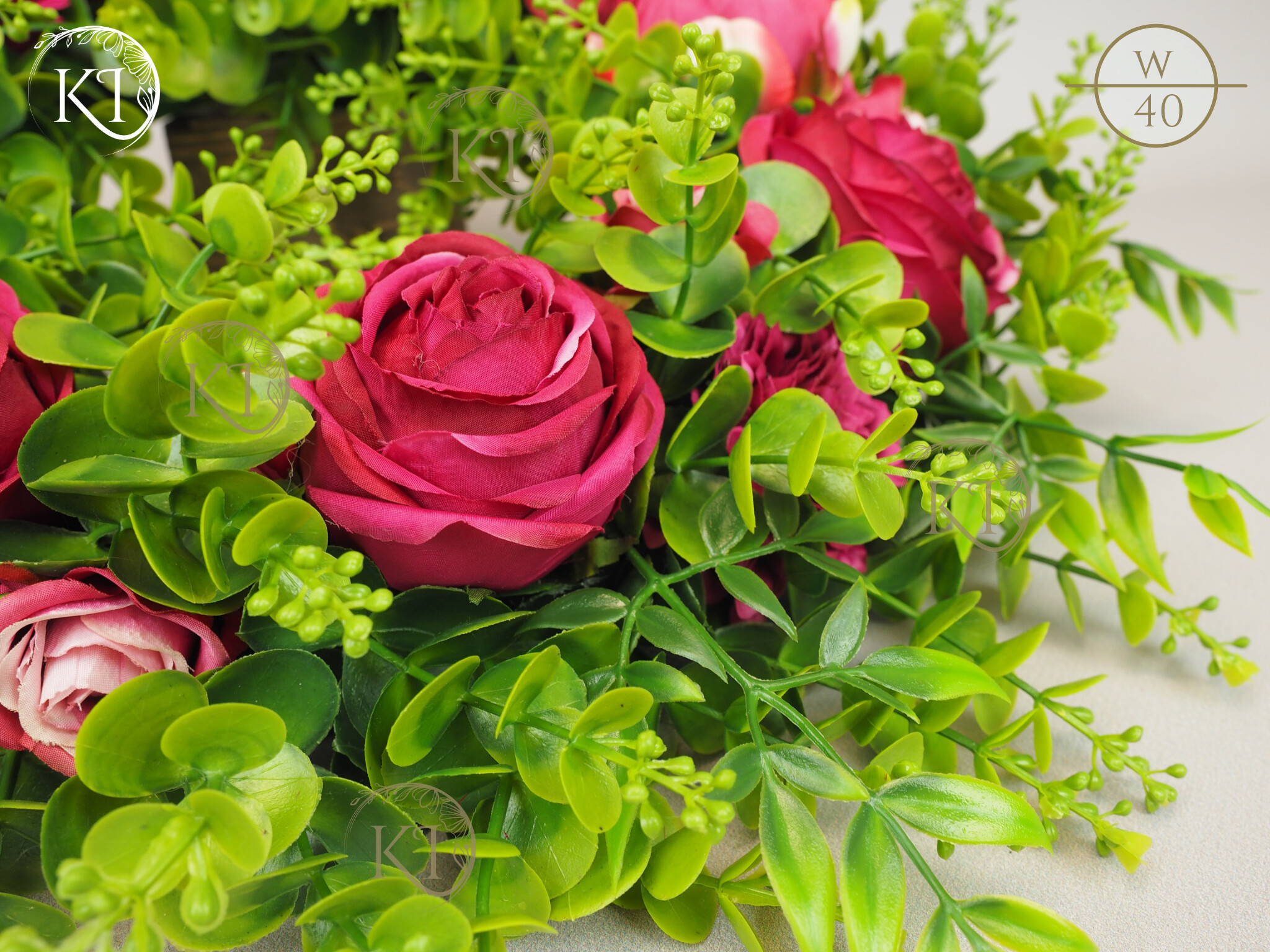 Całoroczny, trwały Wianek, w całości wykonany ze sztucznych kwiatów i gałązek wysokiej jakości, lekko obciążony i podniesiony po niewielkim kątem (przedstawione na fotografiach).