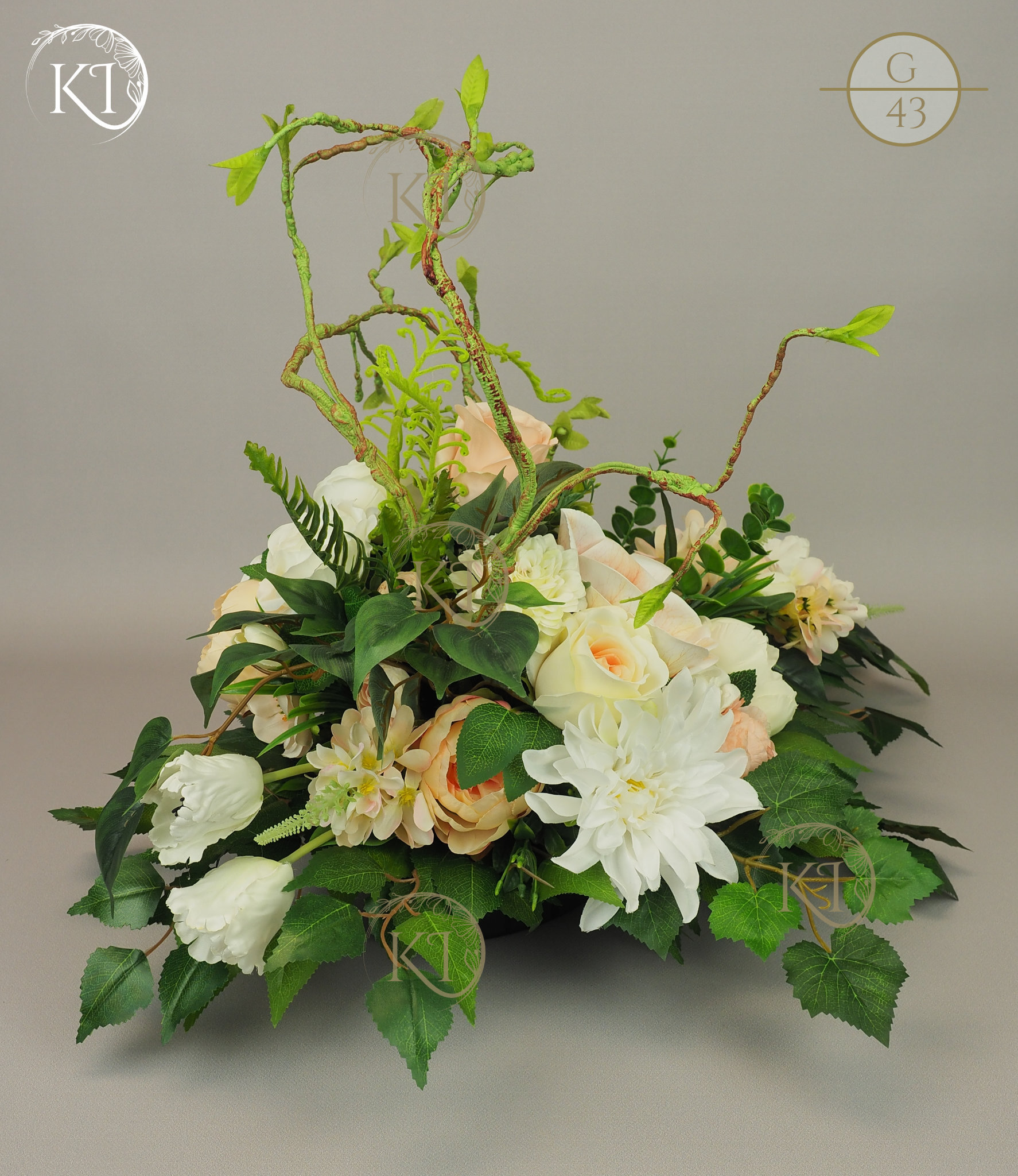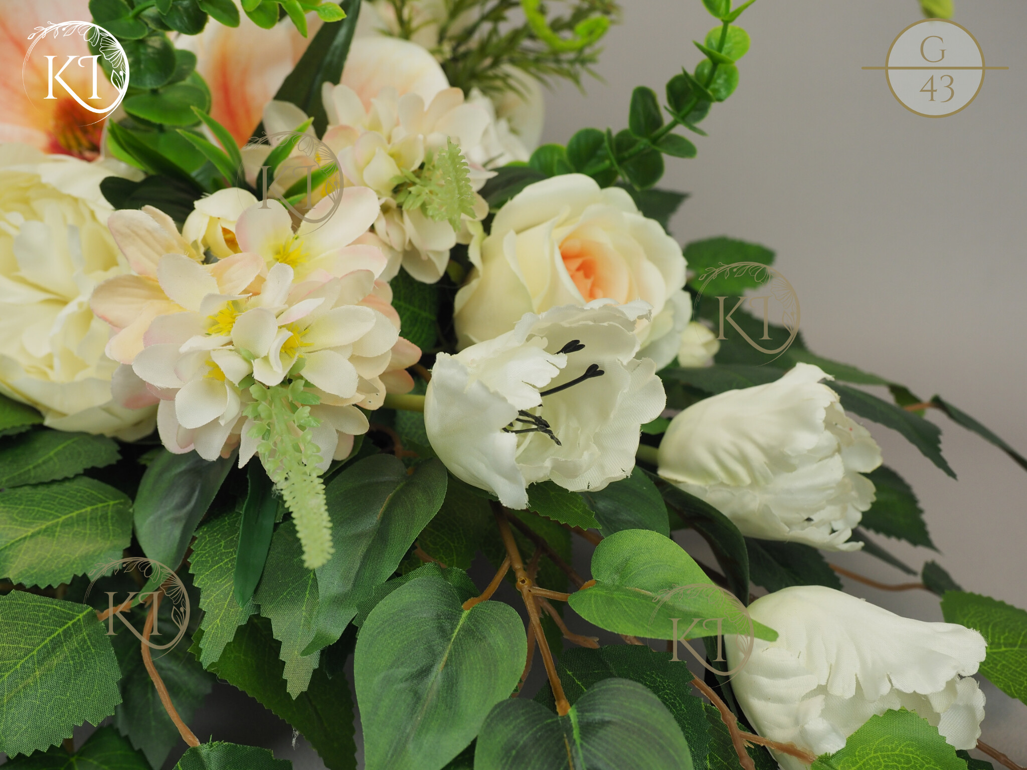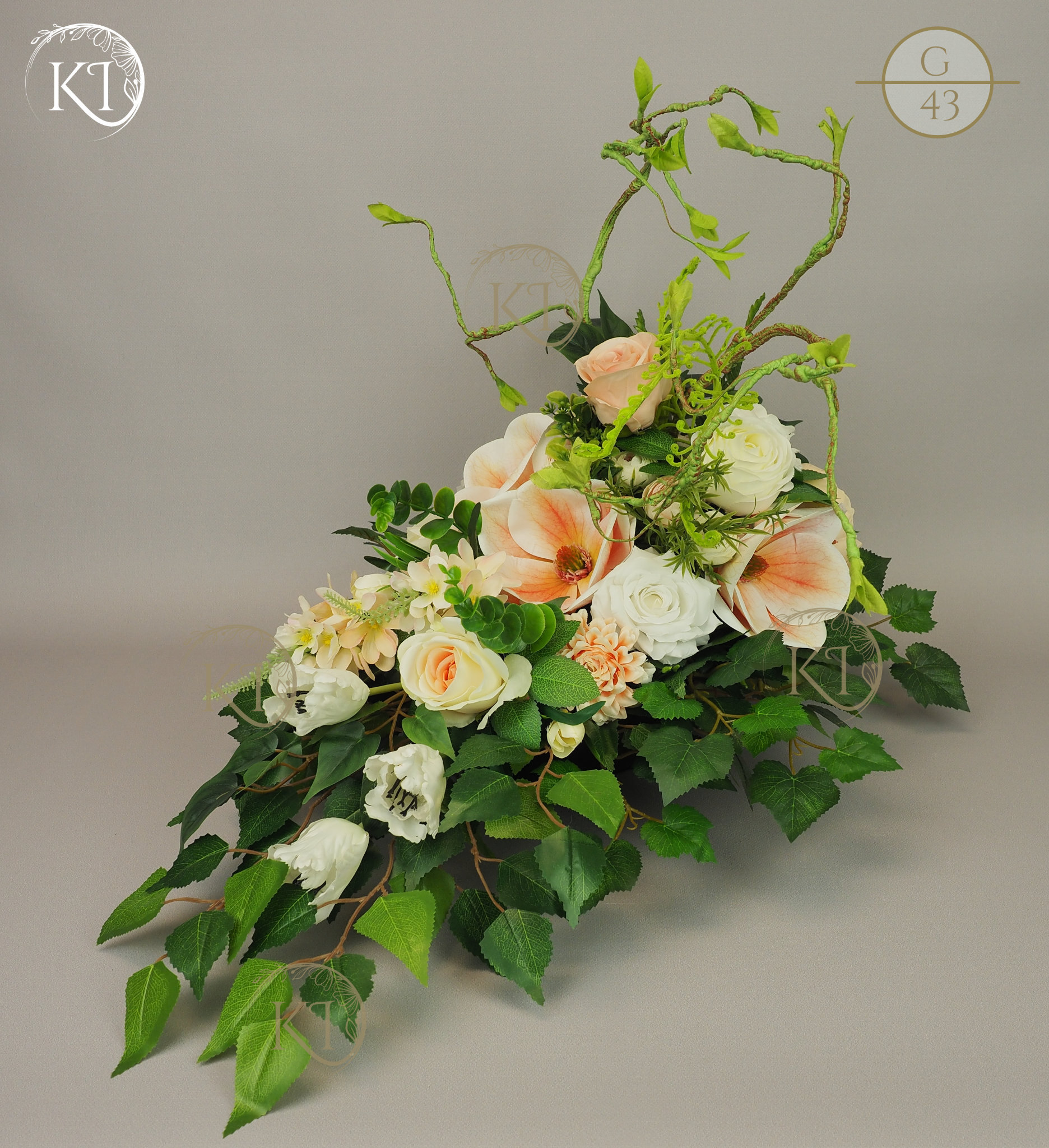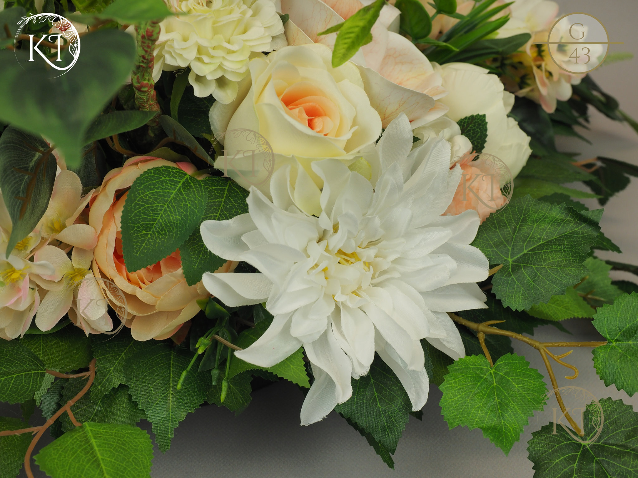 Tradycyjna Dekoracja nagrobna, w formie wiązanki, w obciążonej plastikowej podstawie, wykonana z gałązek i kwiatów sztucznych wysokiej jakości, imitujących rośliny naturalne, co nadaje jej trwałości, wykonana z dbałością o detale, w wiodącej tonacji kolorystycznej biało-morelowej.