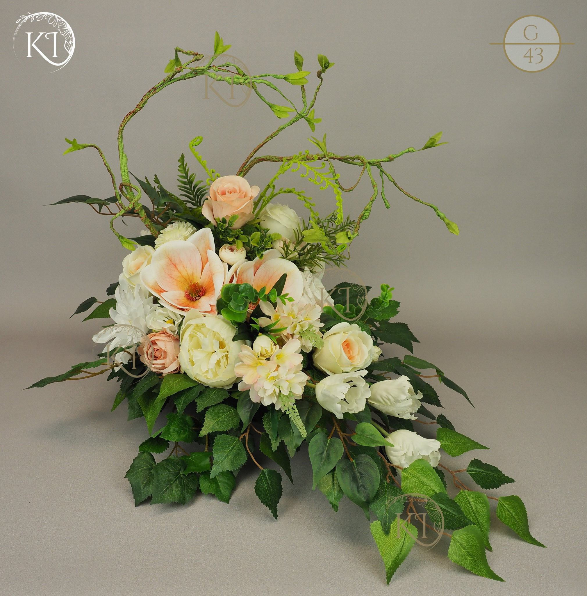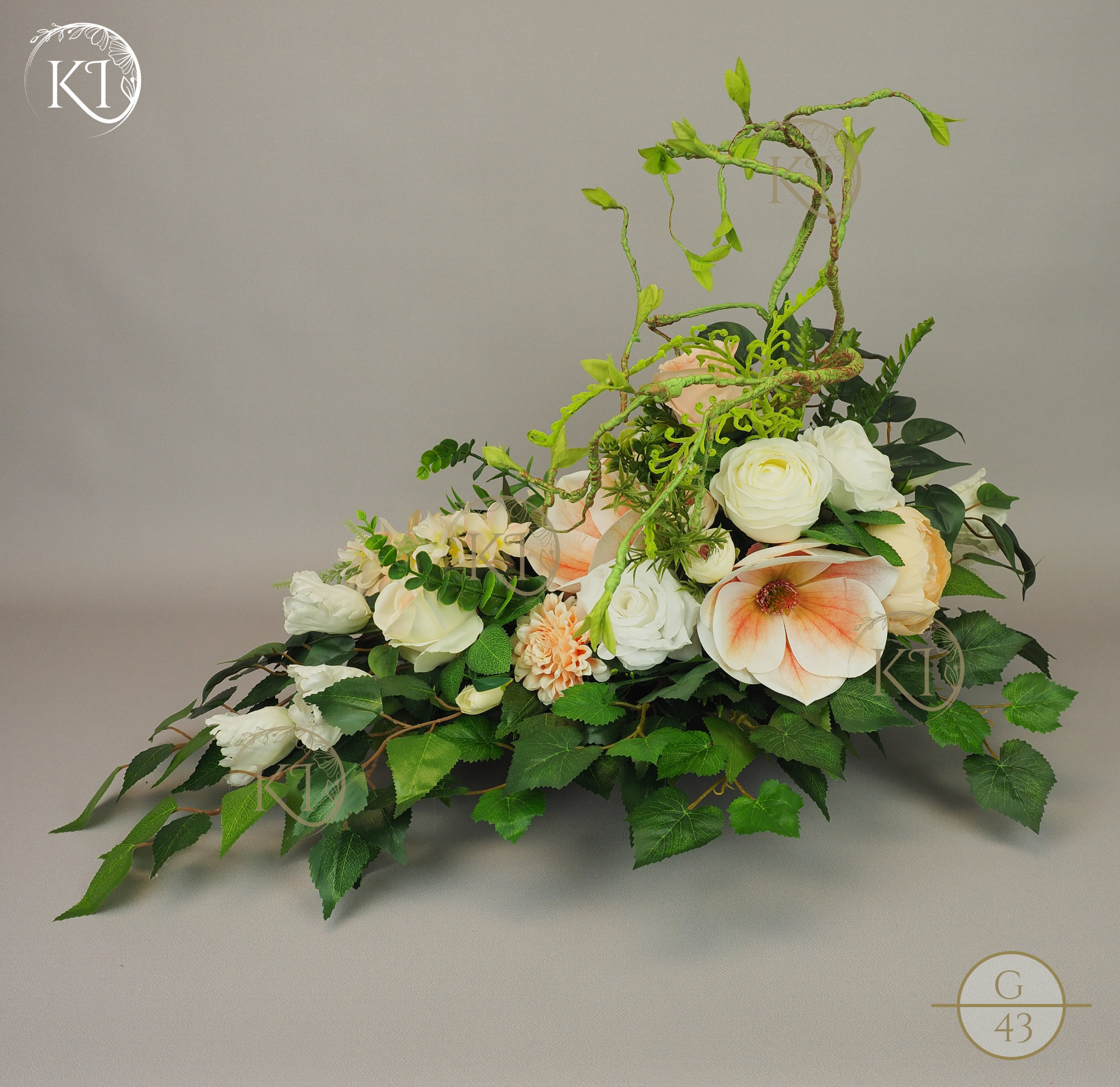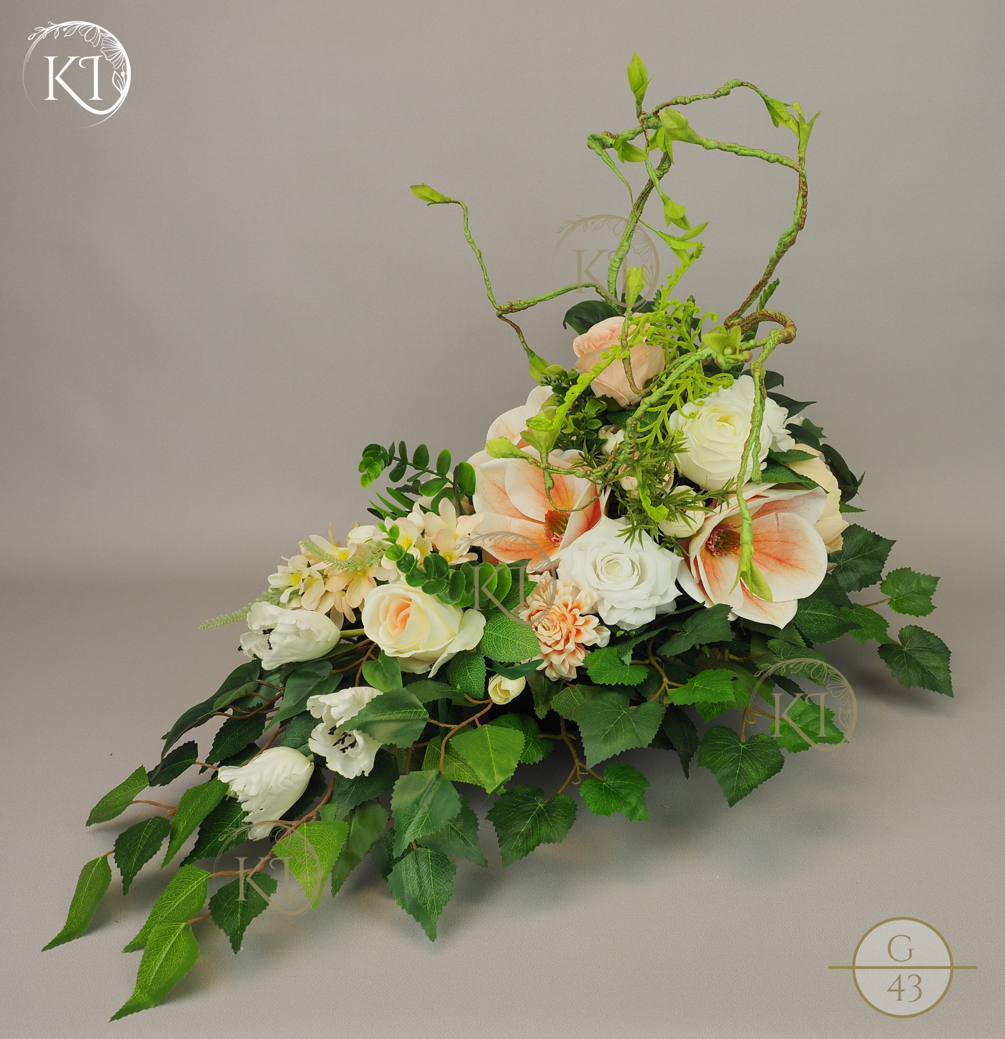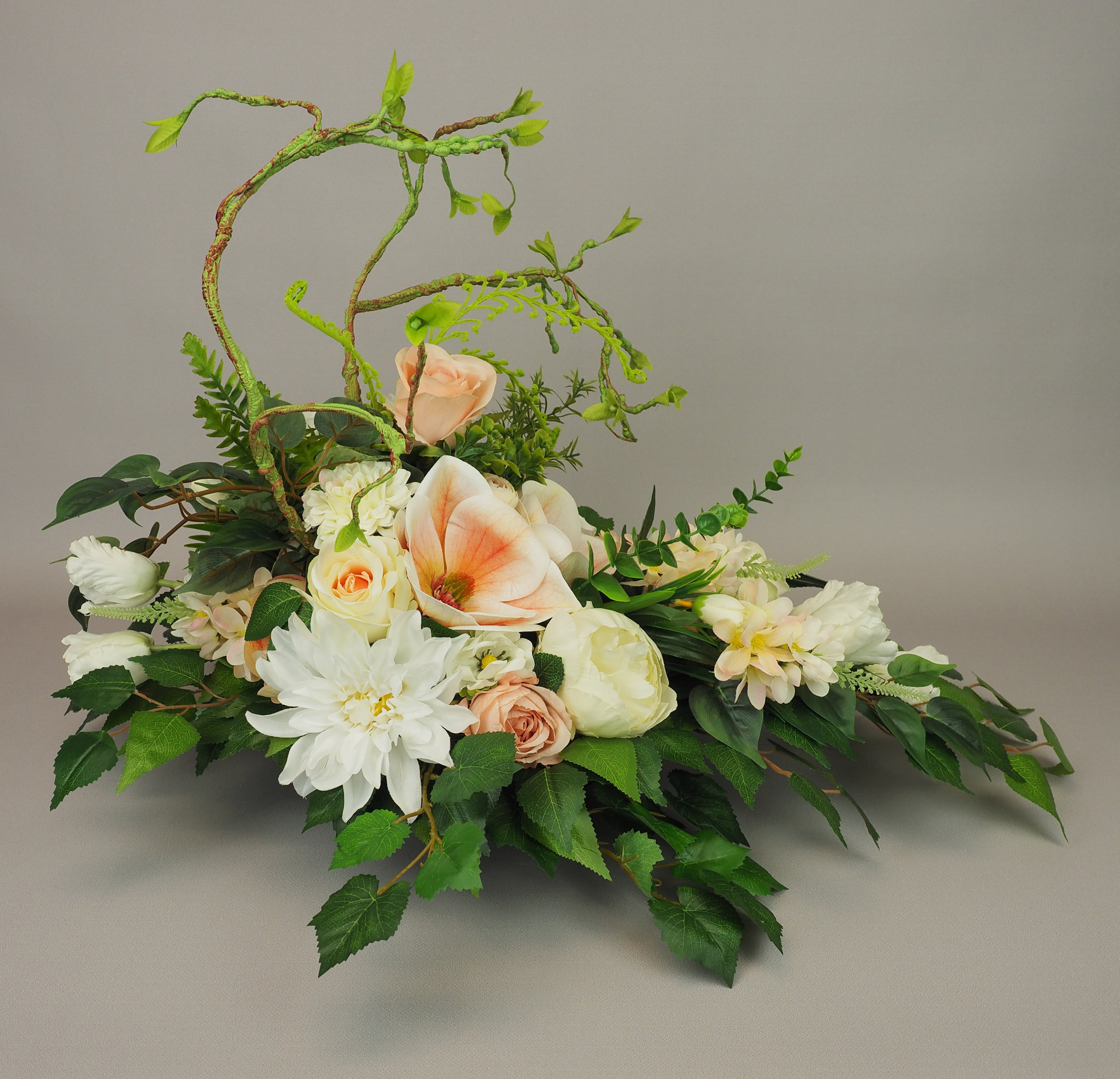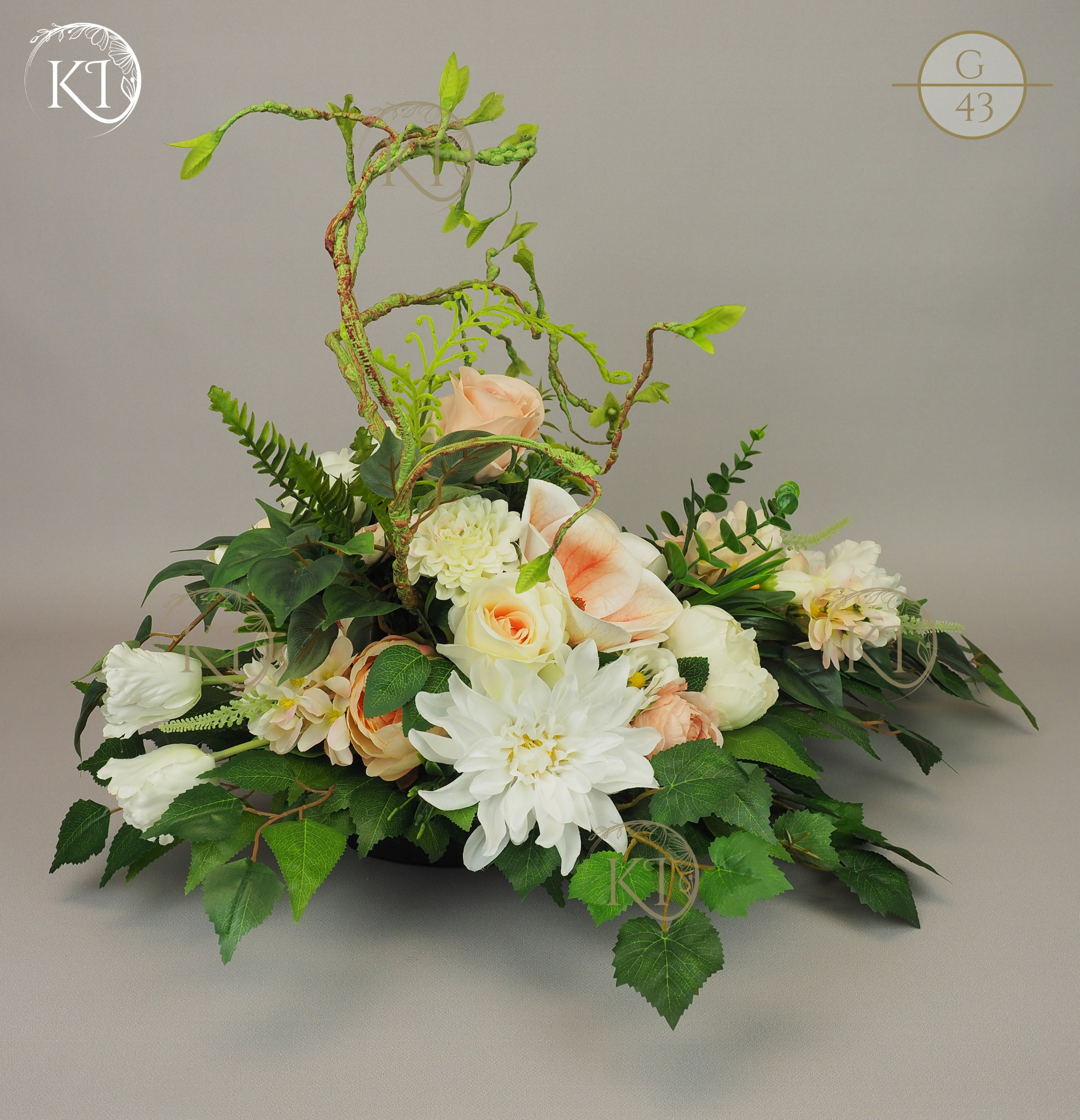 Tradycyjna Dekoracja nagrobna, w formie wiązanki, w obciążonej plastikowej podstawie, wykonana z gałązek i kwiatów sztucznych wysokiej jakości, imitujących rośliny naturalne, co nadaje jej trwałości, wykonana z dbałością o detale, w wiodącej tonacji kolorystycznej biało-morelowej.