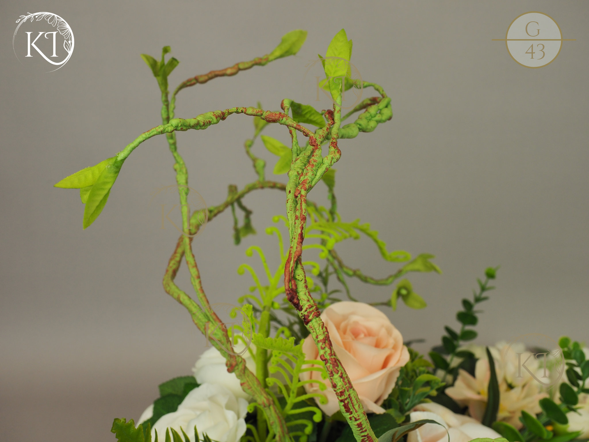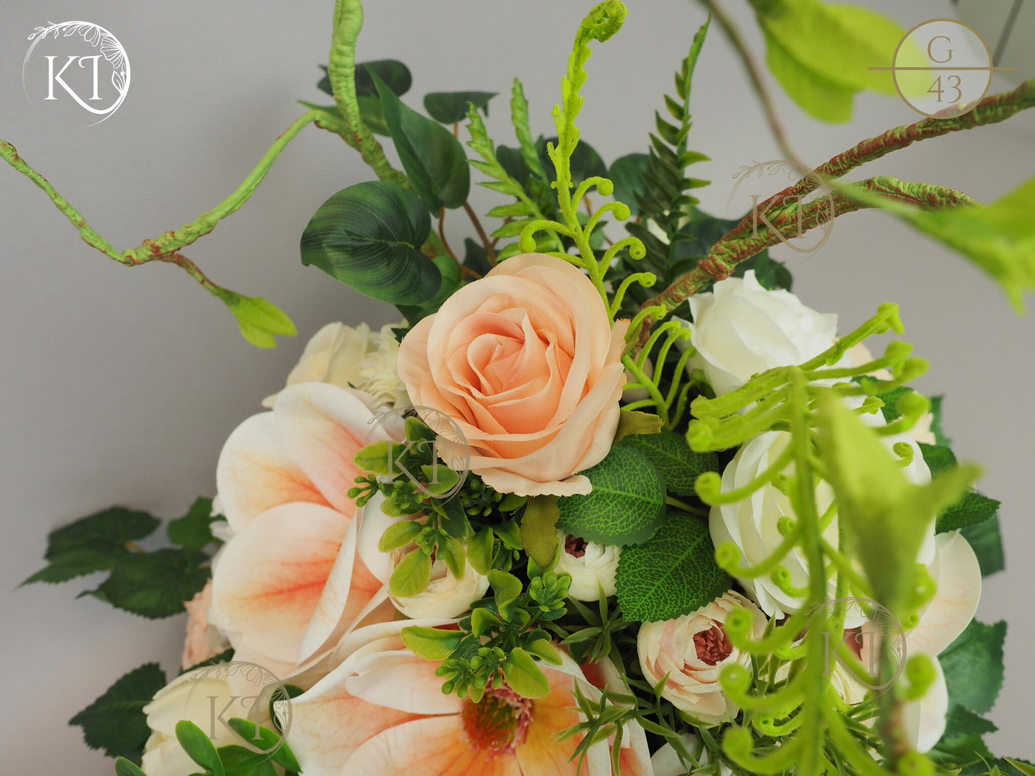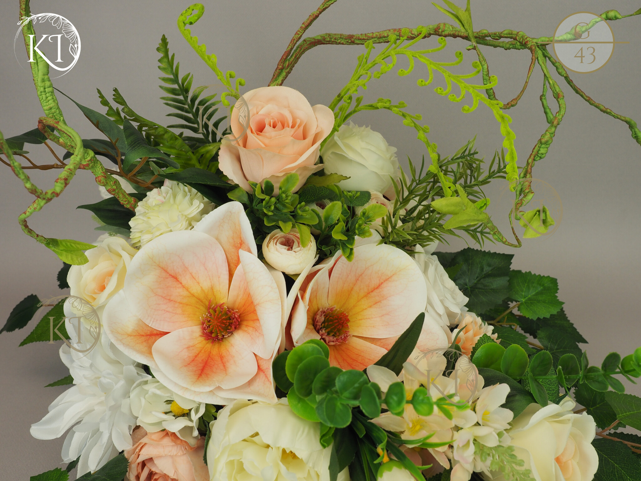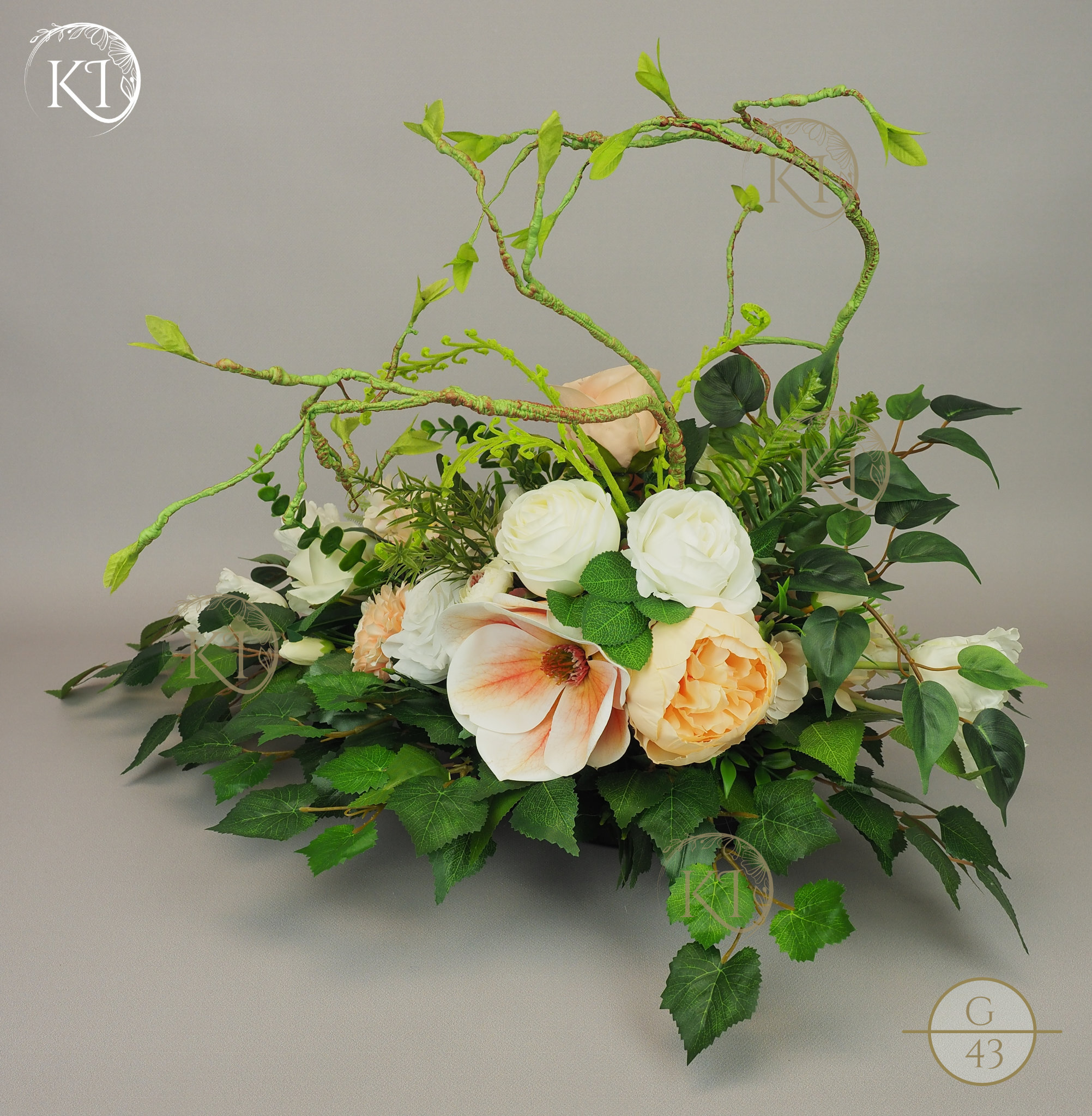 Tradycyjna Dekoracja nagrobna, w formie wiązanki, w obciążonej plastikowej podstawie, wykonana z gałązek i kwiatów sztucznych wysokiej jakości, imitujących rośliny naturalne, co nadaje jej trwałości, wykonana z dbałością o detale, w wiodącej tonacji kolorystycznej biało-morelowej.